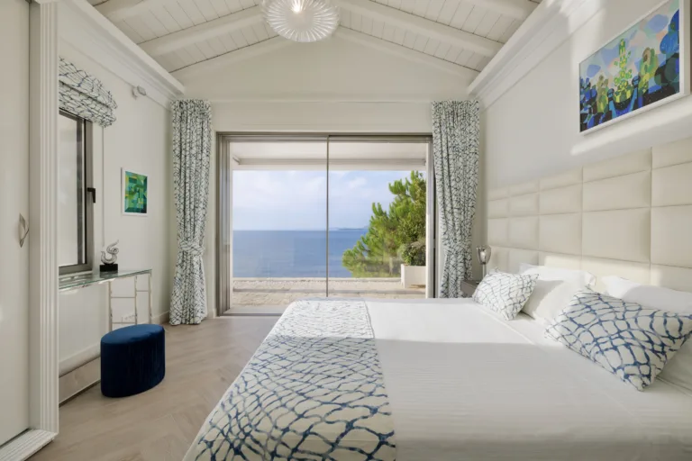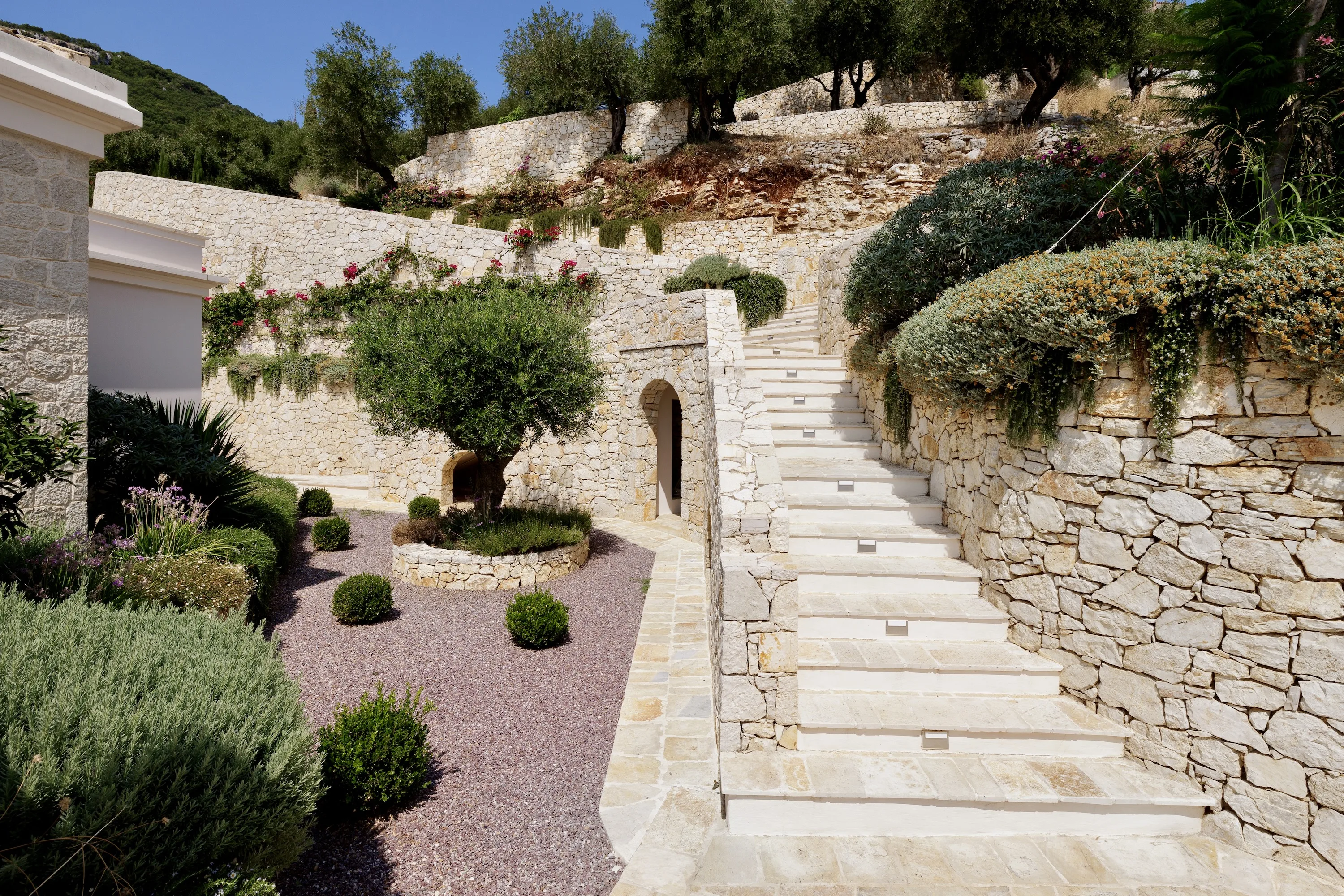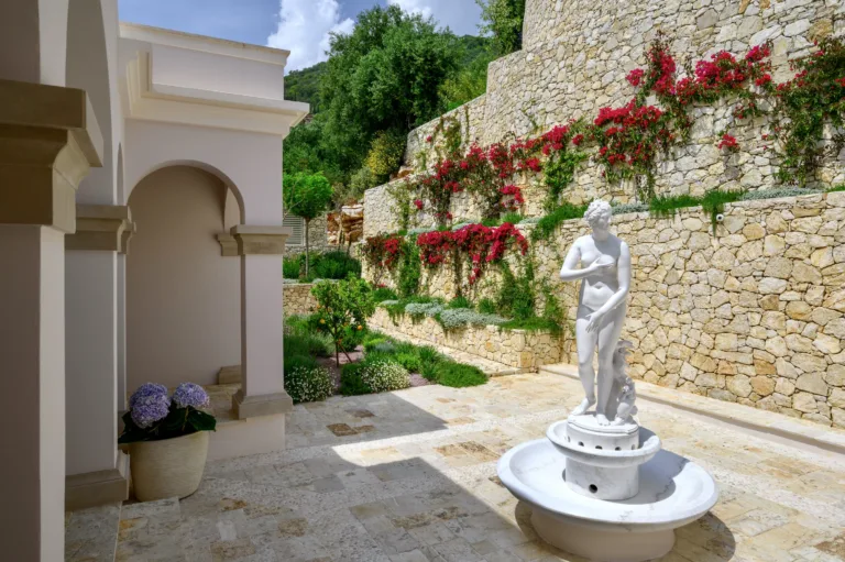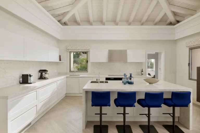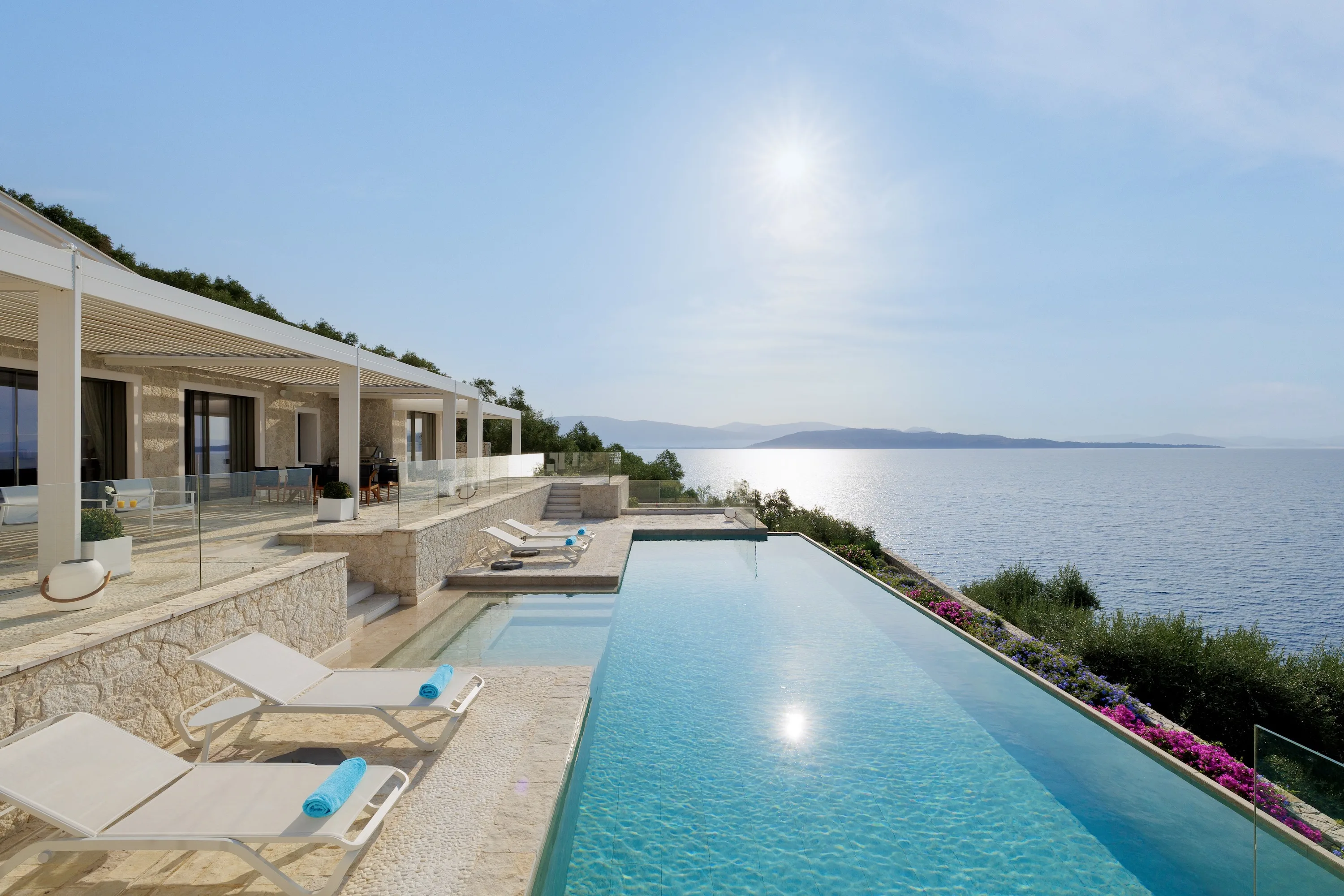 Located in Agni, Ayline is situated just a brief stroll from the picturesque bay and its famous beachfront restaurants. The villa showcases a unique blend of Corfiot and Venetian architectural influences fused with modern aesthetics. Two distinctive features are the windows that amplify the panoramic views and the stone used on the façade and exterior walls, which was sourced directly from the property’s grounds. Each stone was meticulously hand-shaped by a skilled craftsman and fitted together like pieces of an intricate puzzle.