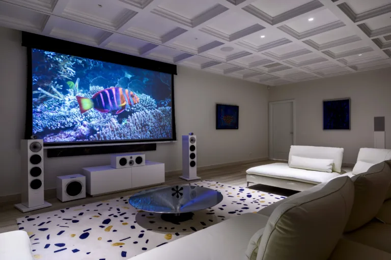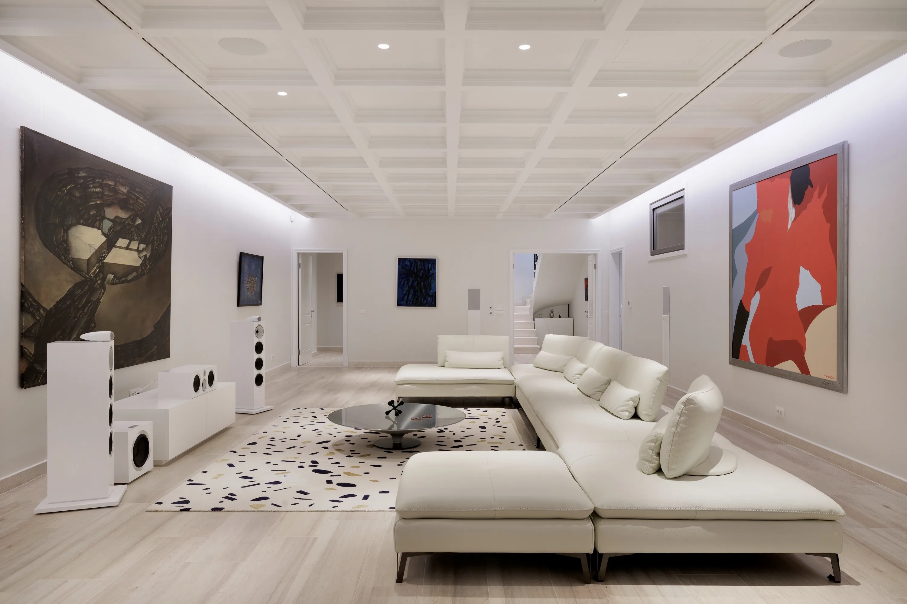 On the lower ground floor, you’ll be captivated by the artistic atmosphere of the dual-purpose space—a dynamic art gallery meticulously designed to replicate a museum ambiance, allowing for the effortless rotation and change of exhibited art. At the push of a button, the room turns into a cutting-edge home cinema featuring state-of-the-art audio-visual systems for a cinematic experience rivaling that of a professional theater.