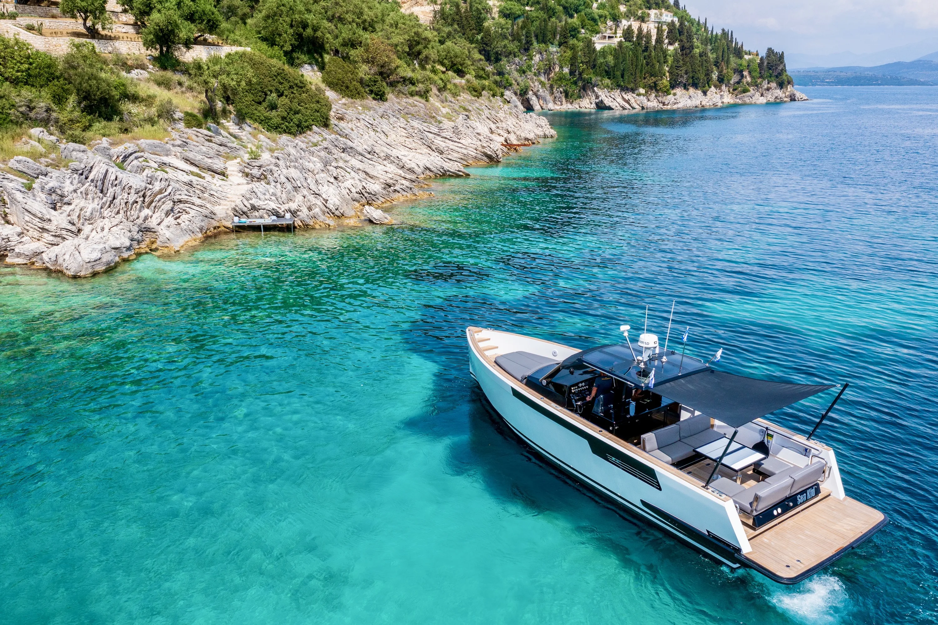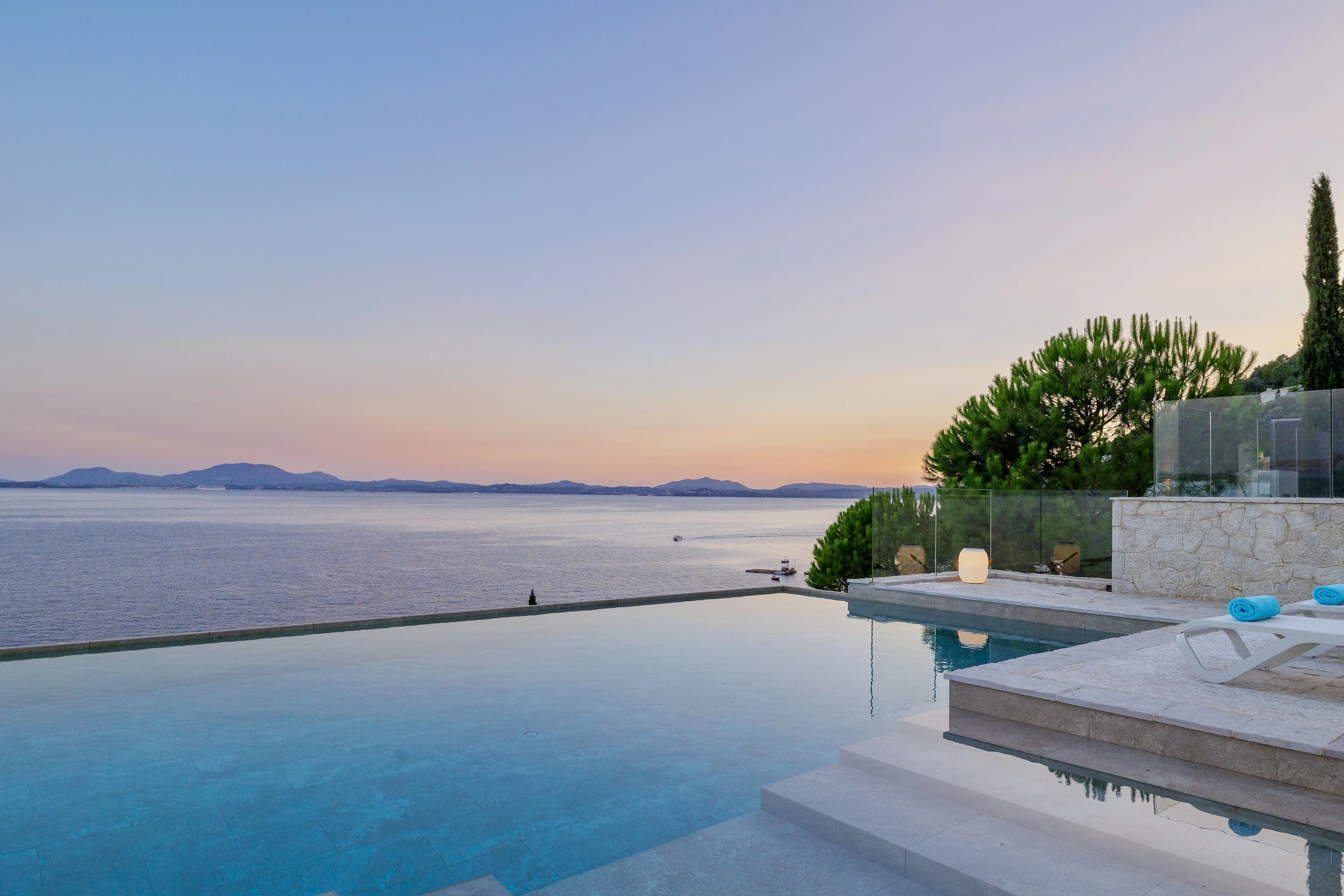The infinity pool, strategically situated, gives the illusion of merging as one with the sea offering a sense of infinite space. Steps from the pool area lead first to a yoga and meditation spot with a panoramic sea view, followed by a waterside deck designed for sunbeds and access to the boat jetty.