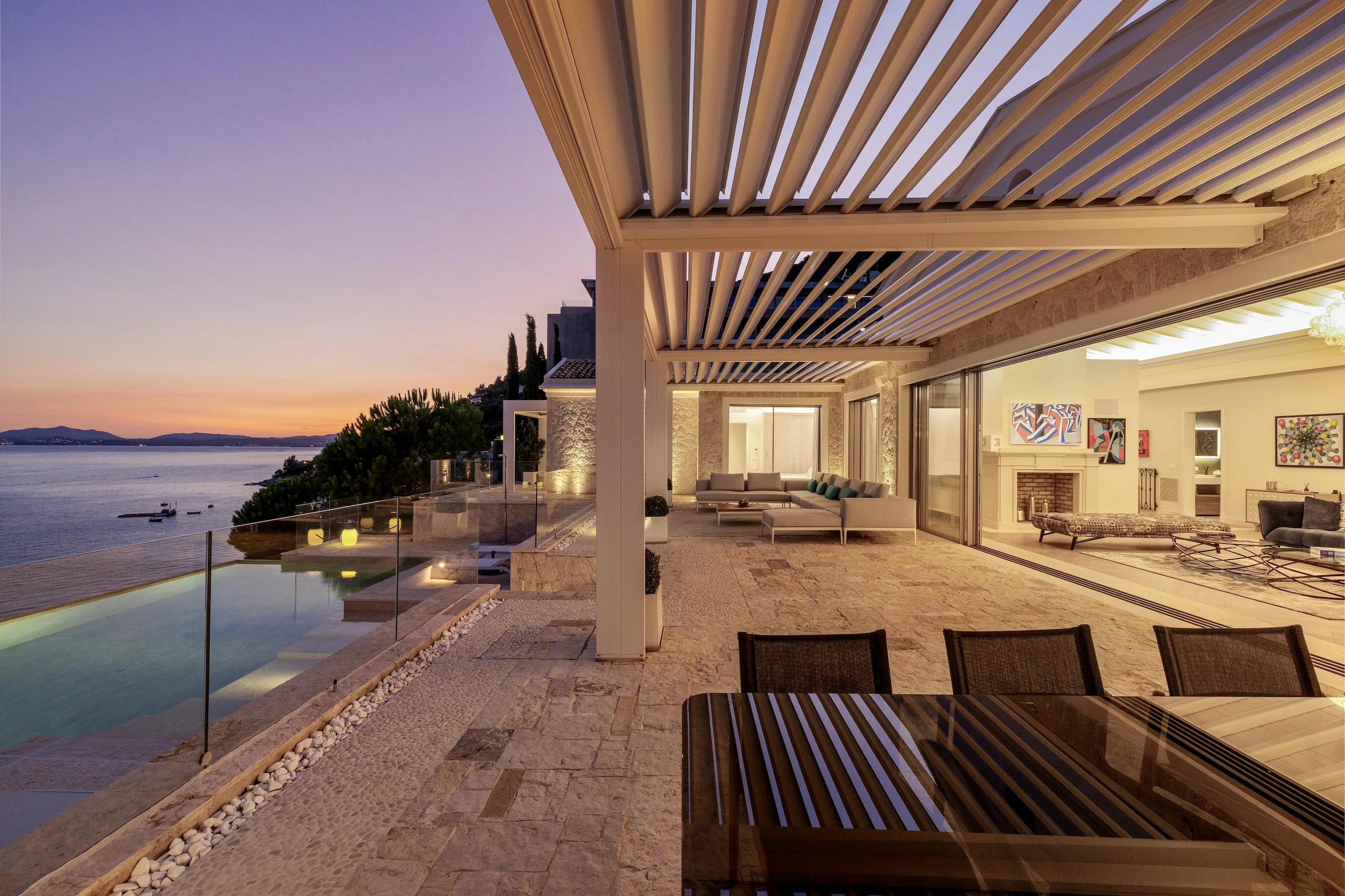 Ayline is surrounded by an expansive Mediterranean garden unveiling a wide variety of flora, including over 50 olive trees and more than 100 diverse species of flowers, shrubs, and trees such as fig, pistachio, pine, pomegranate, jacaranda, lemon, orange, robinia, and kumquat. The abundant stone terracing across the property provides delightful outdoor living spaces. The pool area features 285sqm of terraces, some of which is covered by automatic bioclimatic pergolas. These areas provide an ideal relaxation and open-air dining setting while immersing in the picturesque views.