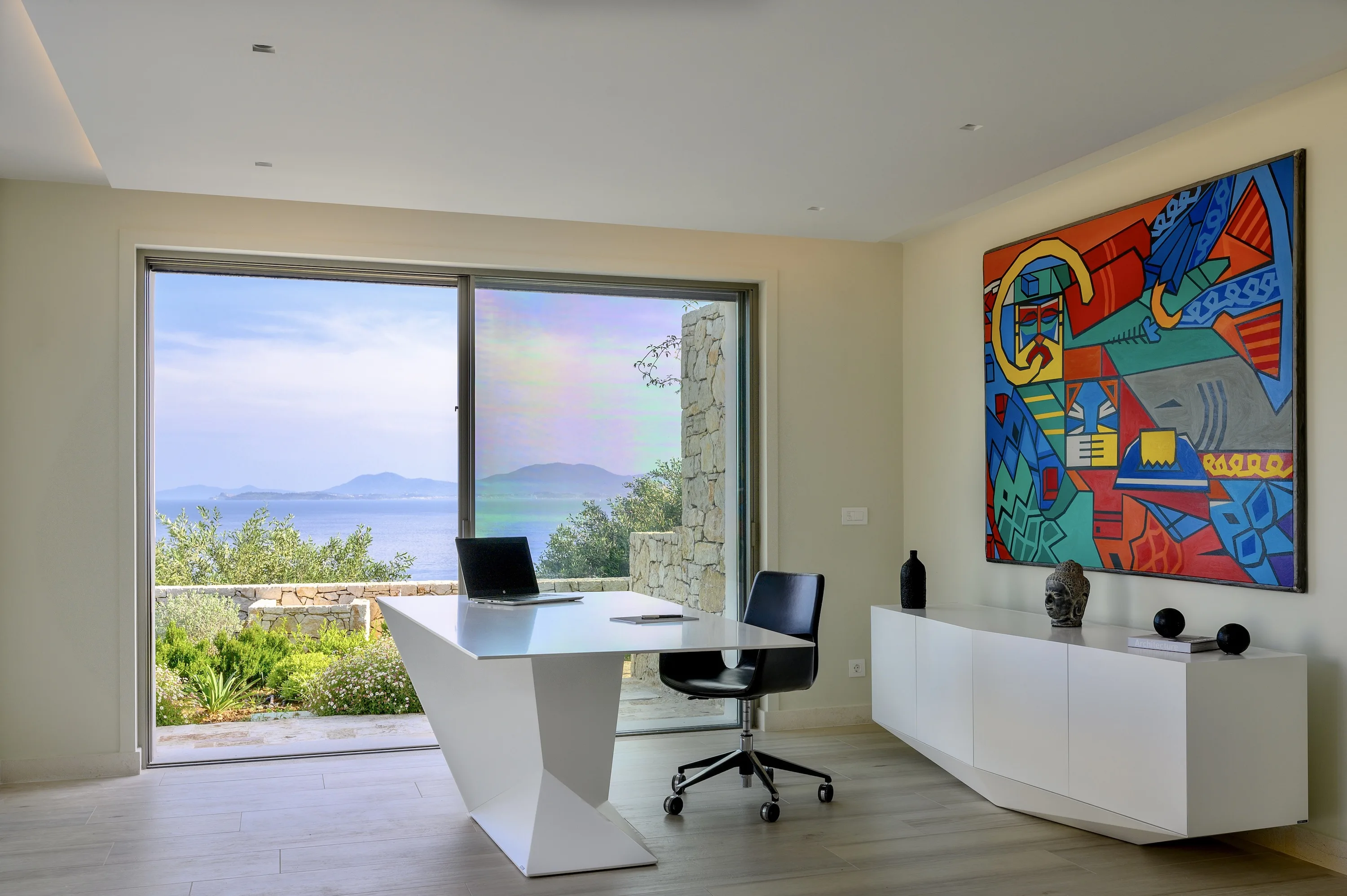 Initially planned for nine bedrooms and seven bathrooms, the property has been modified and currently consists of six exceptionally comfortable and impeccably designed bedrooms. The remaining three rooms have been repurposed to meet various needs. One of the rooms now serves as a spacious office with its own private entrance, offering panoramic views of the surroundings. Another room has been transformed into a gym, with stunning sea vistas and lastly, the third room serves as an additional office or library area.