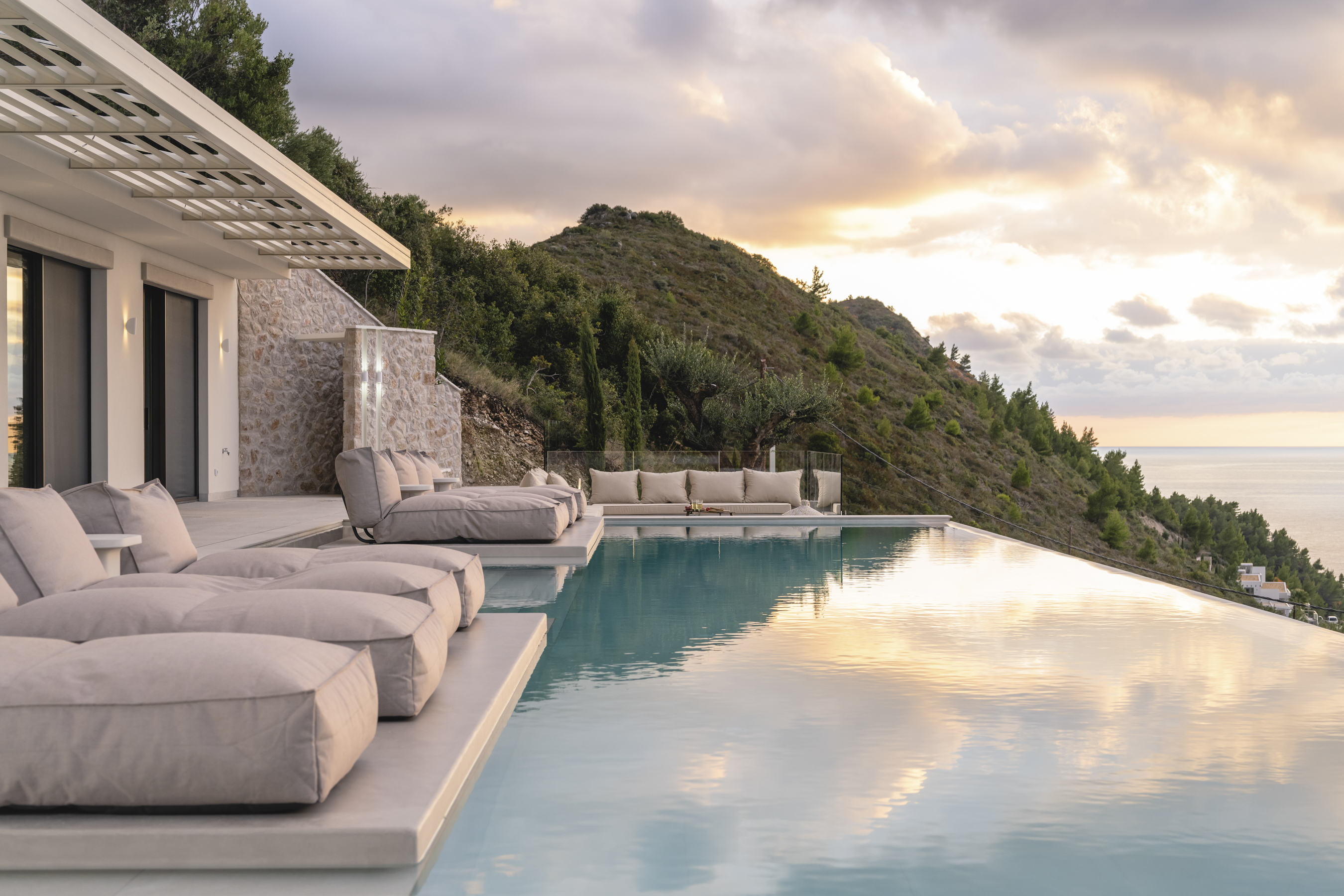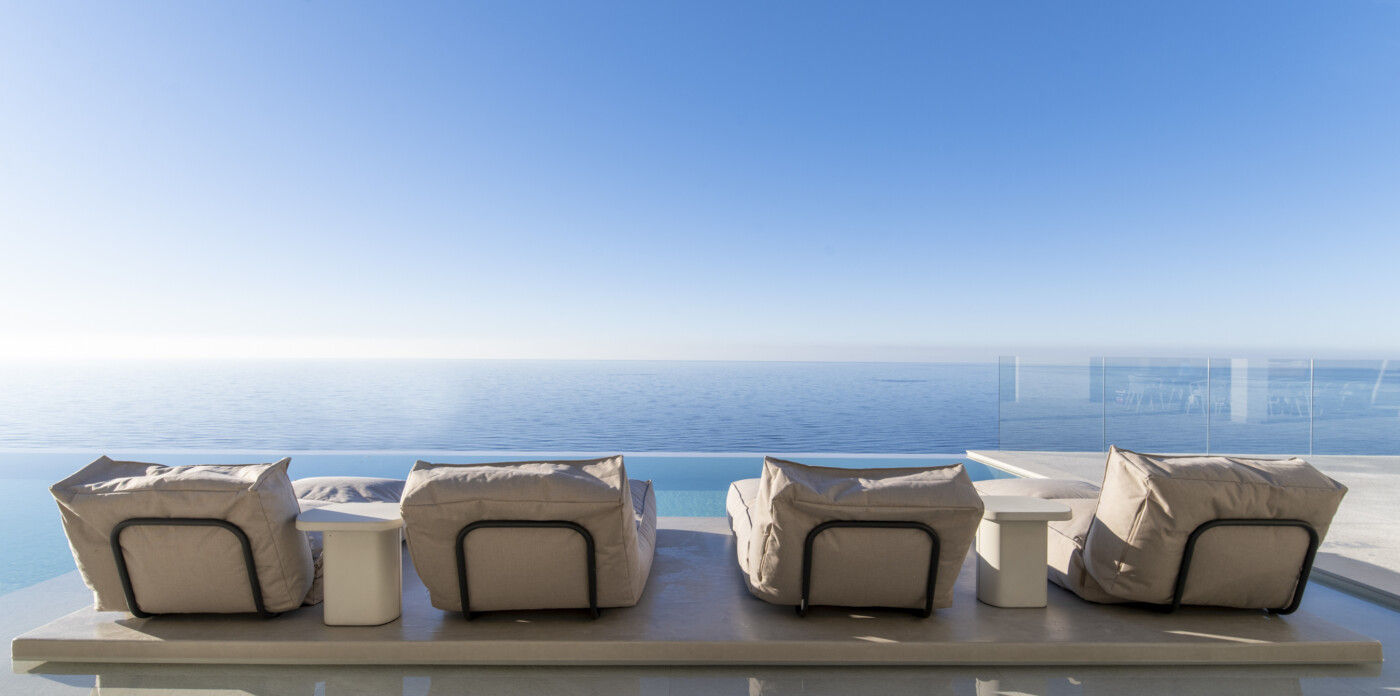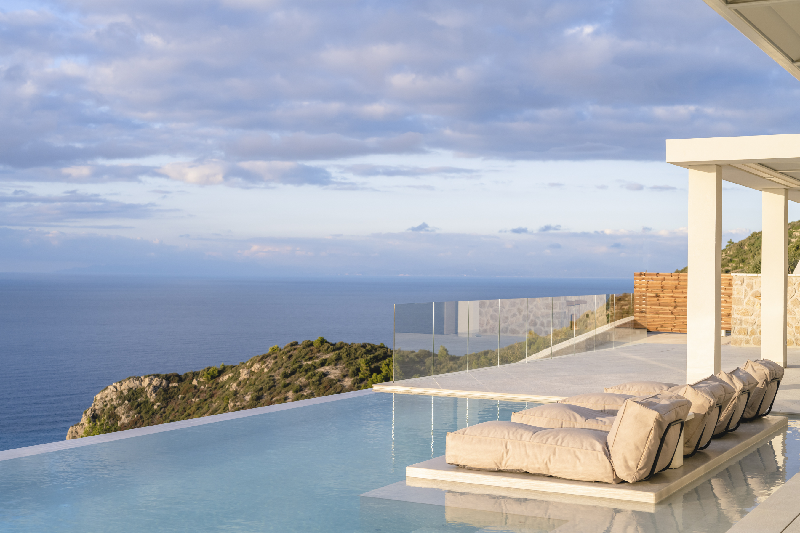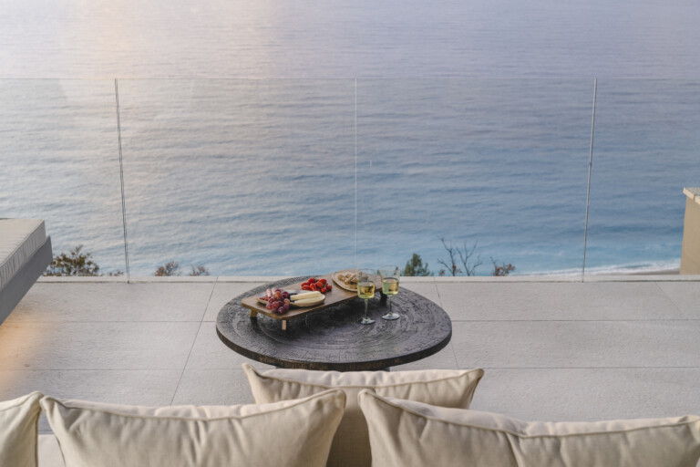 Azurean, located high on the cliffs of Lefkada commands unobstructed panoramic views of the Ionian Sea. Above Kathisma Beach, one of the island’s most beautiful shores, the villa offers a clear view of the turquoise waters extending to the horizon. The sea and sky merge in a seamless blend of blues.