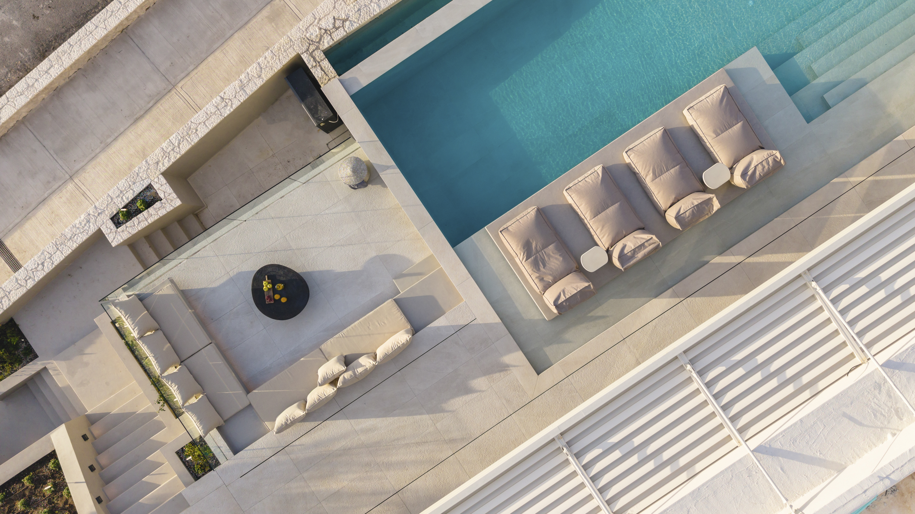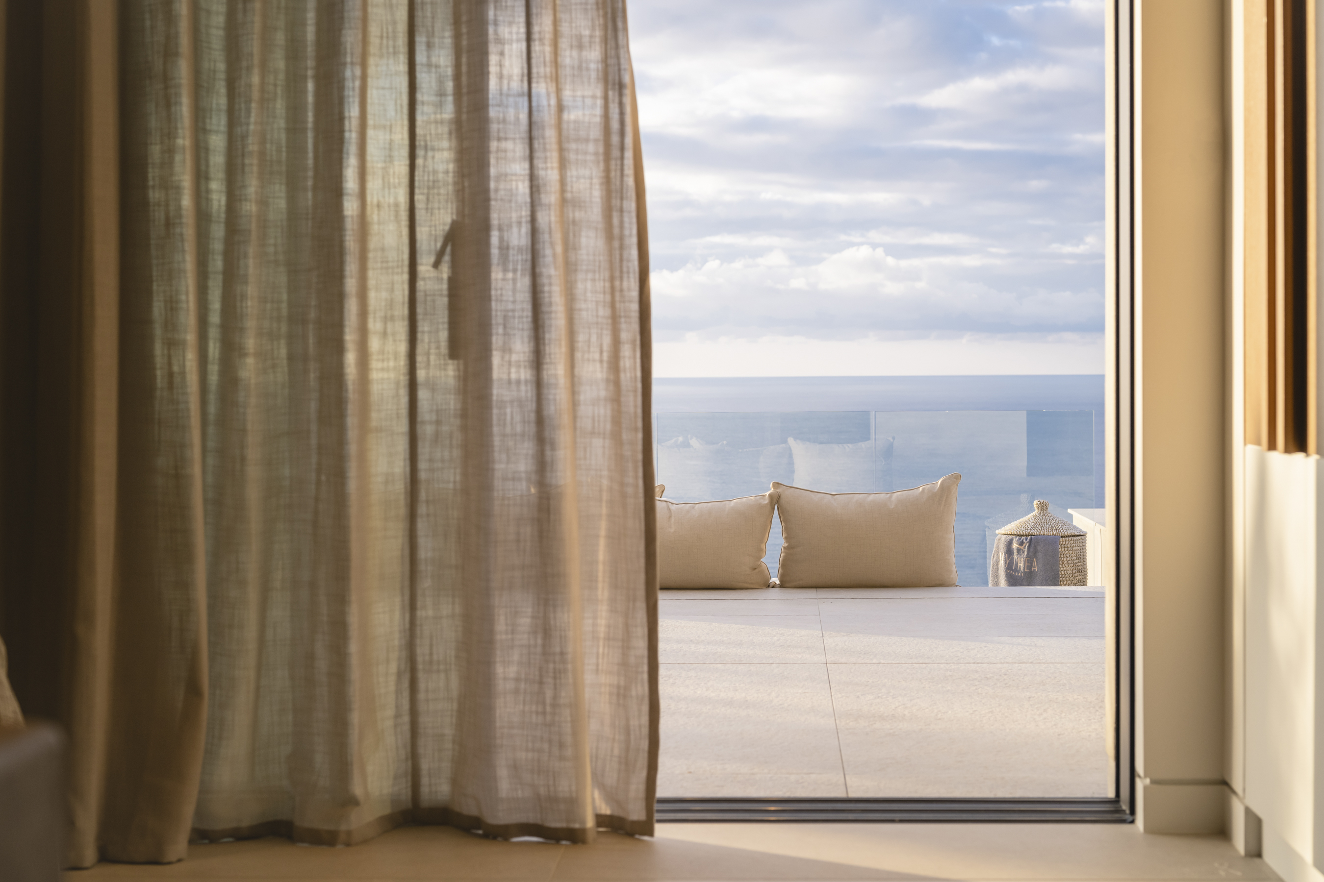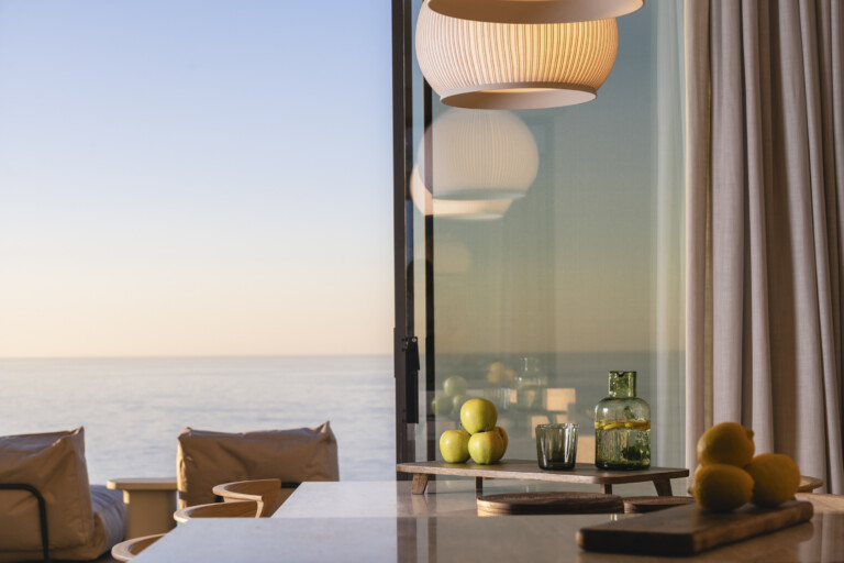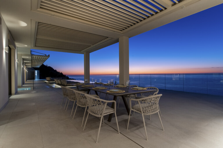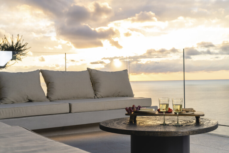 Azurean, located high on the cliffs of Lefkada commands unobstructed panoramic views of the Ionian Sea. Above Kathisma Beach, one of the island’s most beautiful shores, the villa offers a clear view of the turquoise waters extending to the horizon. The sea and sky merge in a seamless blend of blues.