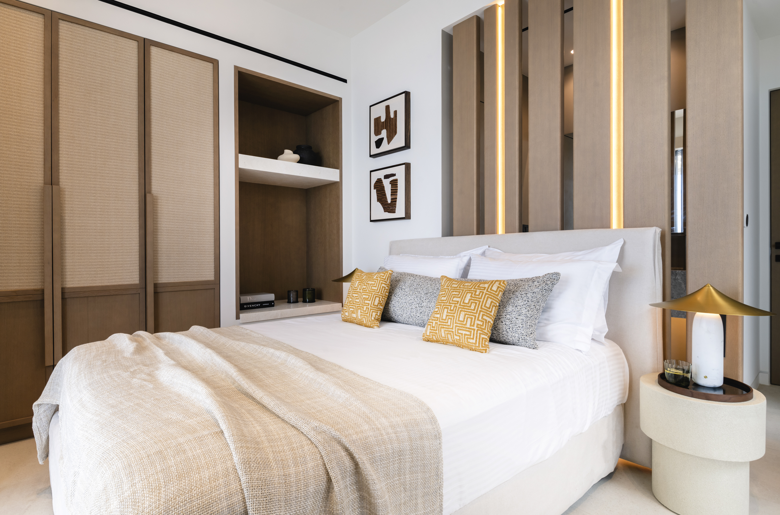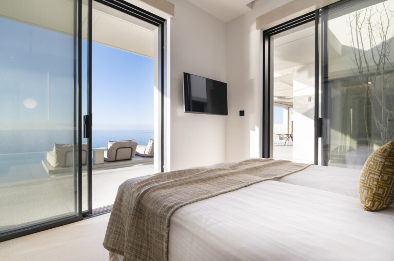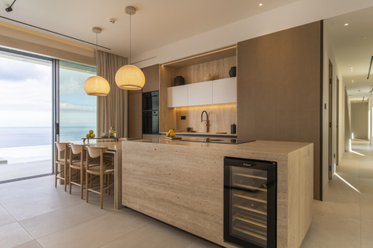 The villa features a sleek, modern kitchen with breathtaking sea views. Four generously sized bedrooms each offer stunning vistas and beautifully designed ensuite bathrooms that exude style.