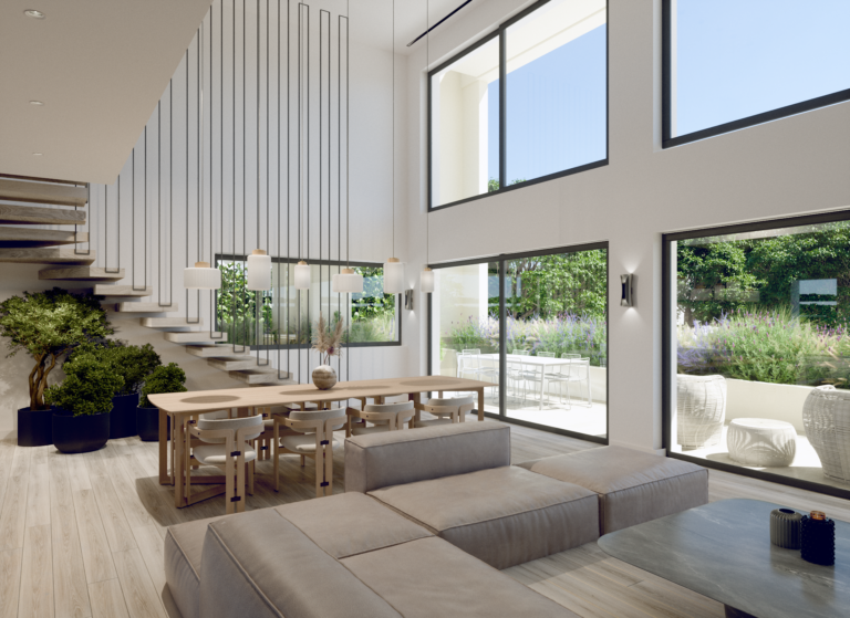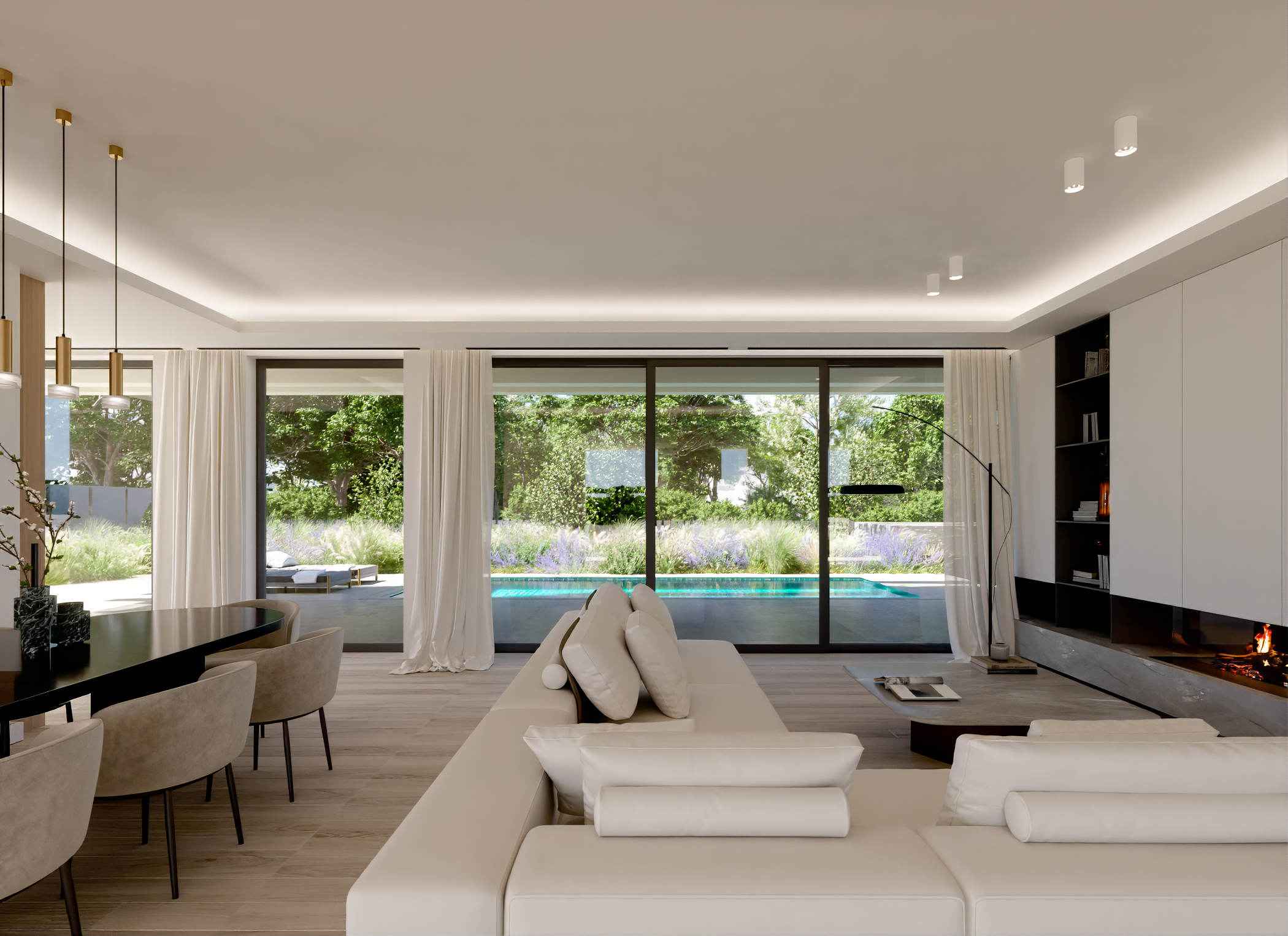 The first floor features a grand living and dining room area with double-height ceilings that create a sense of space and light, and large windows that frame picturesque views of the landscaped surroundings.