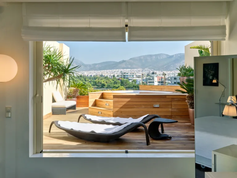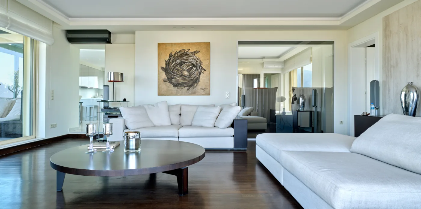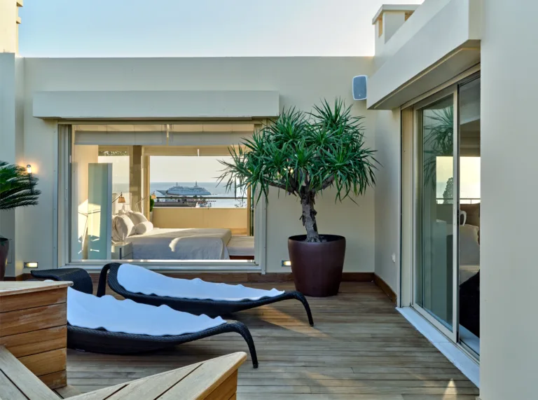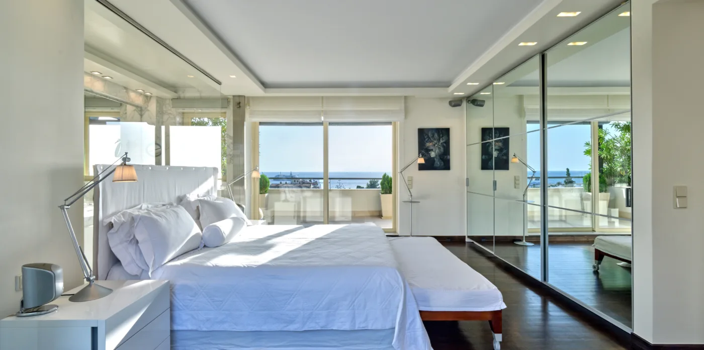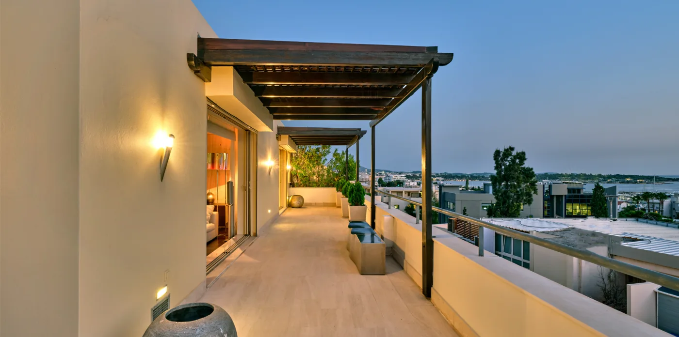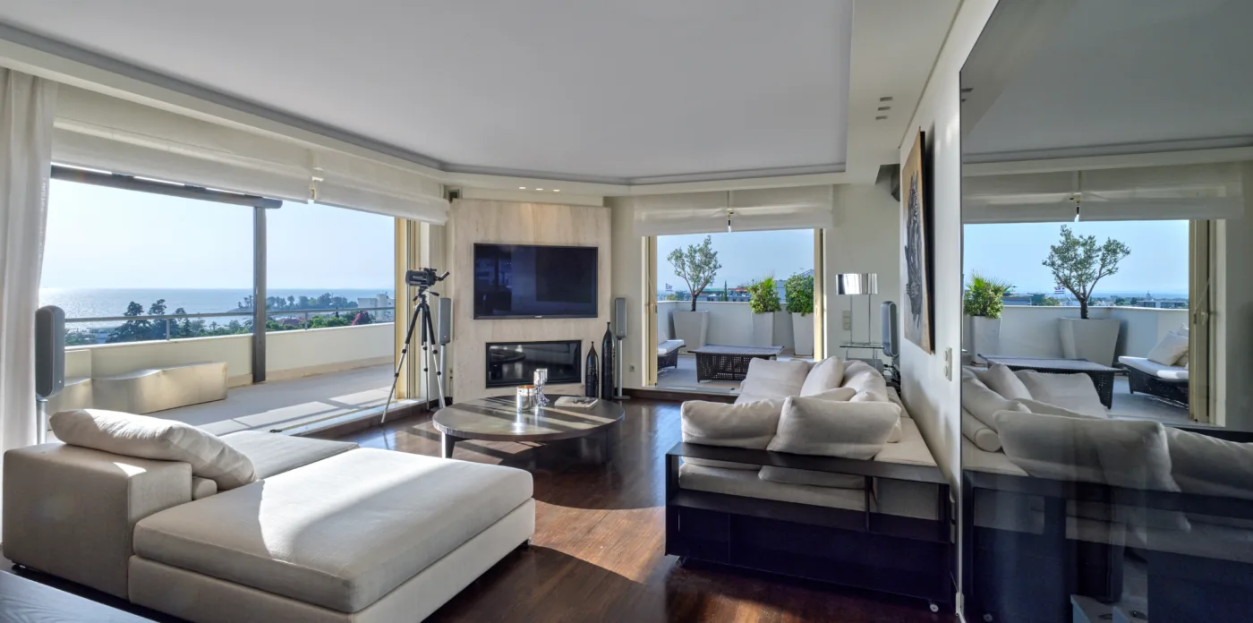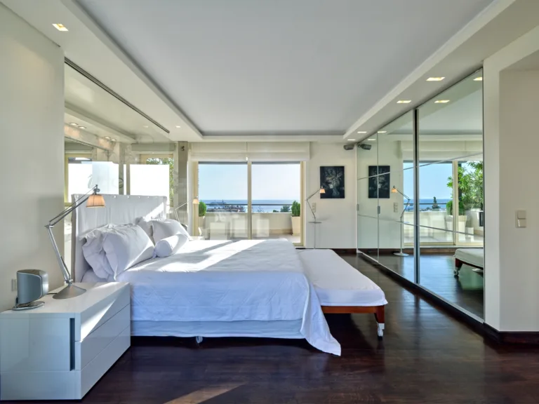 The unique penthouse is optimally located in the well-sought-after suburb of Glyfada, on the Athens Riviera, where a collection of fine dining restaurants, designer boutiques, and high-end marinas reside. Glyfada is internationally known as one of the most captivating resort towns in all of Greece, thanks to its golden coastlines, calm waters, and fashionable beach bars.