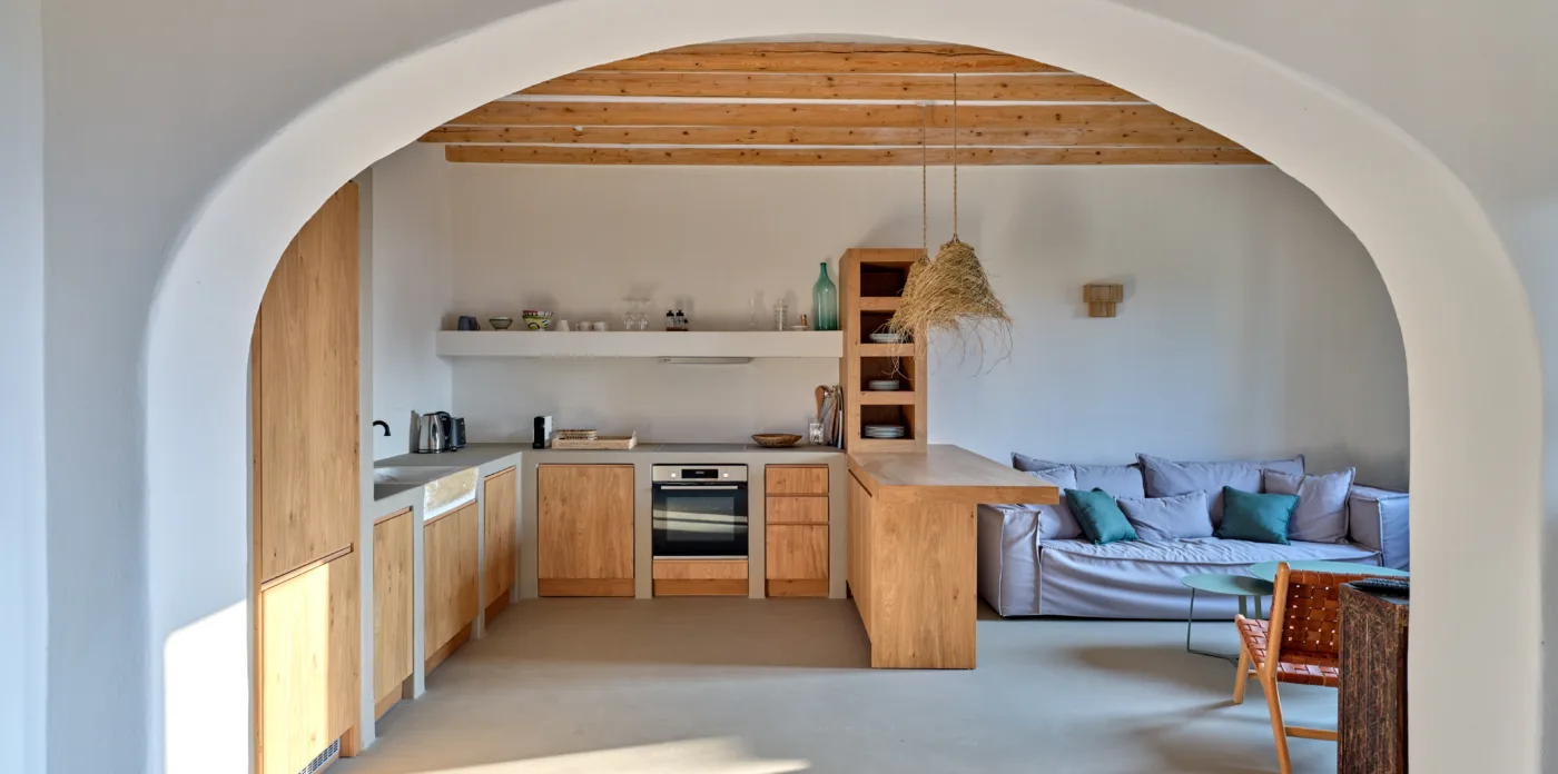 The guest house showcases the same impeccable design and attention to detail as the main villa. Guests will find a cosy living room, a spacious traditional kitchenette, and an en-suite, well-appointed bedroom. Its charming ambiance extends outdoors, as the terrace lets you relish in moments of solitude, basking in the island’s natural beauty.