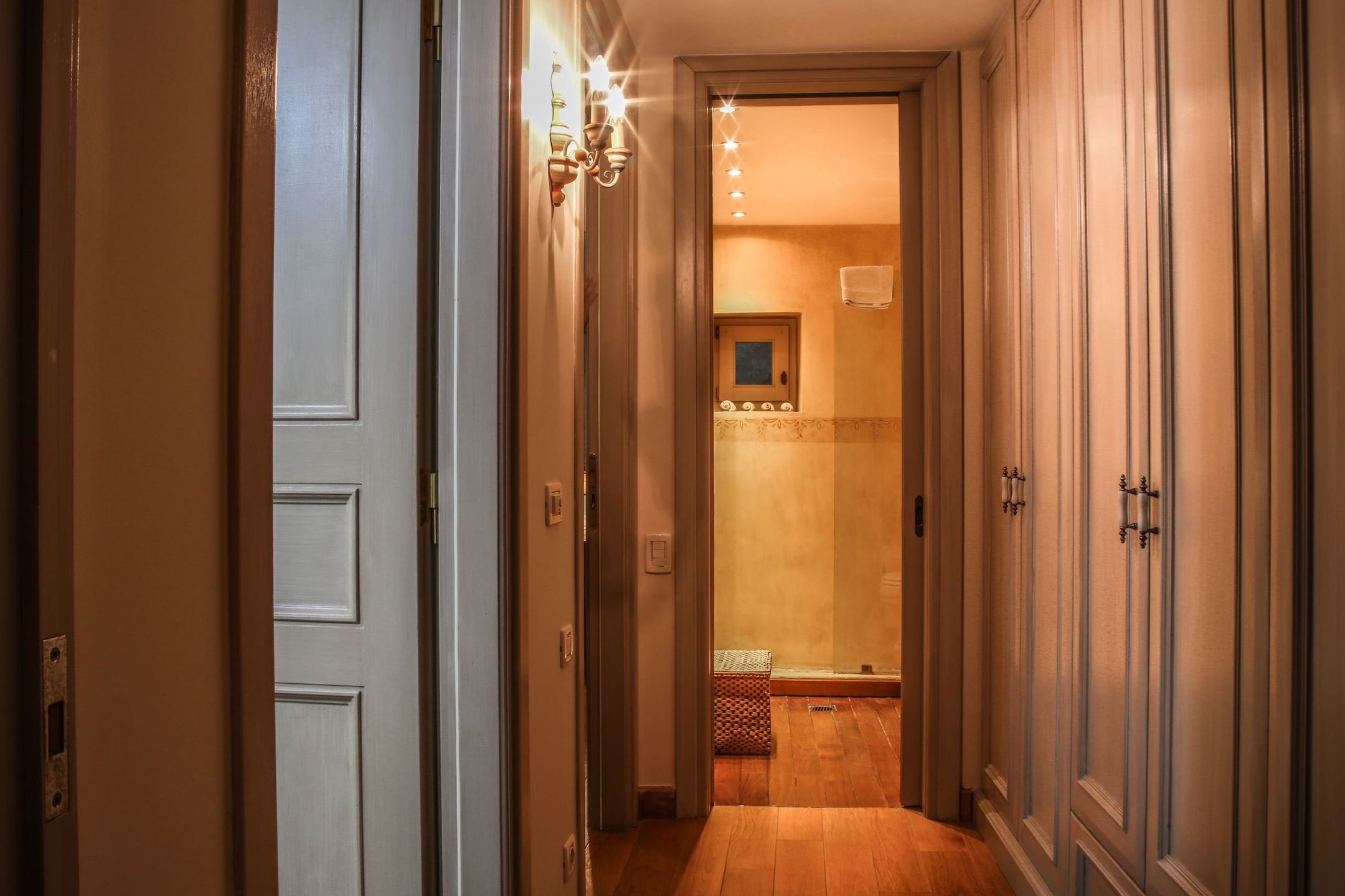 On the lower floor there is a home-office, auxiliary laundry room and additional storage spaces, as well as two large bedrooms with en-suites and private balconies with garden views.
