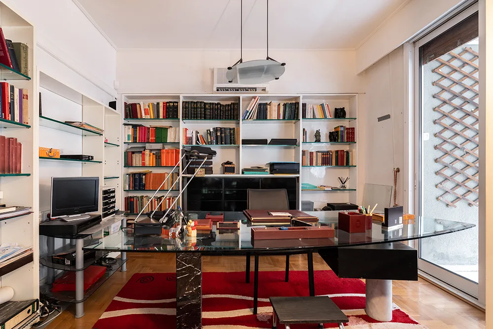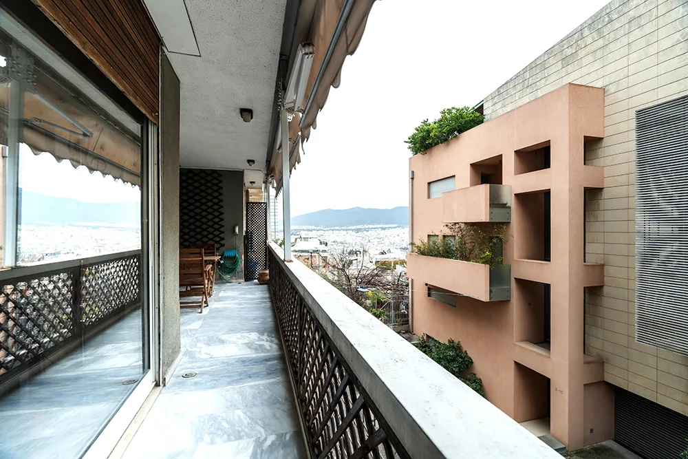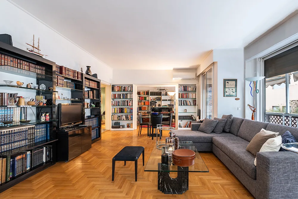 Step inside to find a spacious living room with wooden floors and ample natural light, perfect for entertaining or quiet relaxation. An adjoining office area offers practical elegance, while a balcony offers views of Lycabettus Hill.