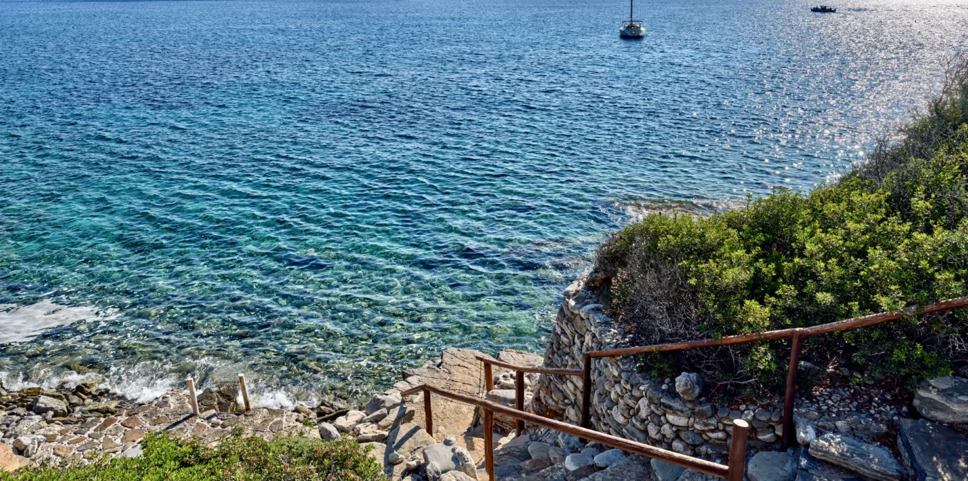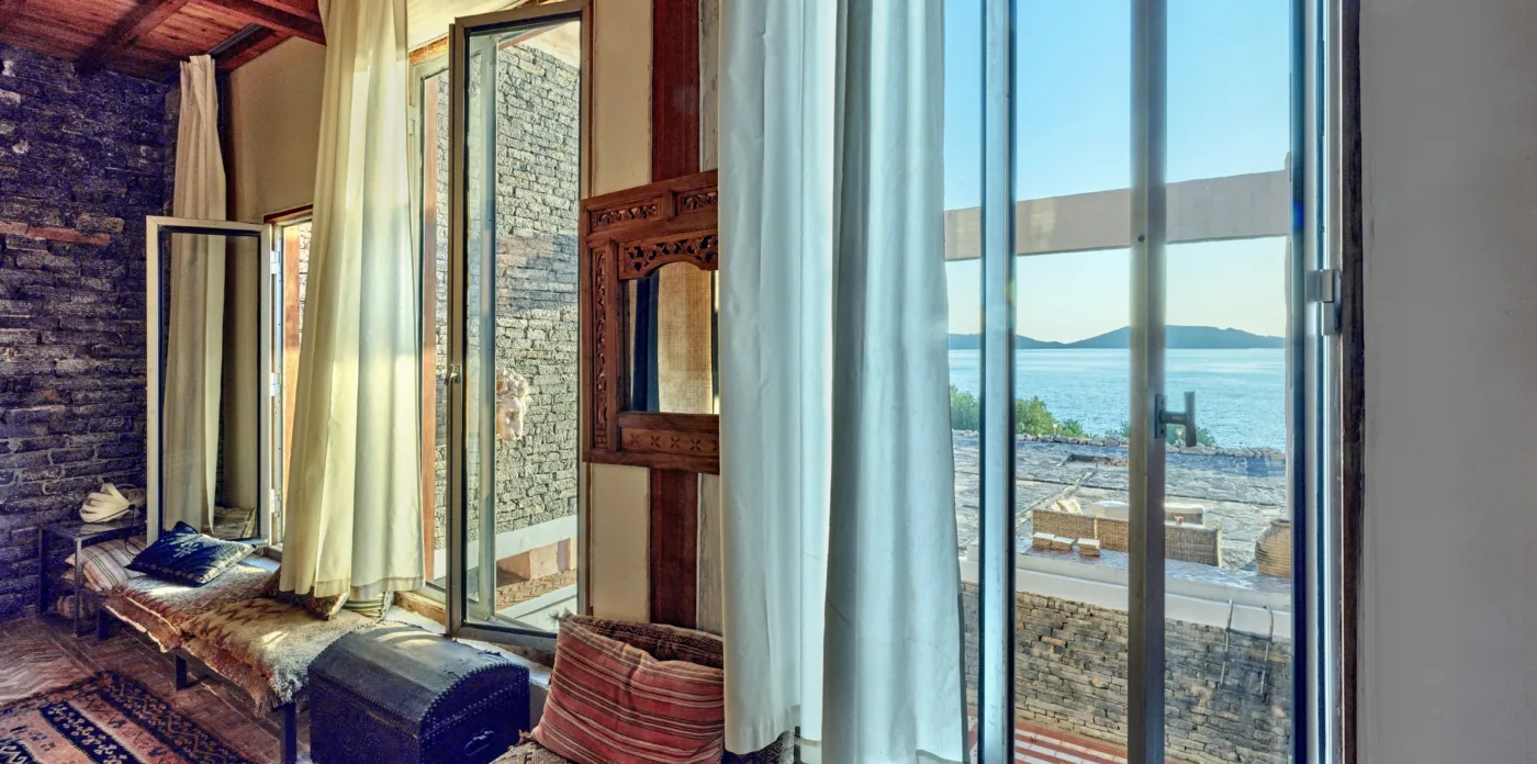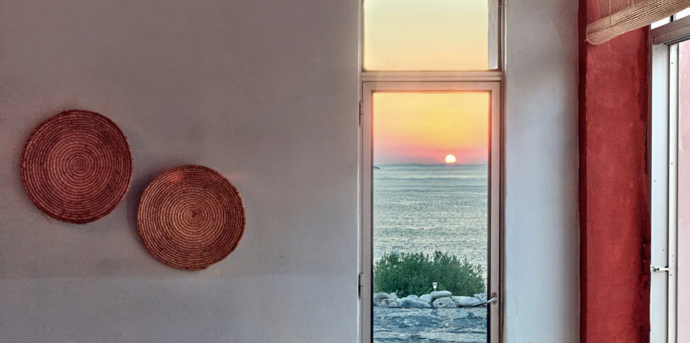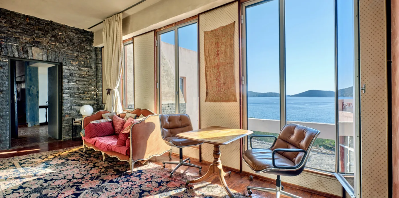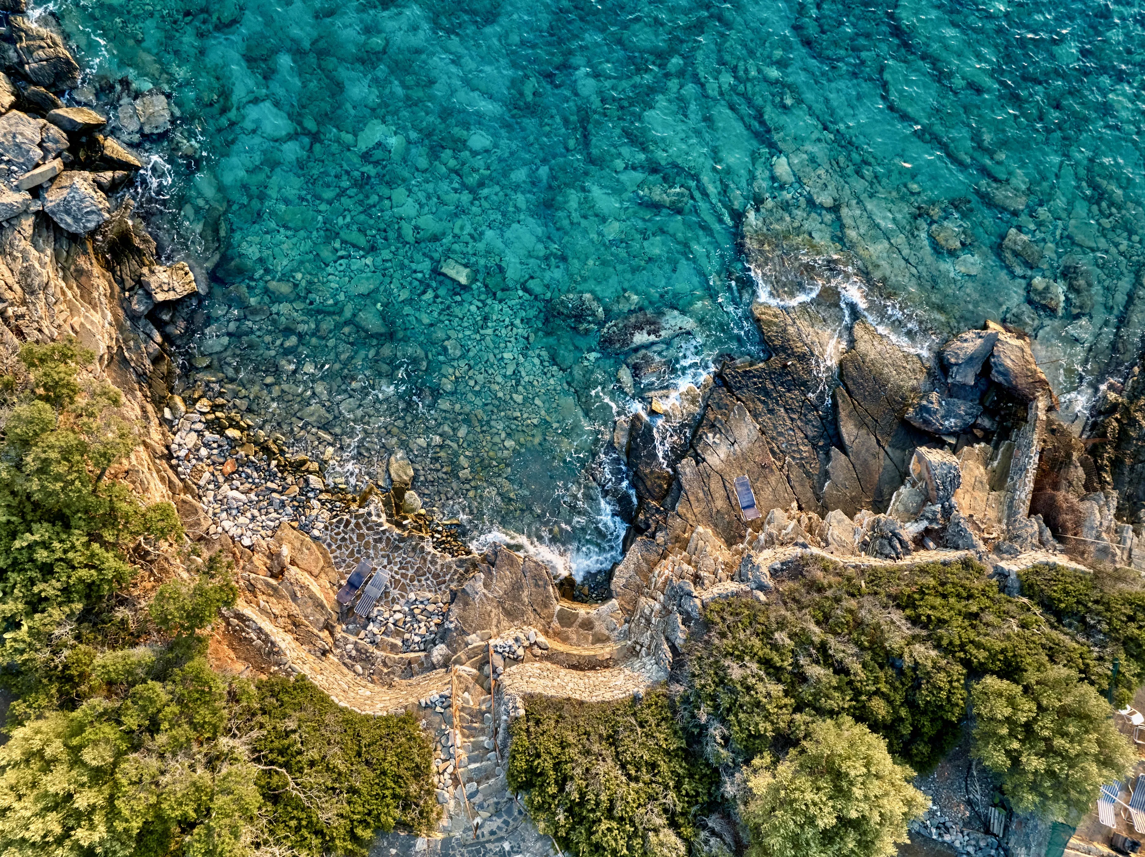 Outside, a large paved terrace looks out over the sea, just 30 meters away from a privately accessible beachfront retreat amidst the rocks.