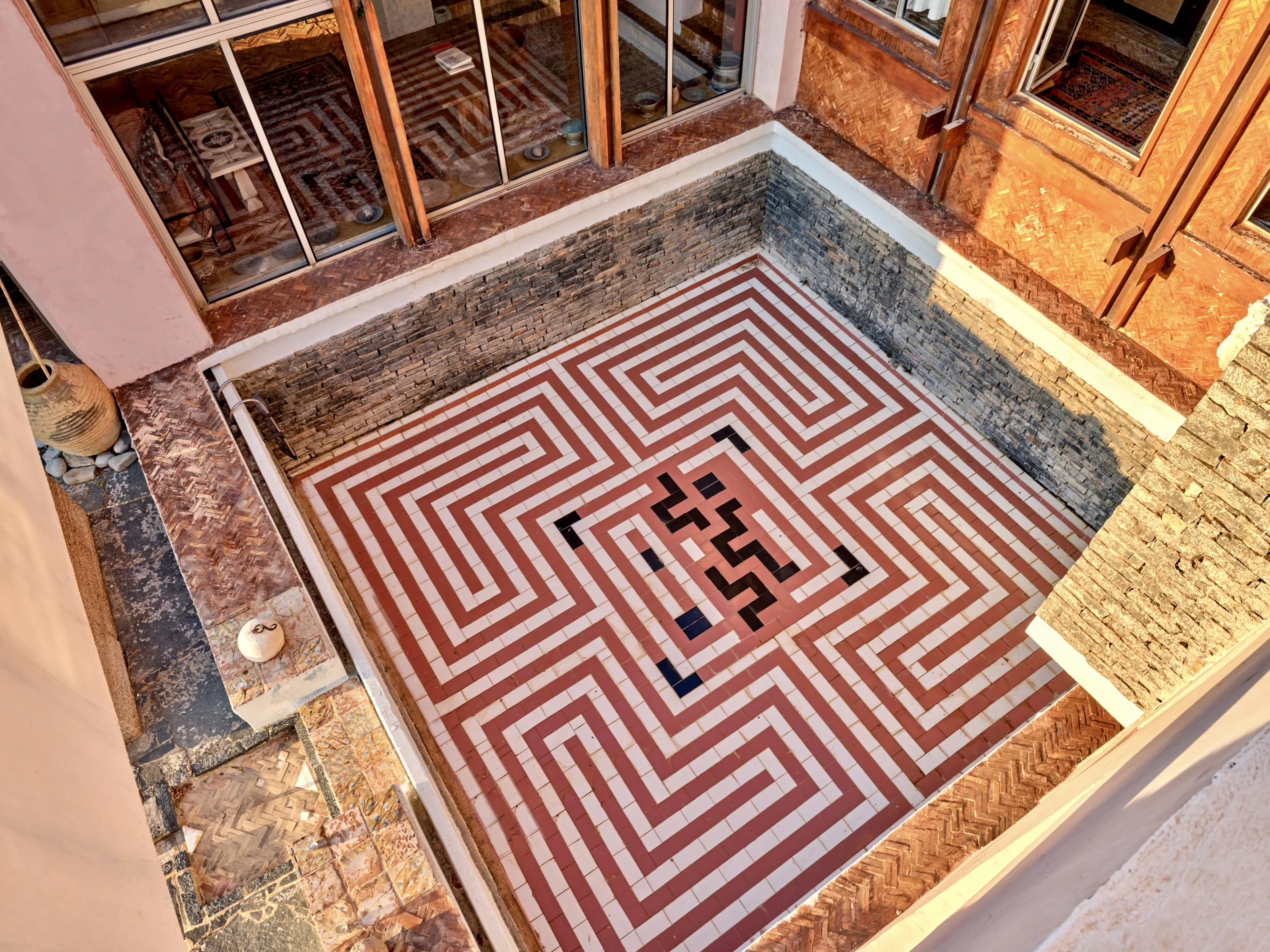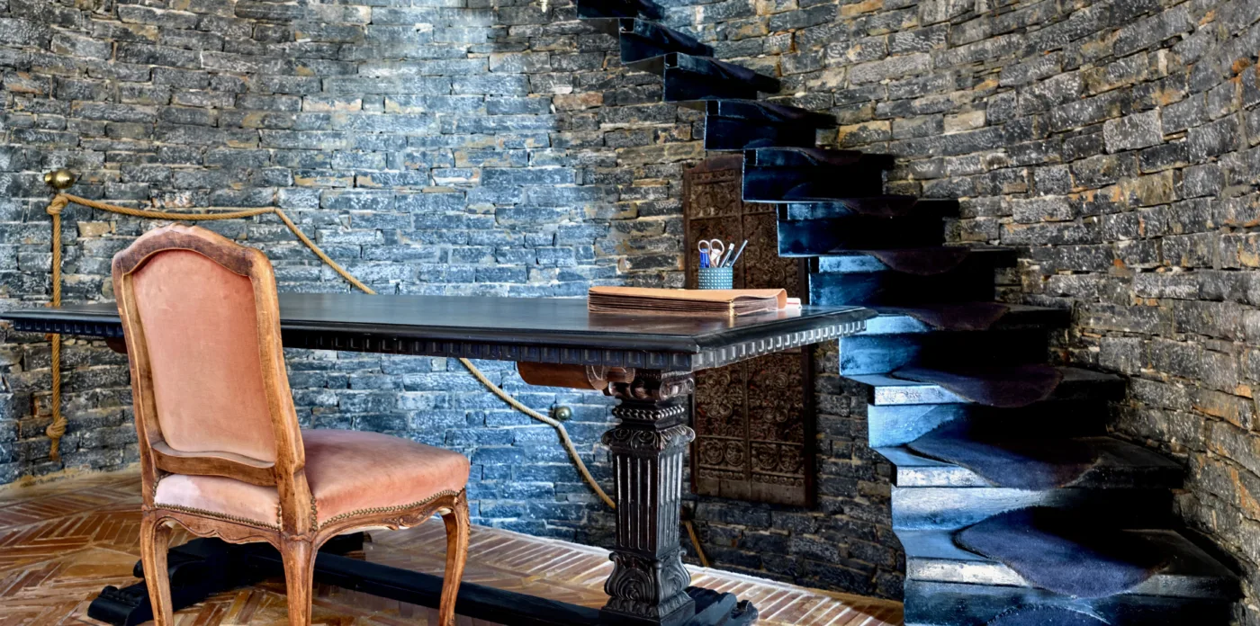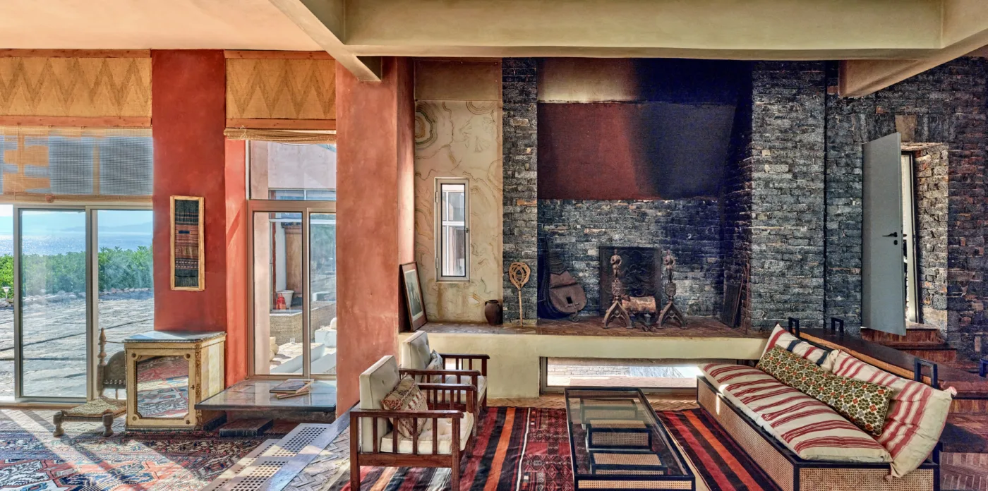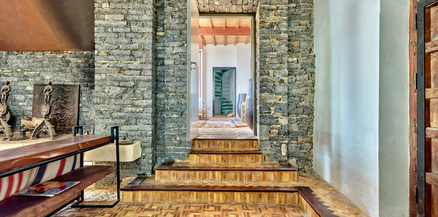 Descend the indoor teak staircase to the lower floor, where equally breathtaking views greet you. The main level features an expansive living room with a welcoming fireplace and a wooden library, all surrounding the central fountain. Next to it is a three-level section comprising six bedrooms and three bathrooms, all linked to the main level by the same staircase. Directly beside the main entrance level mentioned above, you’ll find the master bedroom with its private bathroom, a massage area, and a semicircular stone staircase that leads to the rock garden.
