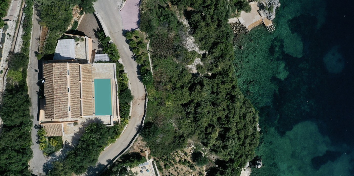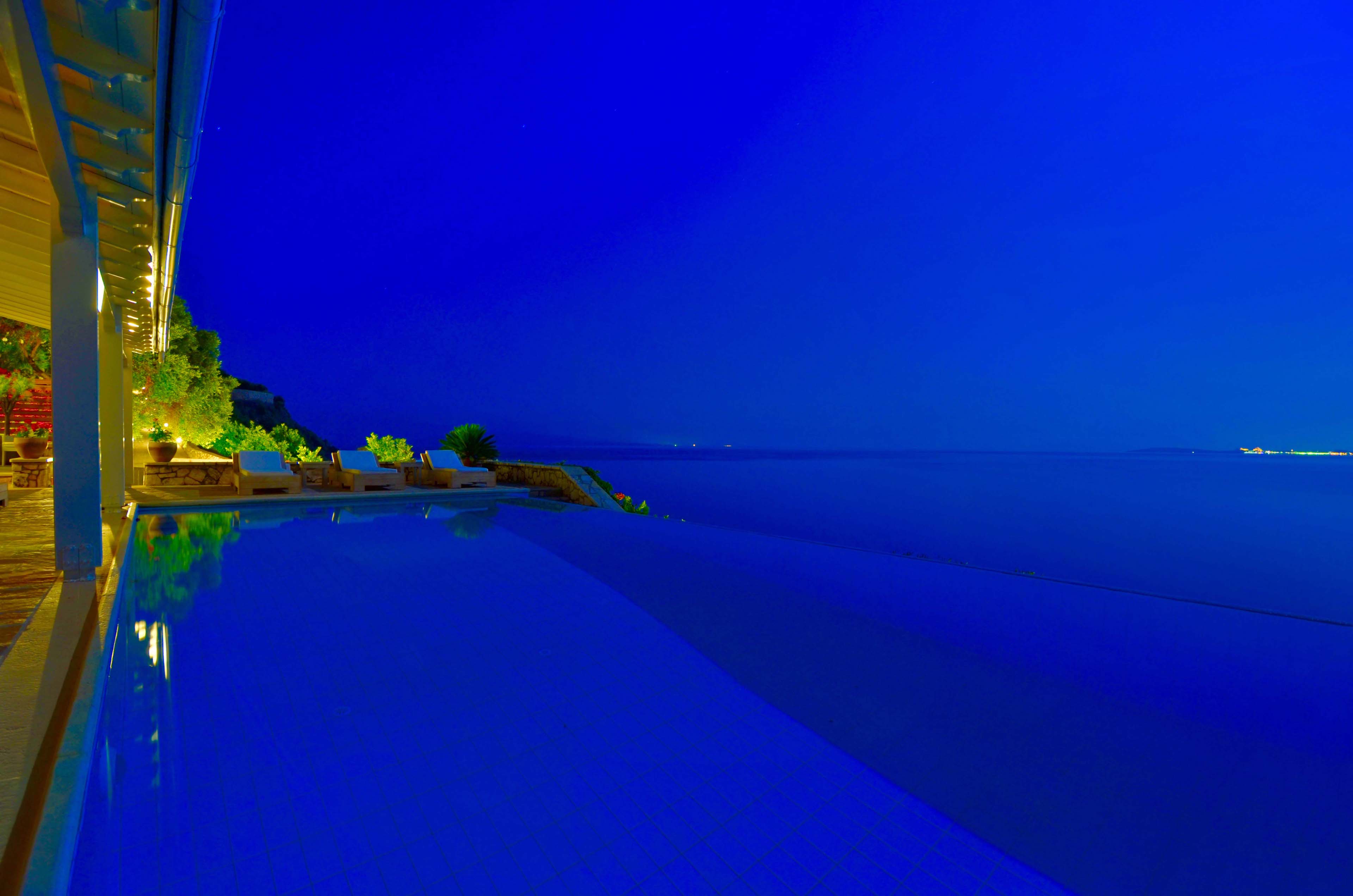 Iris, an extraordinary waterfront home with two semi private beaches. Surrounded by beautifully landscaped gardens and part of a gated estate on the island of Corfu, it enjoys 180° panoramic views across to the bay of Corfu Town and Gouvia. As dusk falls, the lights from the city turn the bay into a distant glow of shimmering golden light.
