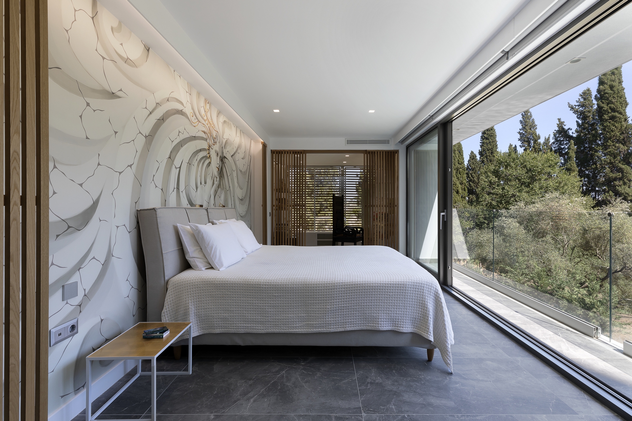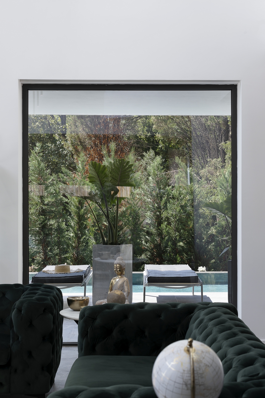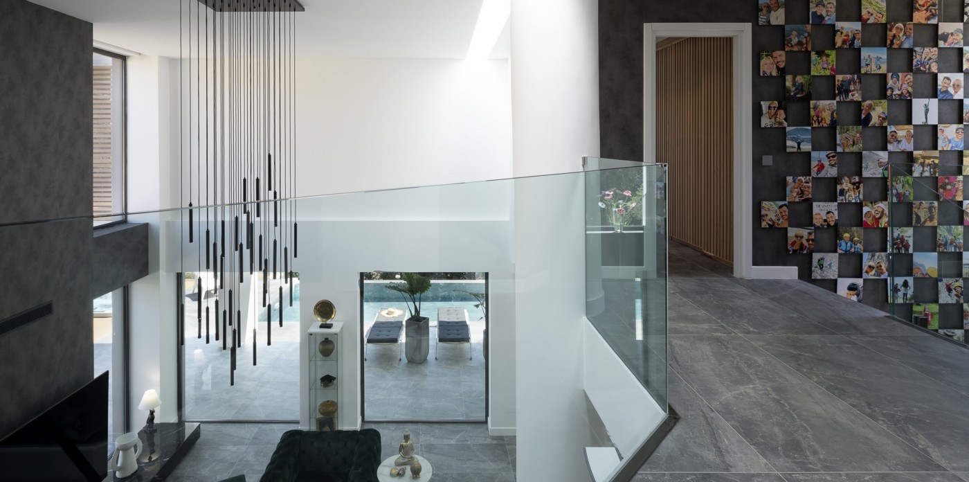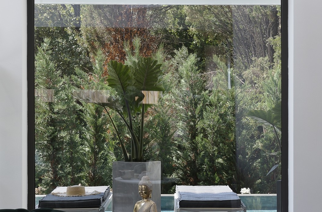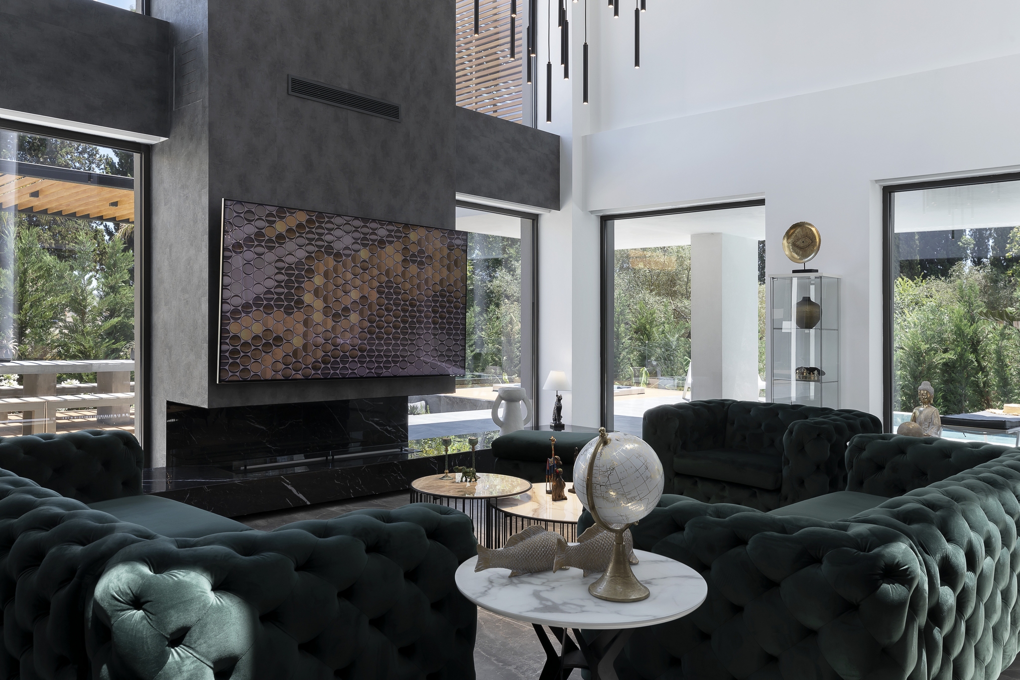 The impressive double ceiling height with oversized floor to ceiling glass doors and fireplace create a captivating focal point. These large glass doors offer a beautiful view to the garden and the swimming pool and allow an abundance of natural light and superb sense of openness.