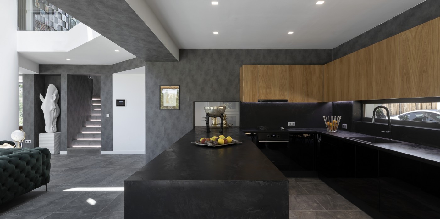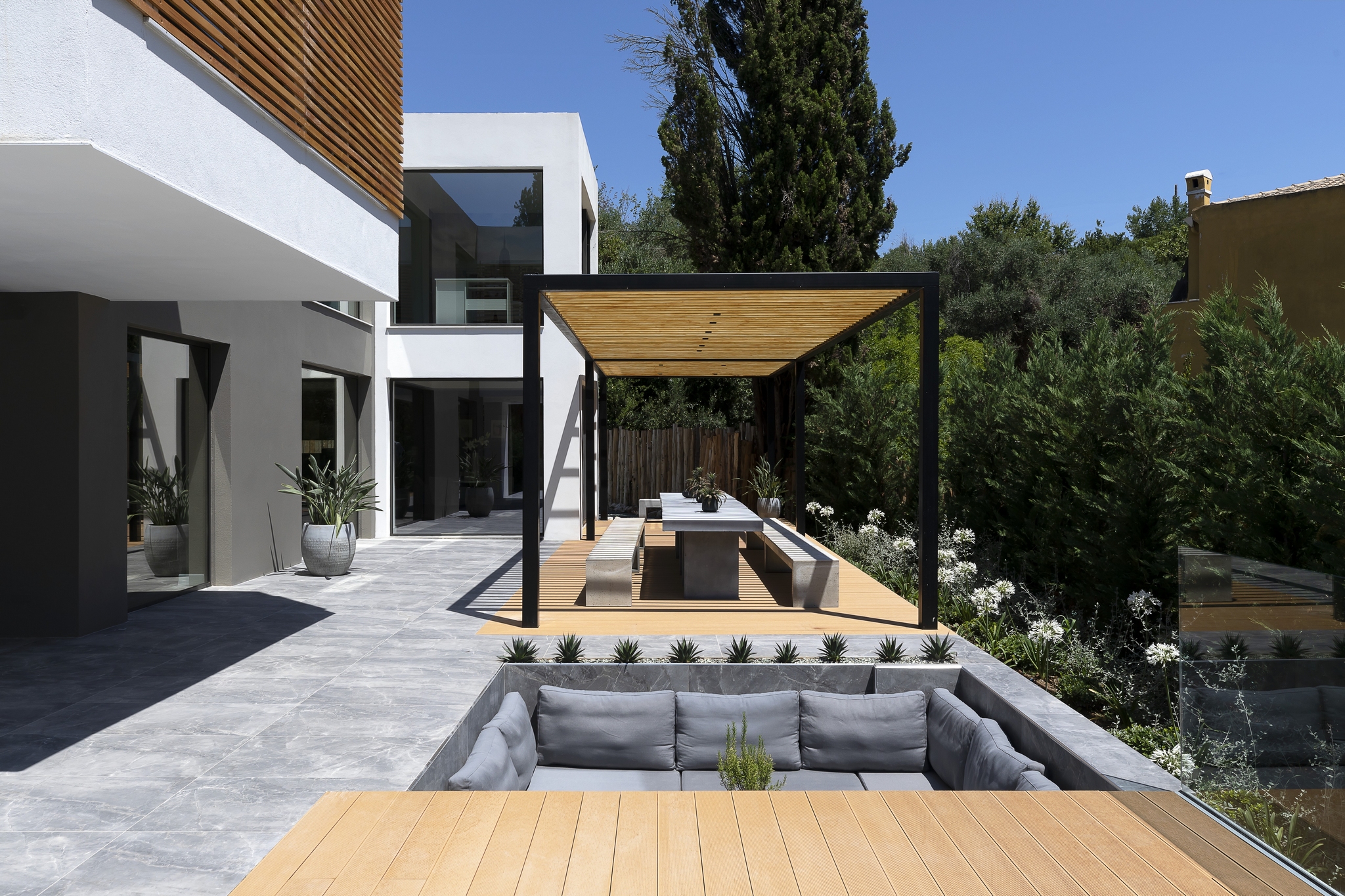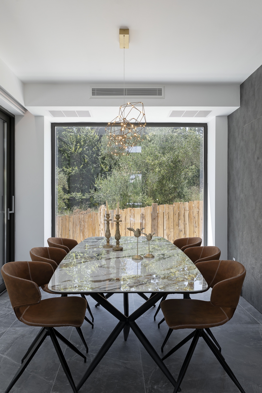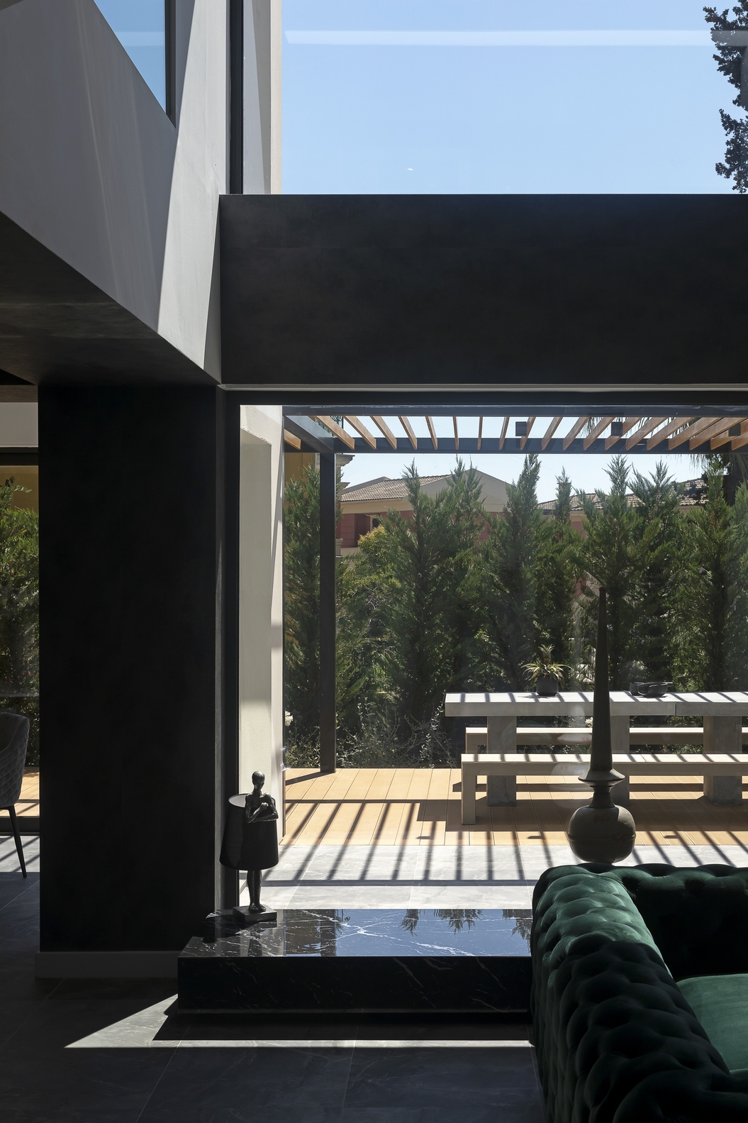 The impressive double ceiling height with oversized floor to ceiling glass doors and fireplace create a captivating focal point. These large glass doors offer a beautiful view to the garden and the swimming pool and allow an abundance of natural light and superb sense of openness.