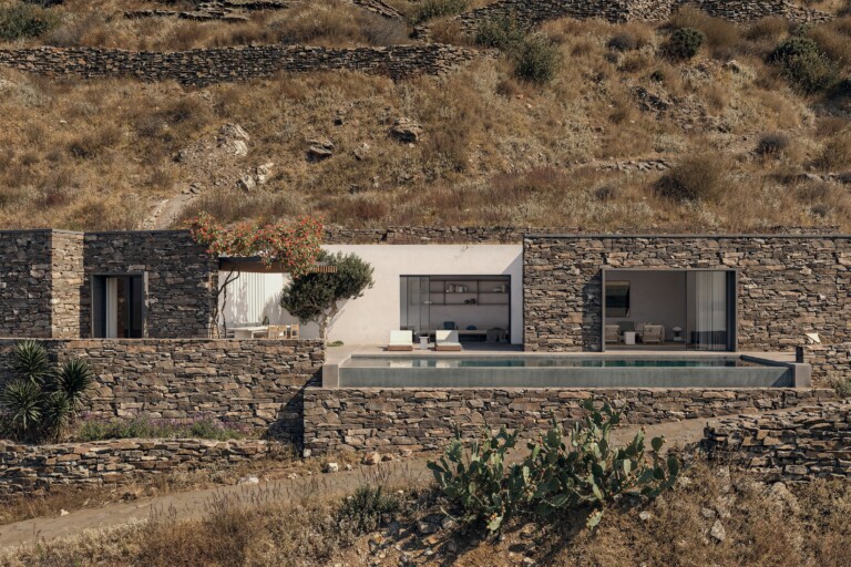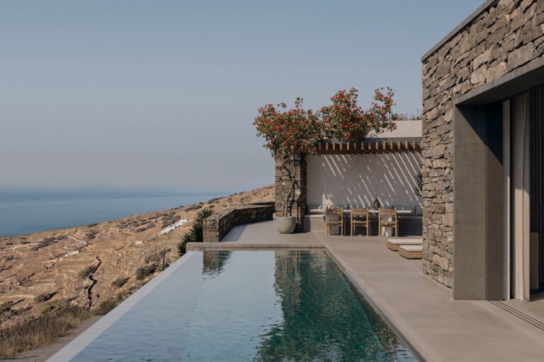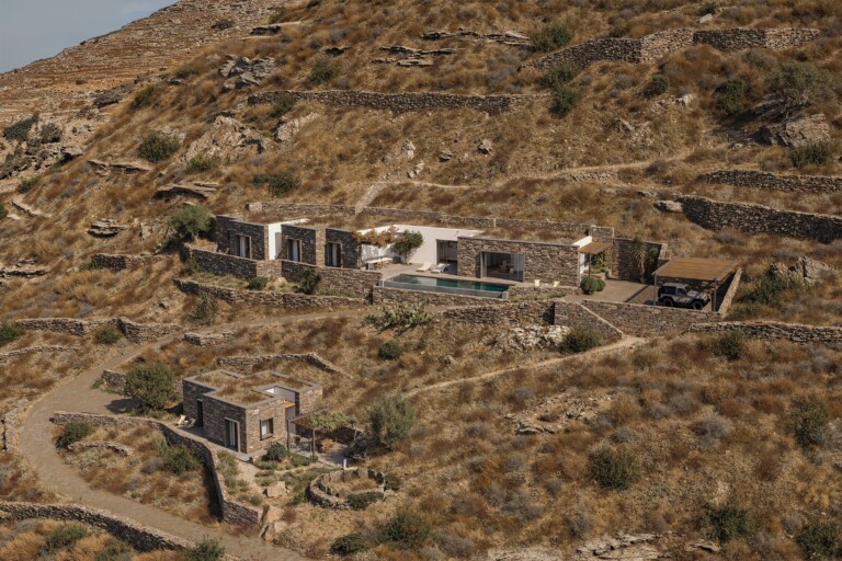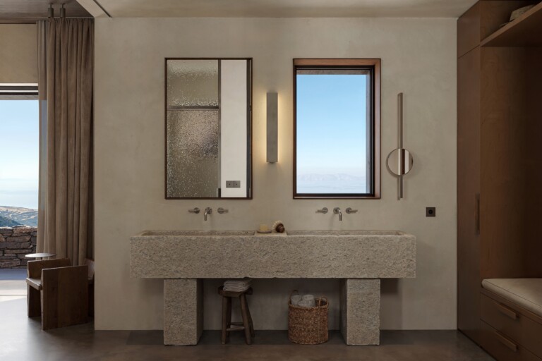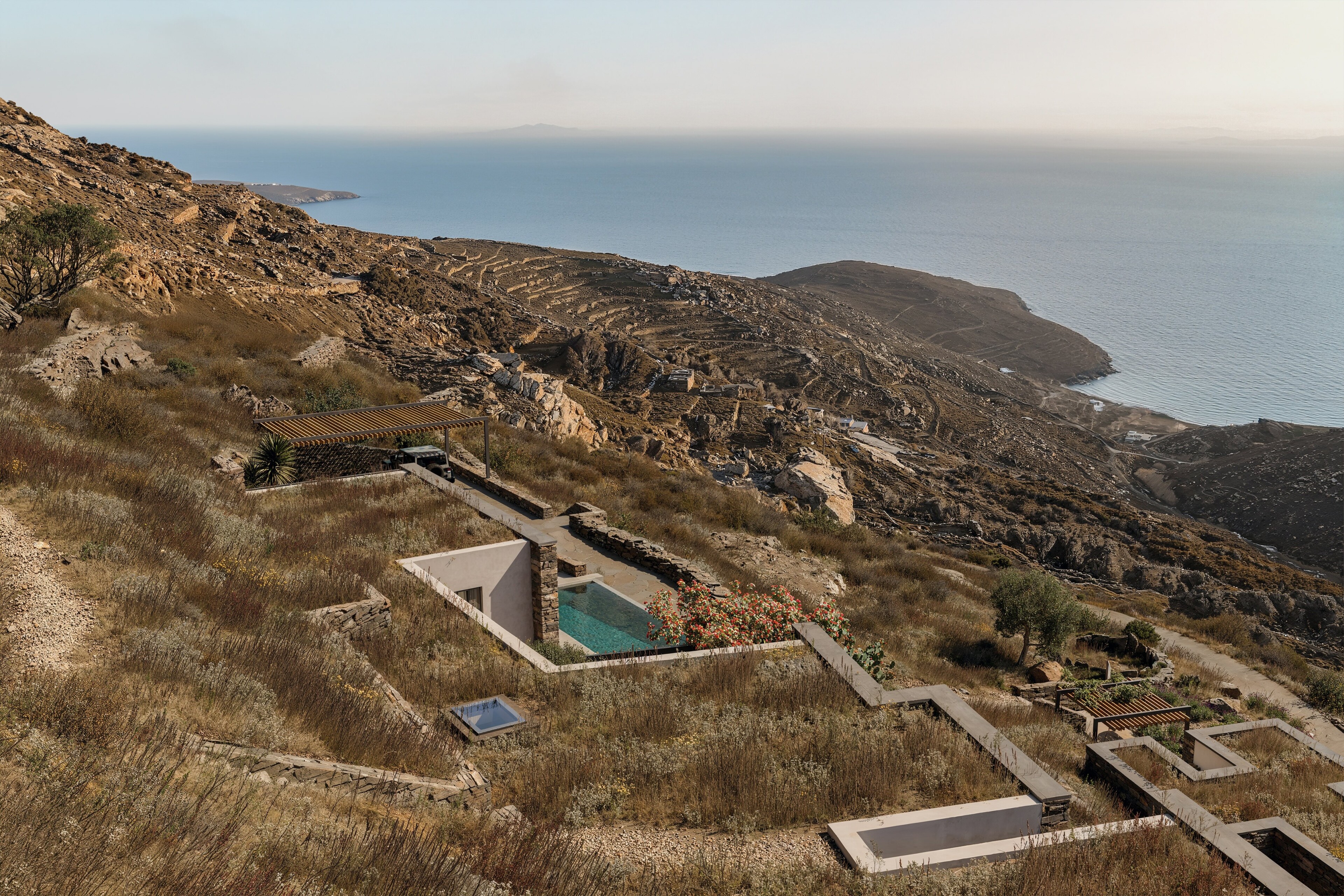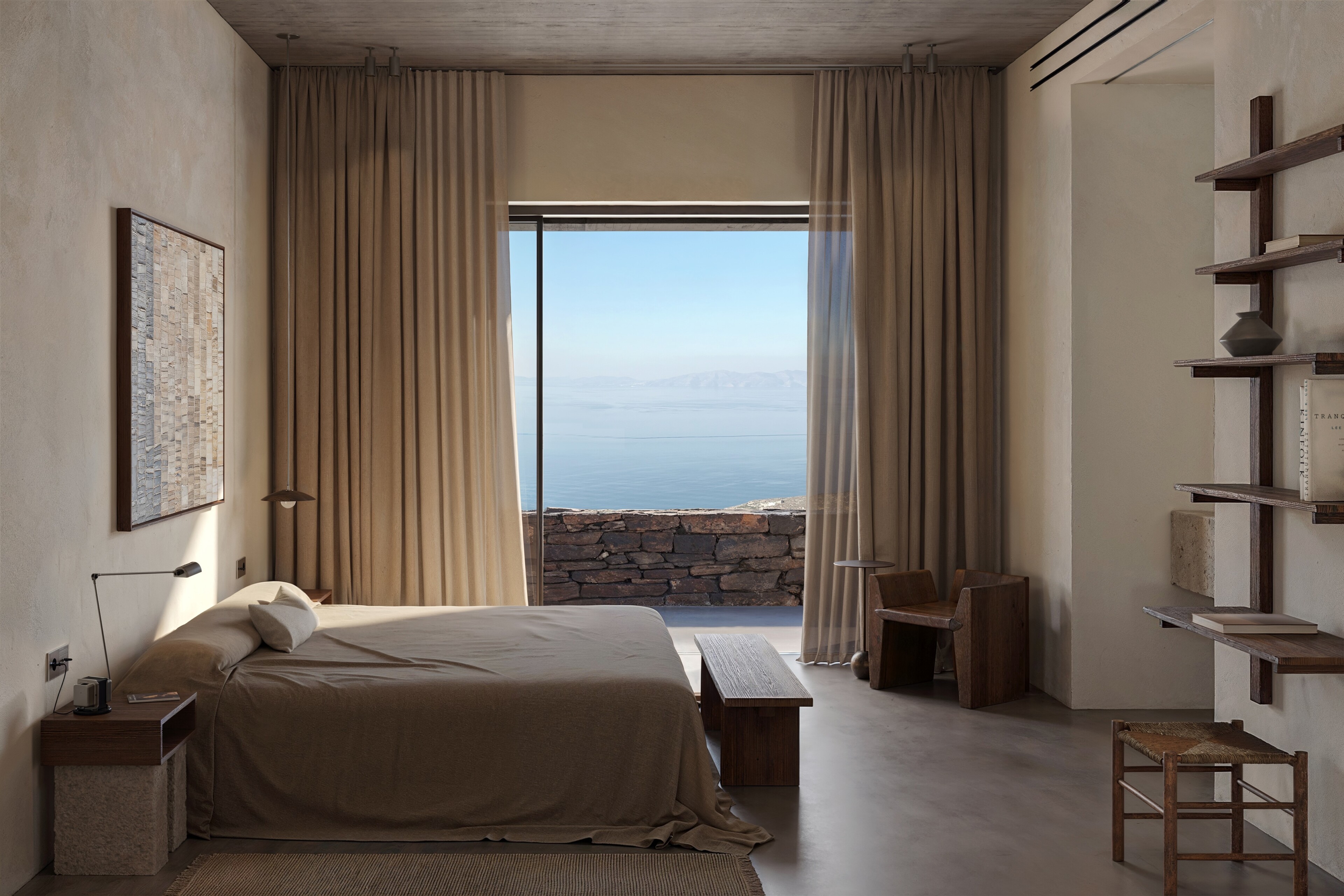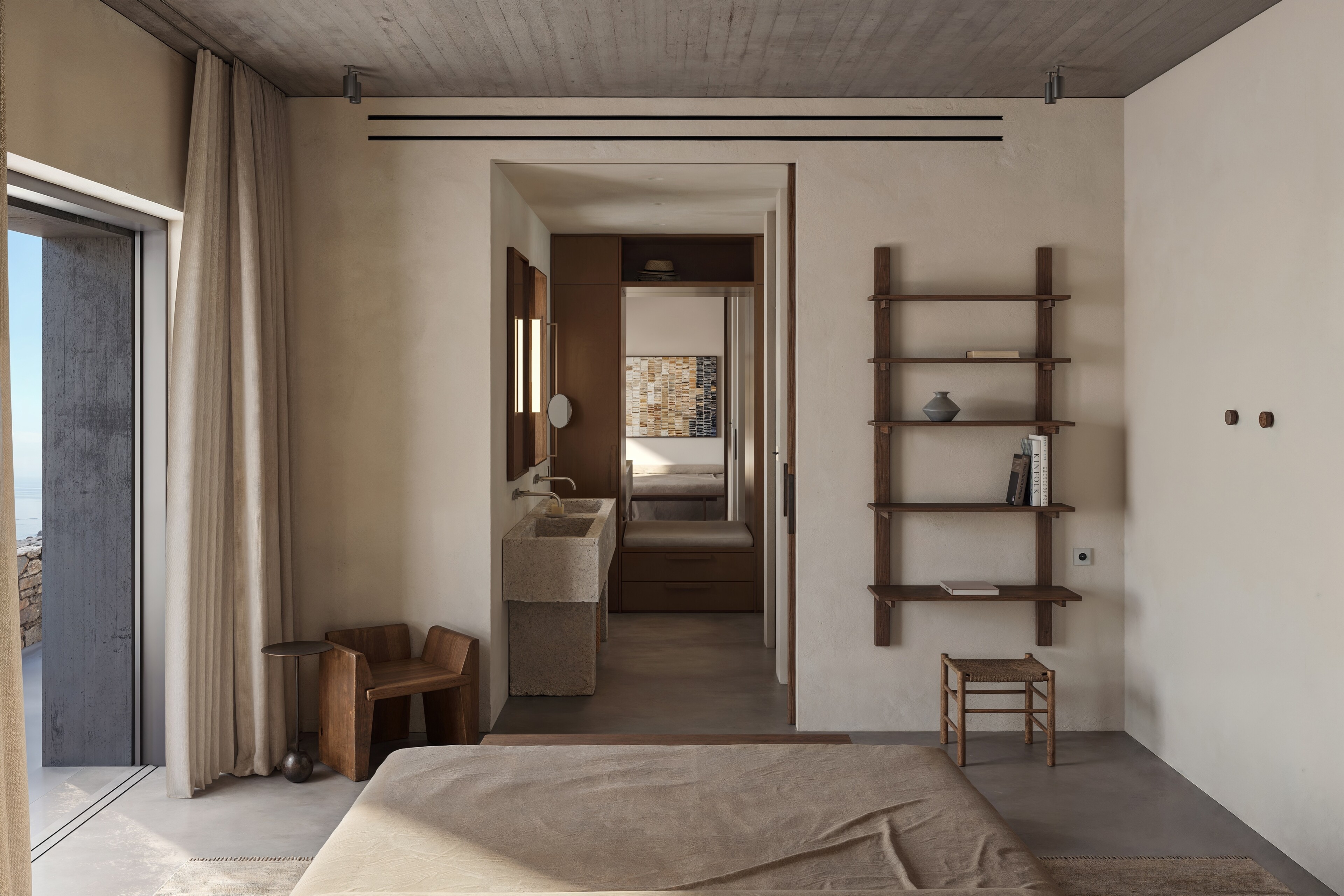 Nestled beside a beautifully restored threshing floor, the guesthouse, inspired by traditional shepherd’s huts, blends seamlessly with the island’s landscape. Its rustic openings offer glimpses of the surrounding beauty, while the interior provides modern comforts and a tranquil escape. This harmonious blend of nature and design makes Villa Litha a truly special retreat.
