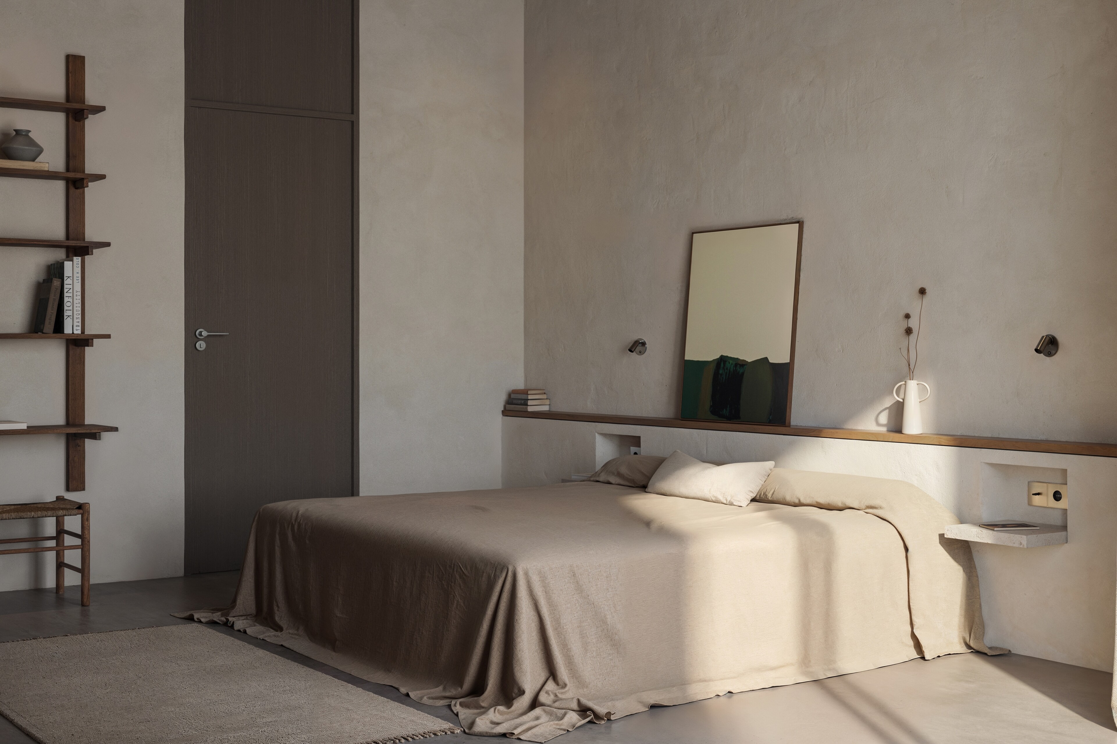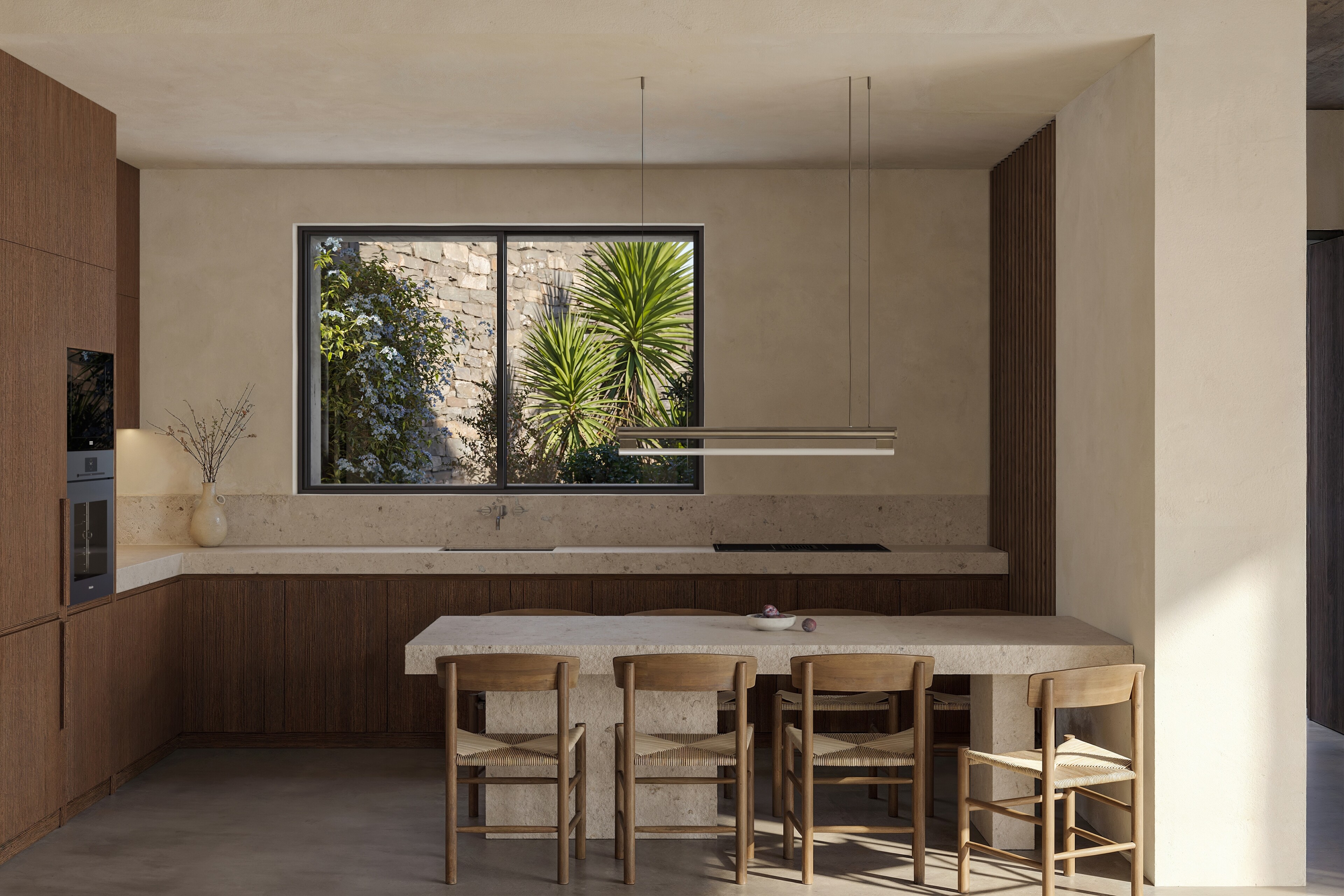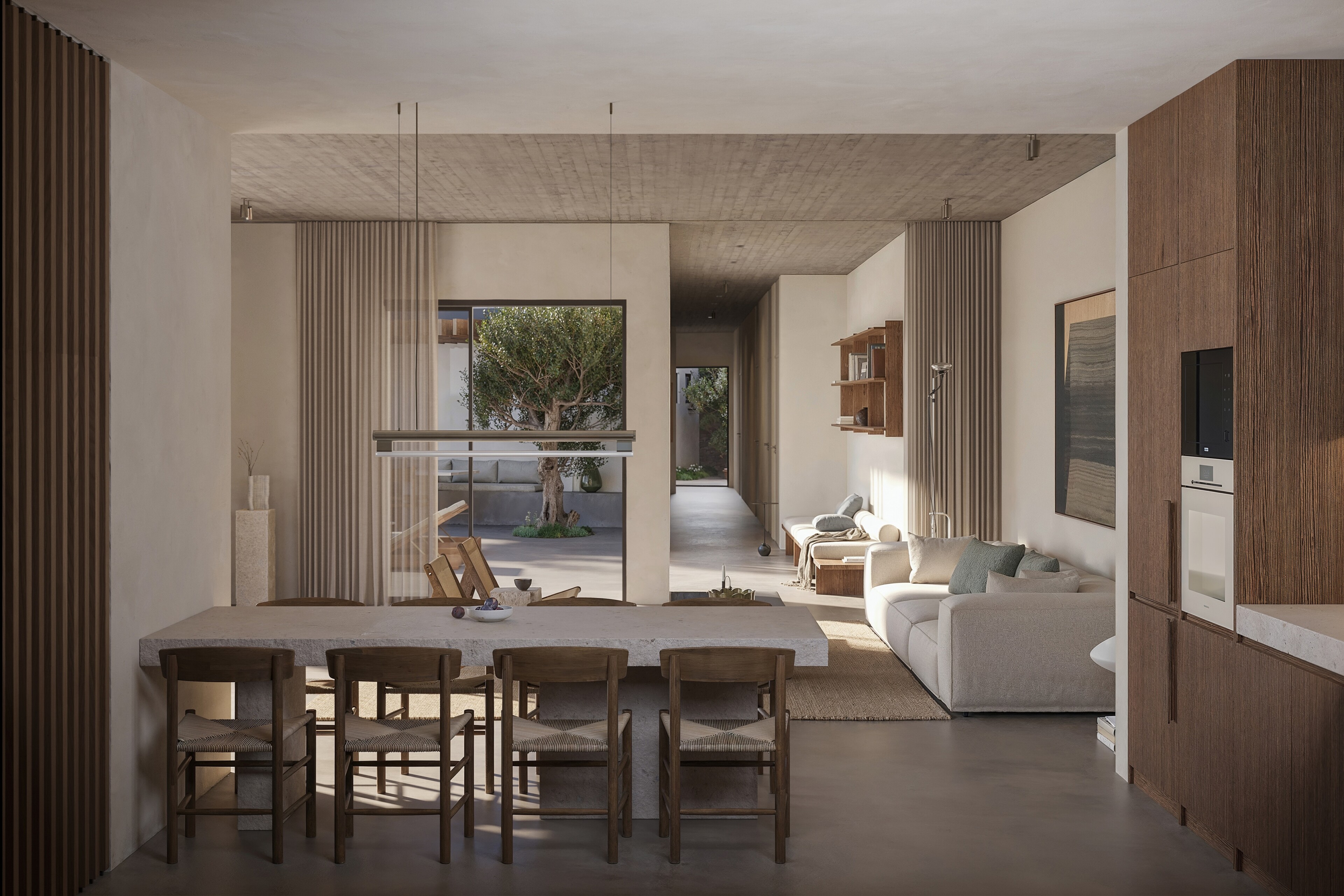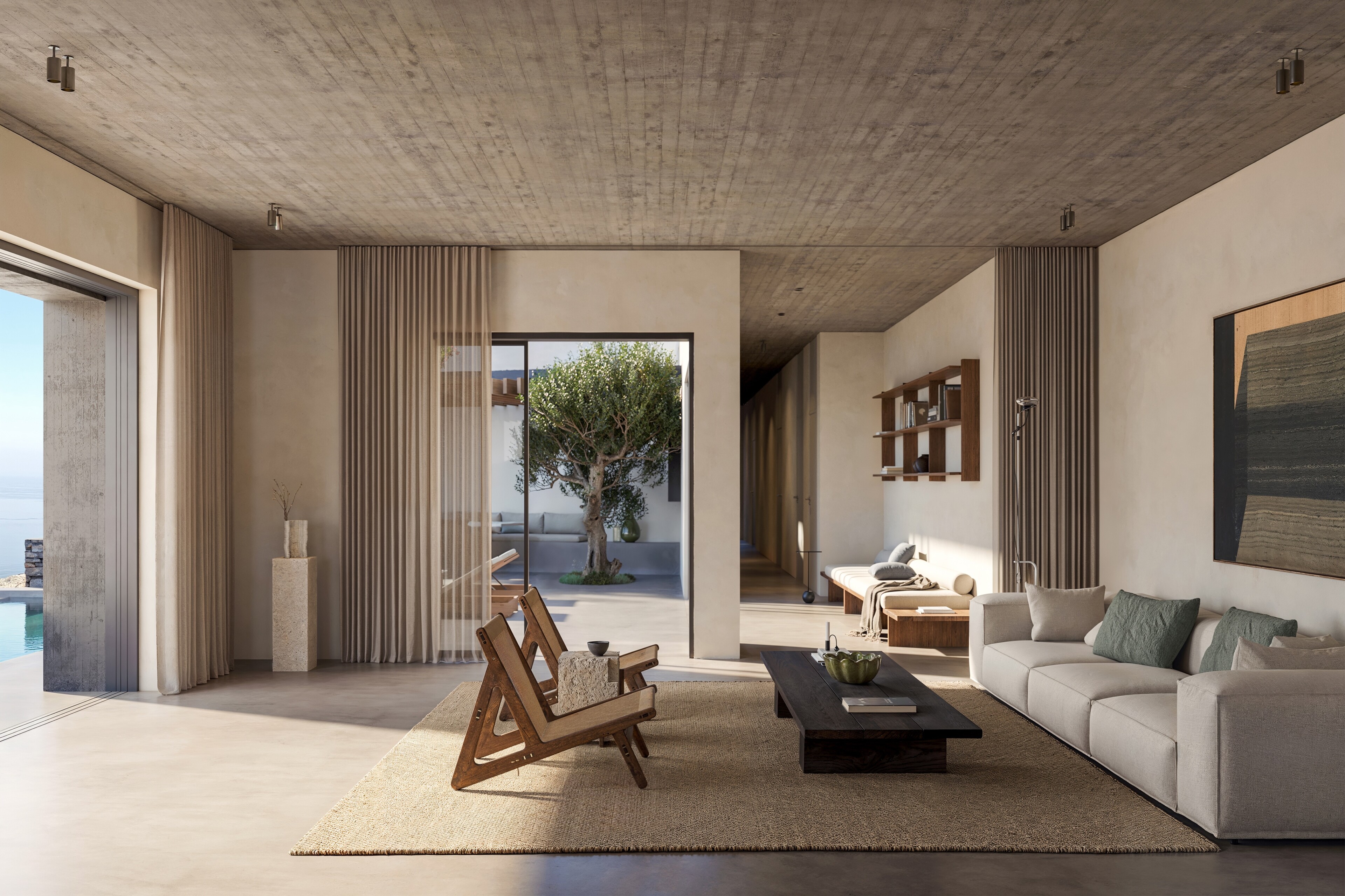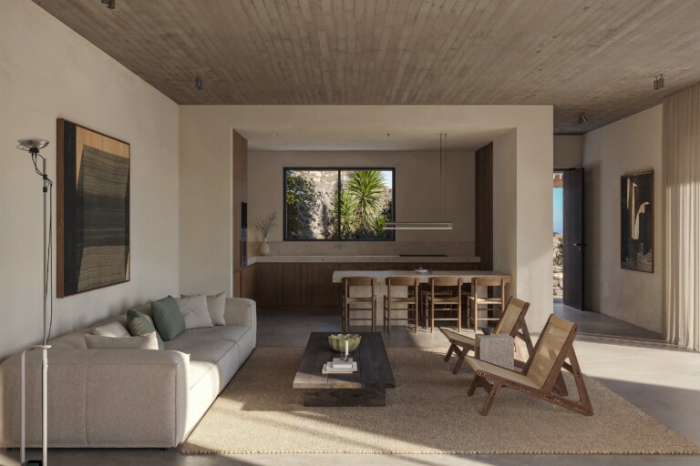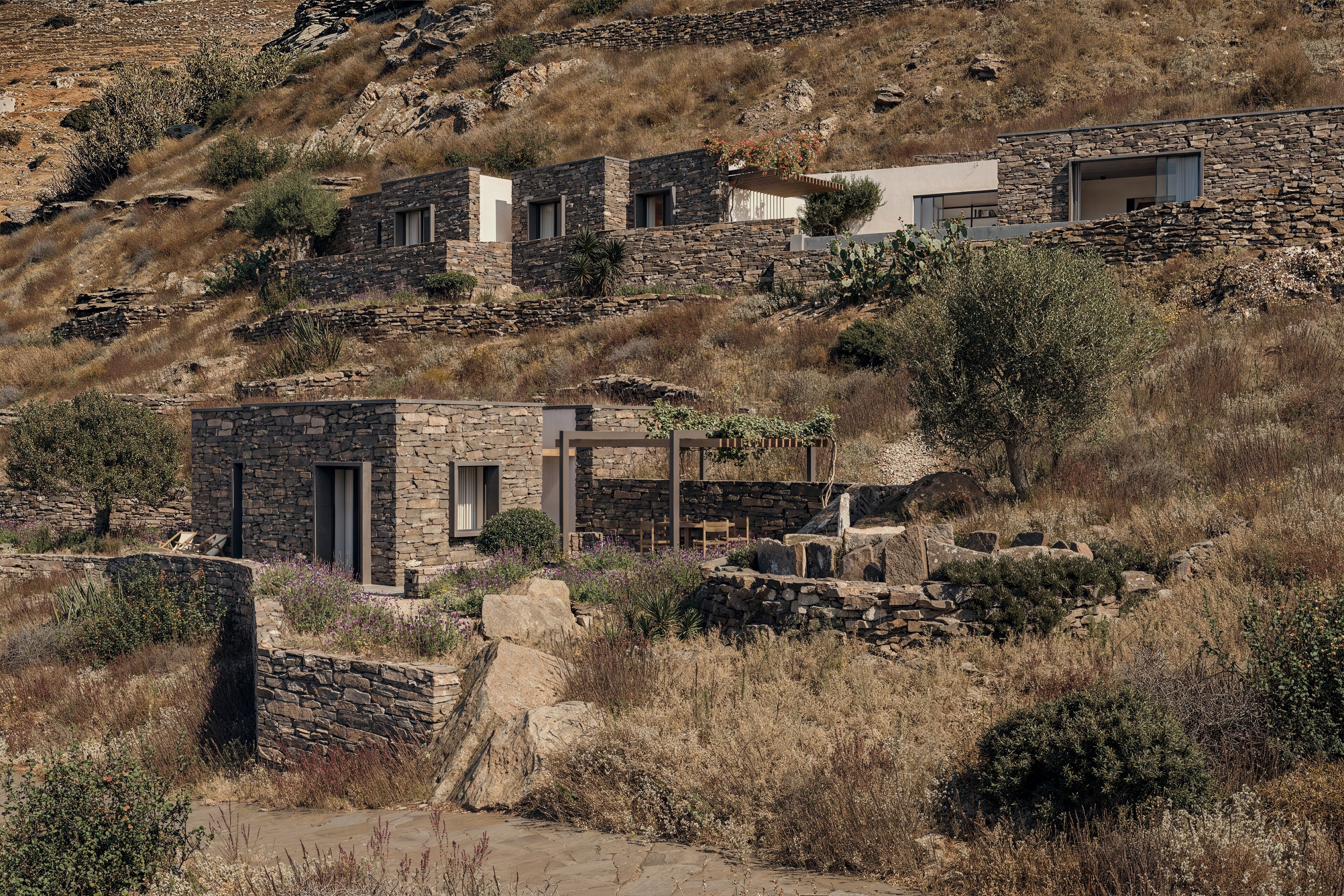 Nestled beside a beautifully restored threshing floor, the guesthouse, inspired by traditional shepherd’s huts, blends seamlessly with the island’s landscape. Its rustic openings offer glimpses of the surrounding beauty, while the interior provides modern comforts and a tranquil escape. This harmonious blend of nature and design makes Villa Litha a truly special retreat.