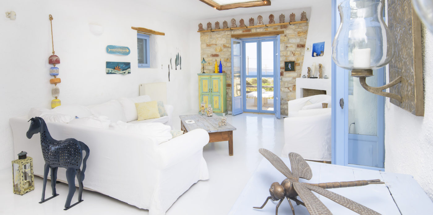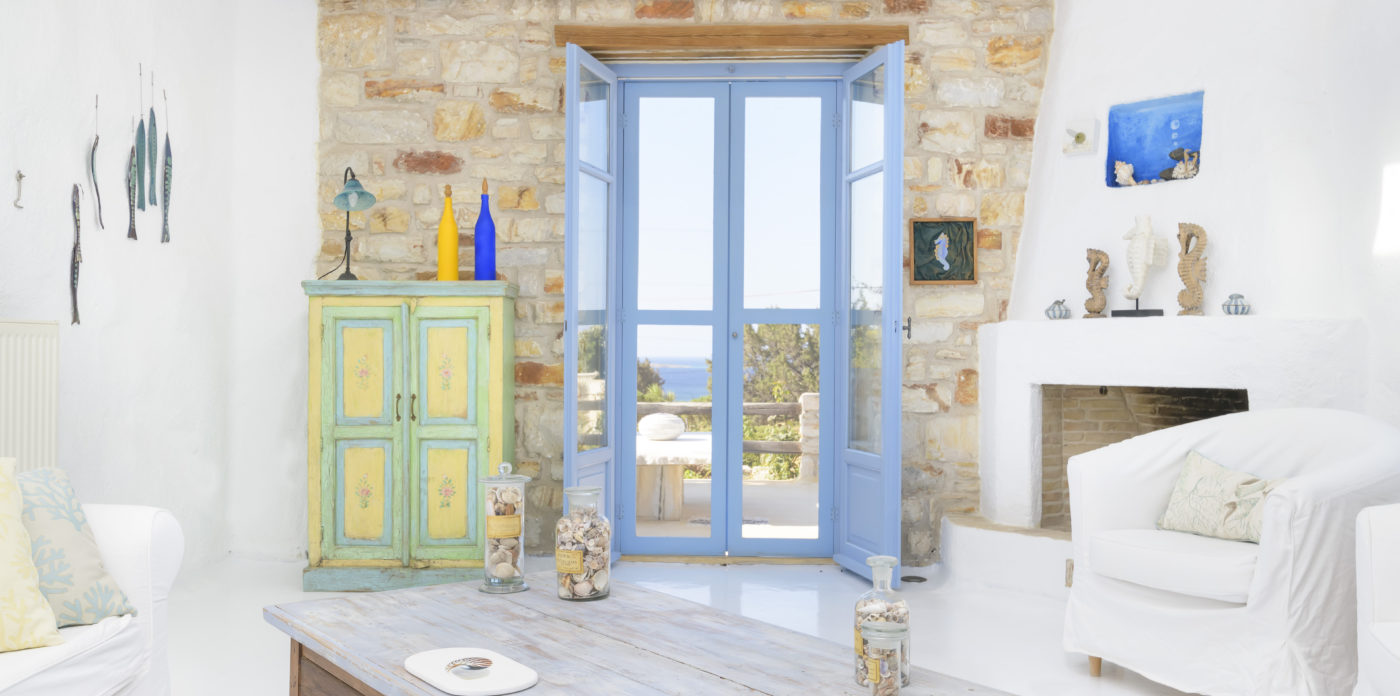 Light filled living spaces showcase a casual aesthetic, where shades of white and cool blue create a fresh mediterranean atmosphere. Relaxed furnishings and a lovely open fireplace add to the ambience.