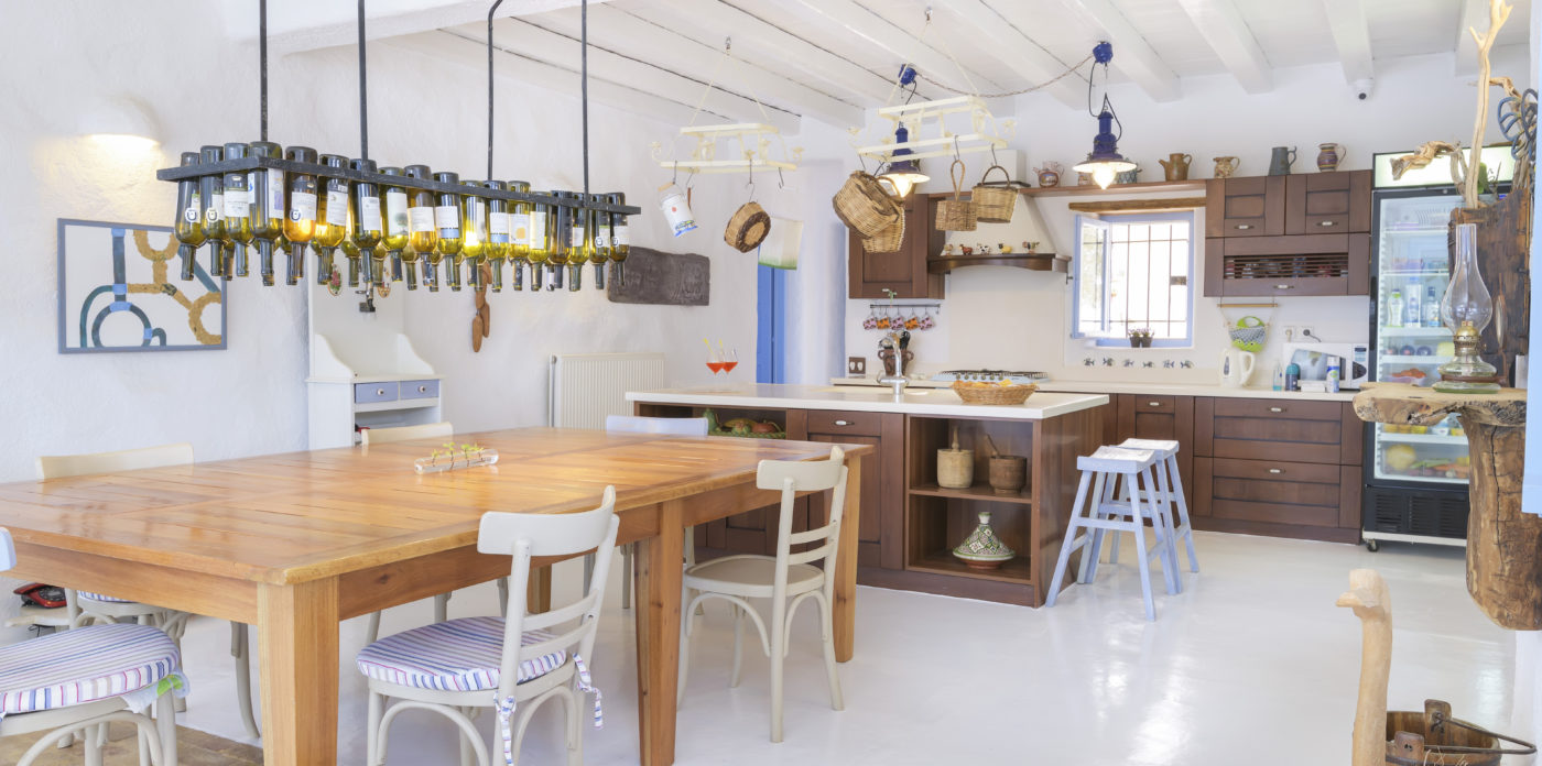 The kitchen is fitted with wooden cabinets and appliances, including a glass fronted refrigerator. A bespoke light fitting above the dining table is just one of the stand out features of this beautifully put together home.