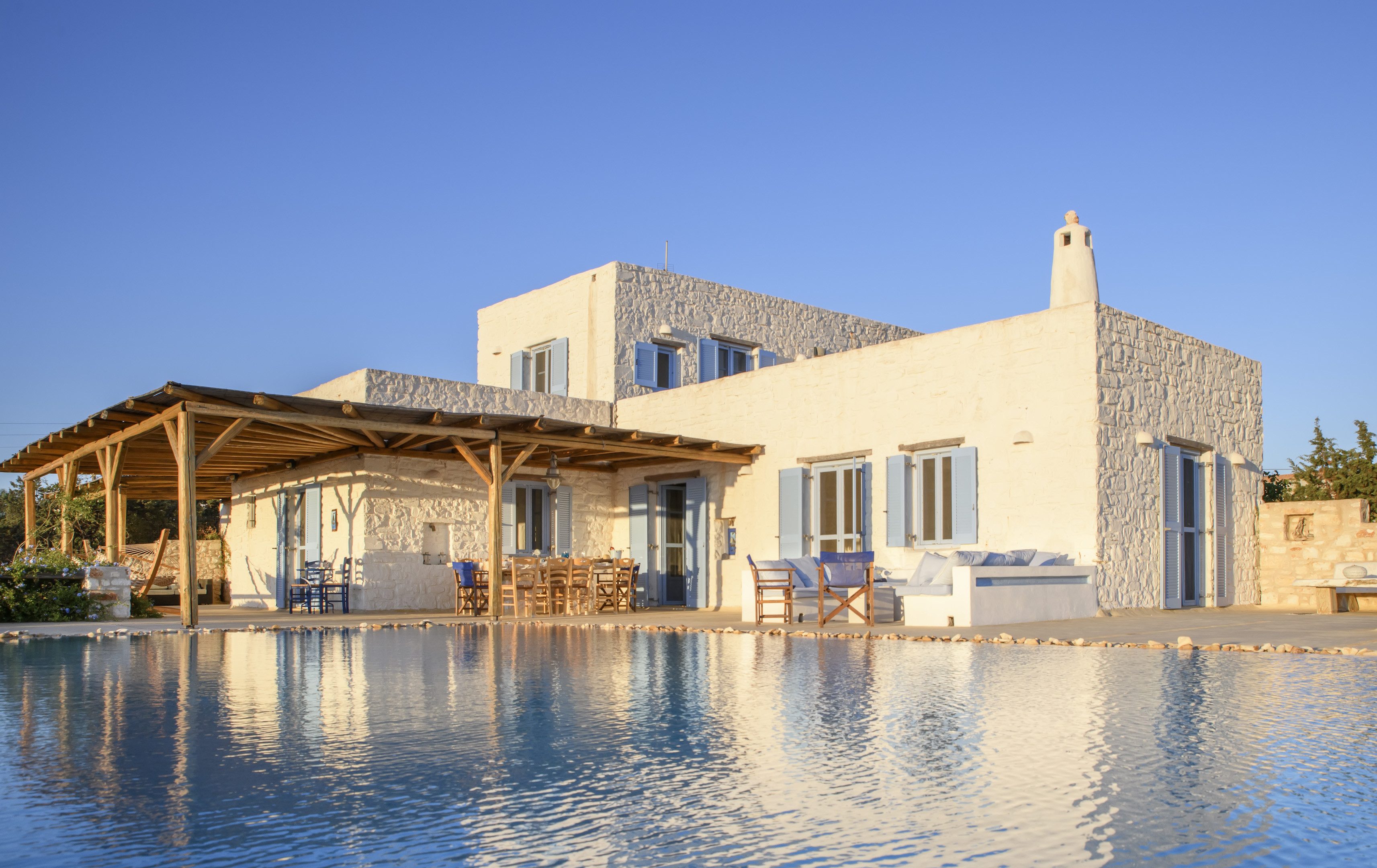 Outside is all about carefree island living with a shaded terrace for outdoor dining, a traditional stone built BBQ as well as easy, laid back seating areas. An infinity edge pool emphasises the surroundings, enveloping you as you swim by the beauty of the scenery.