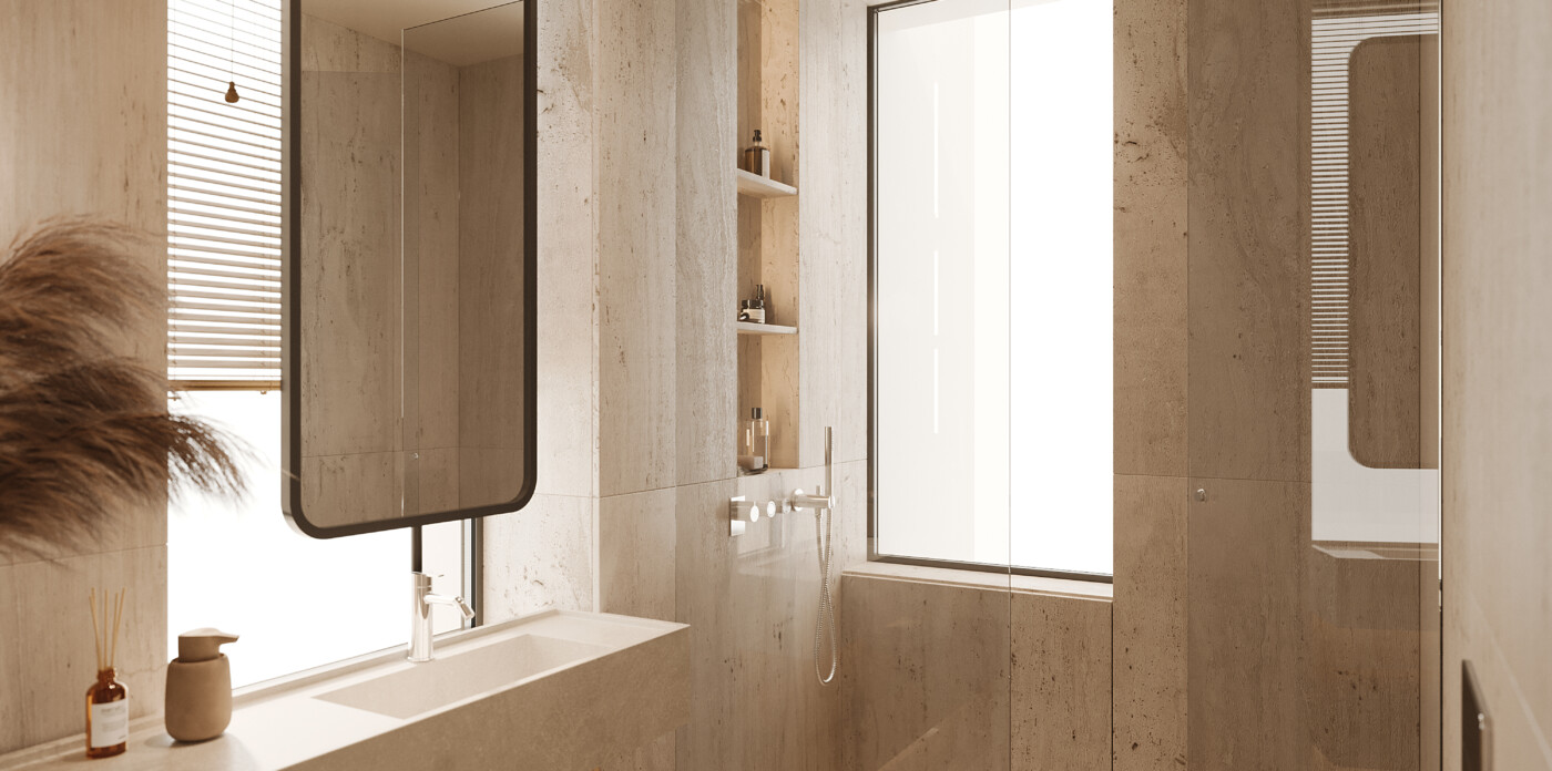On the ground floor, a sliding door separates the main living areas from the bedrooms. This area comprises two comfortable, east-facing bedrooms with a shared bathroom and a luxurious master suite complete with an en-suite bathroom.