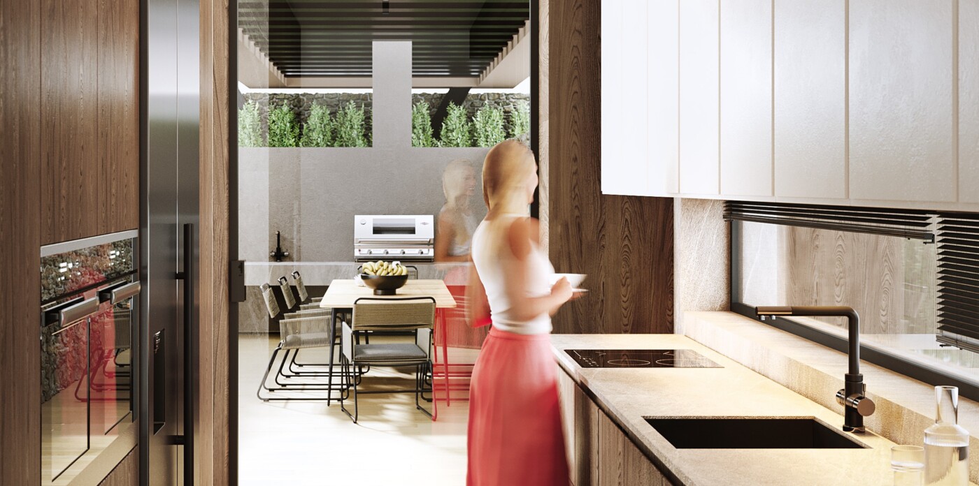 While separate from the main living areas, the kitchen seamlessly connects to the garden, outdoor dining area, and barbecue space, creating a natural flow for entertaining and enjoying outdoor living.