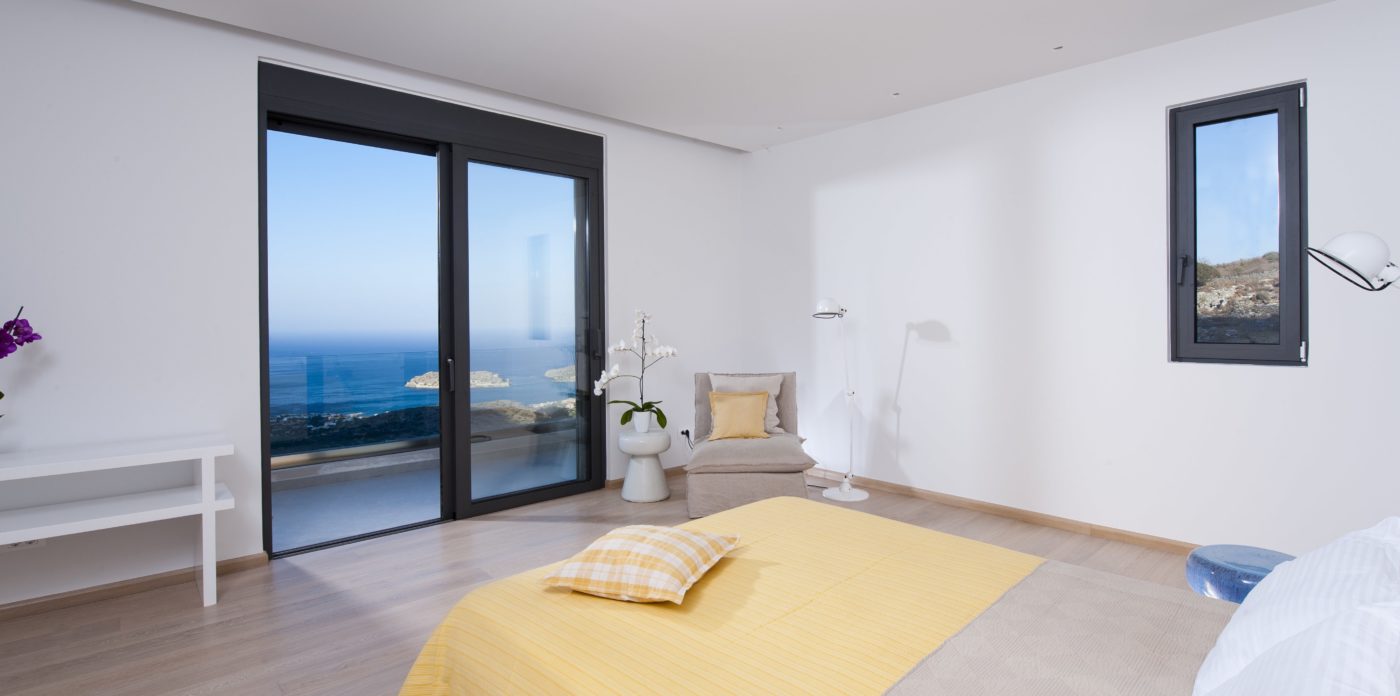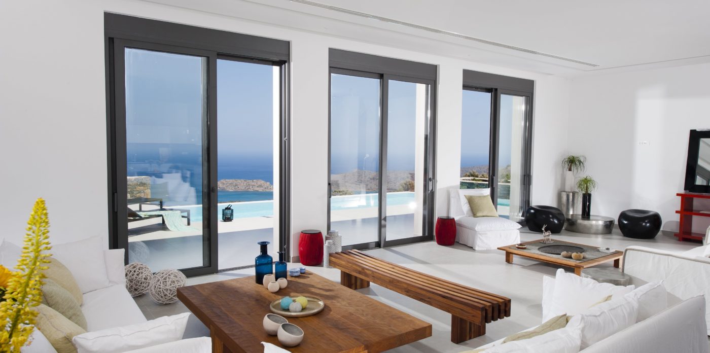 A large open living area takes up the entire ground level where the large patio windows allow the views of the Aegean sea and the sunshine to flood in.
