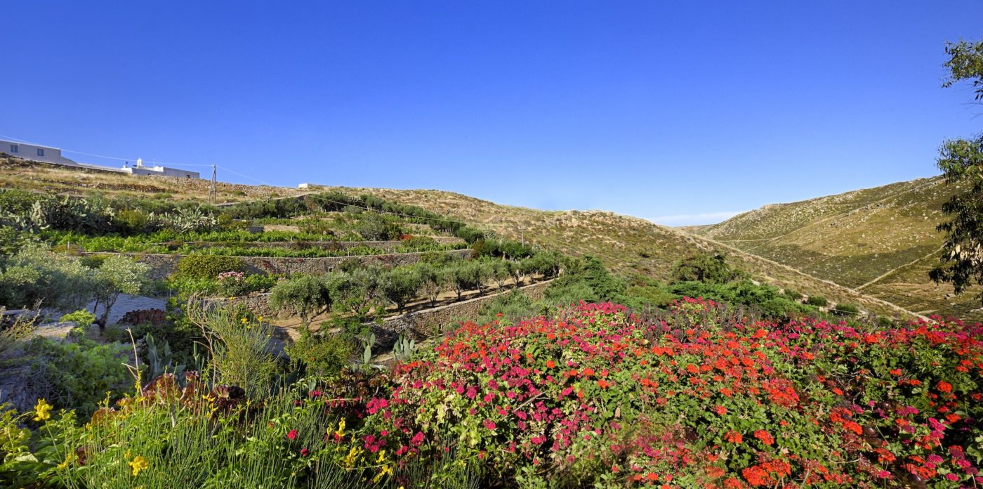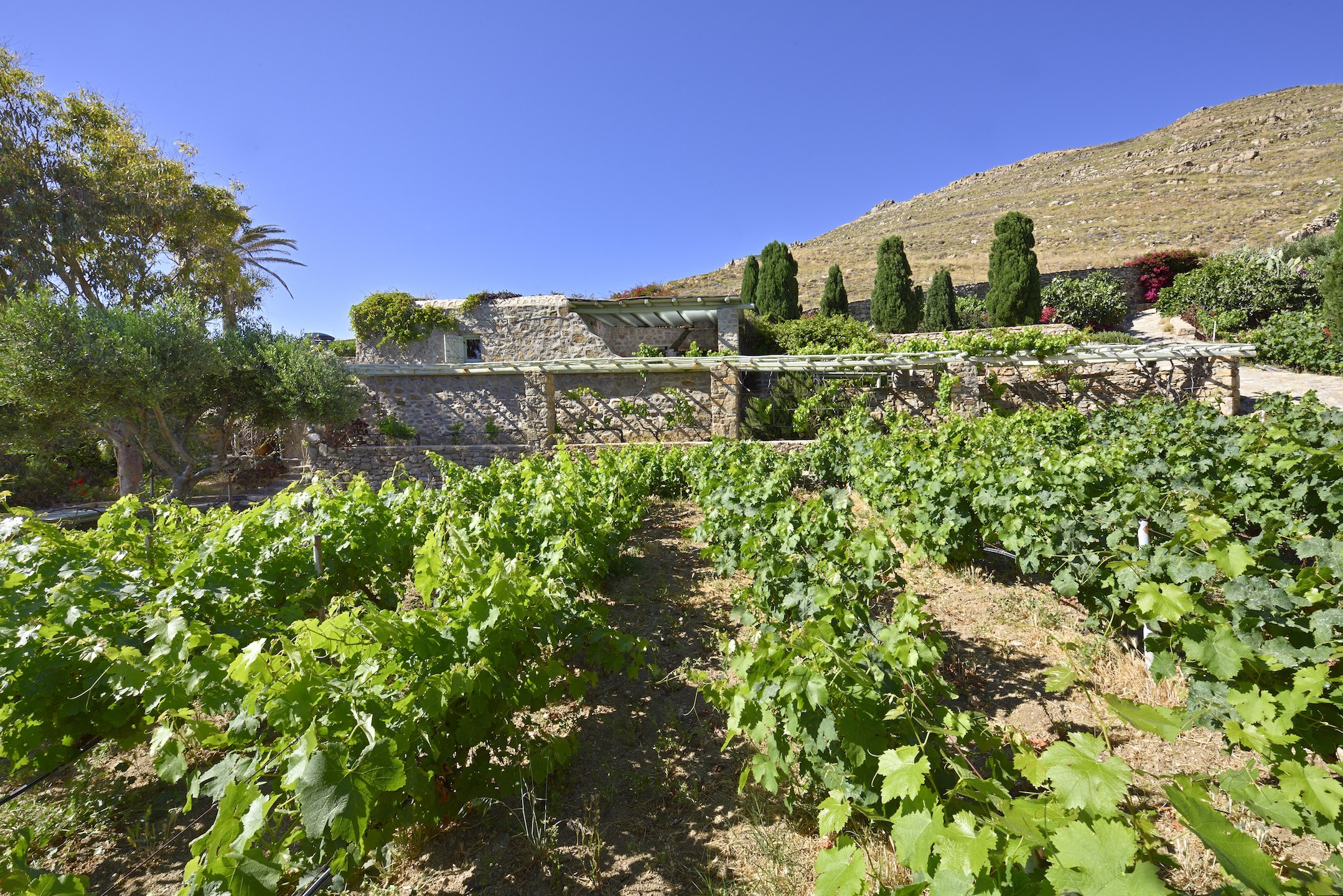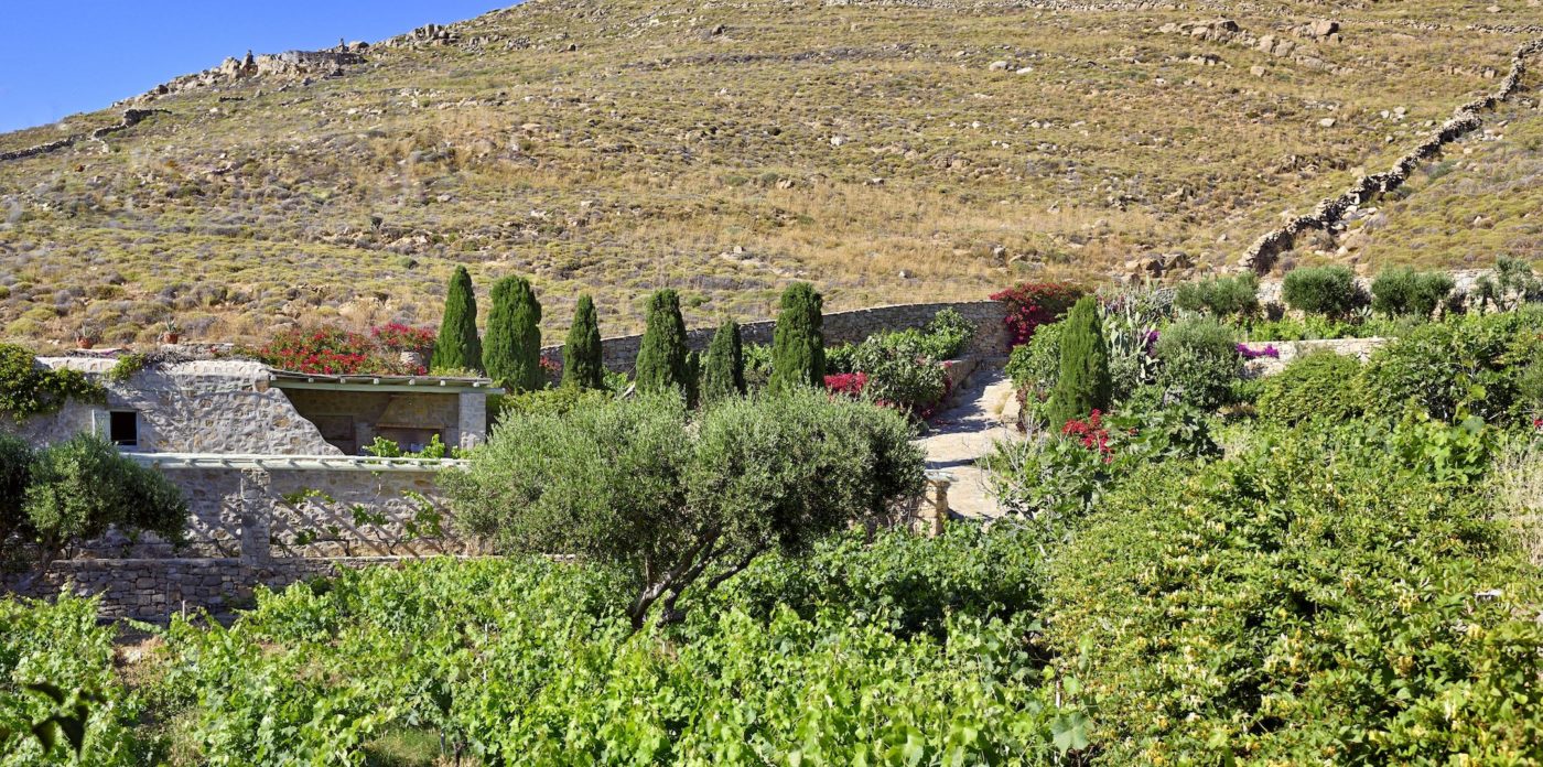 Along the path of a rare fresh water spring is the Miramare Estate, one of nature’s true miracles. Three deep wells here provide enough water for its two cabernet vineyards. An oasis of beauty amongst the often barren Cycladic landscape, the castle style mansion dominates from 130m high upon the hilltop summit.