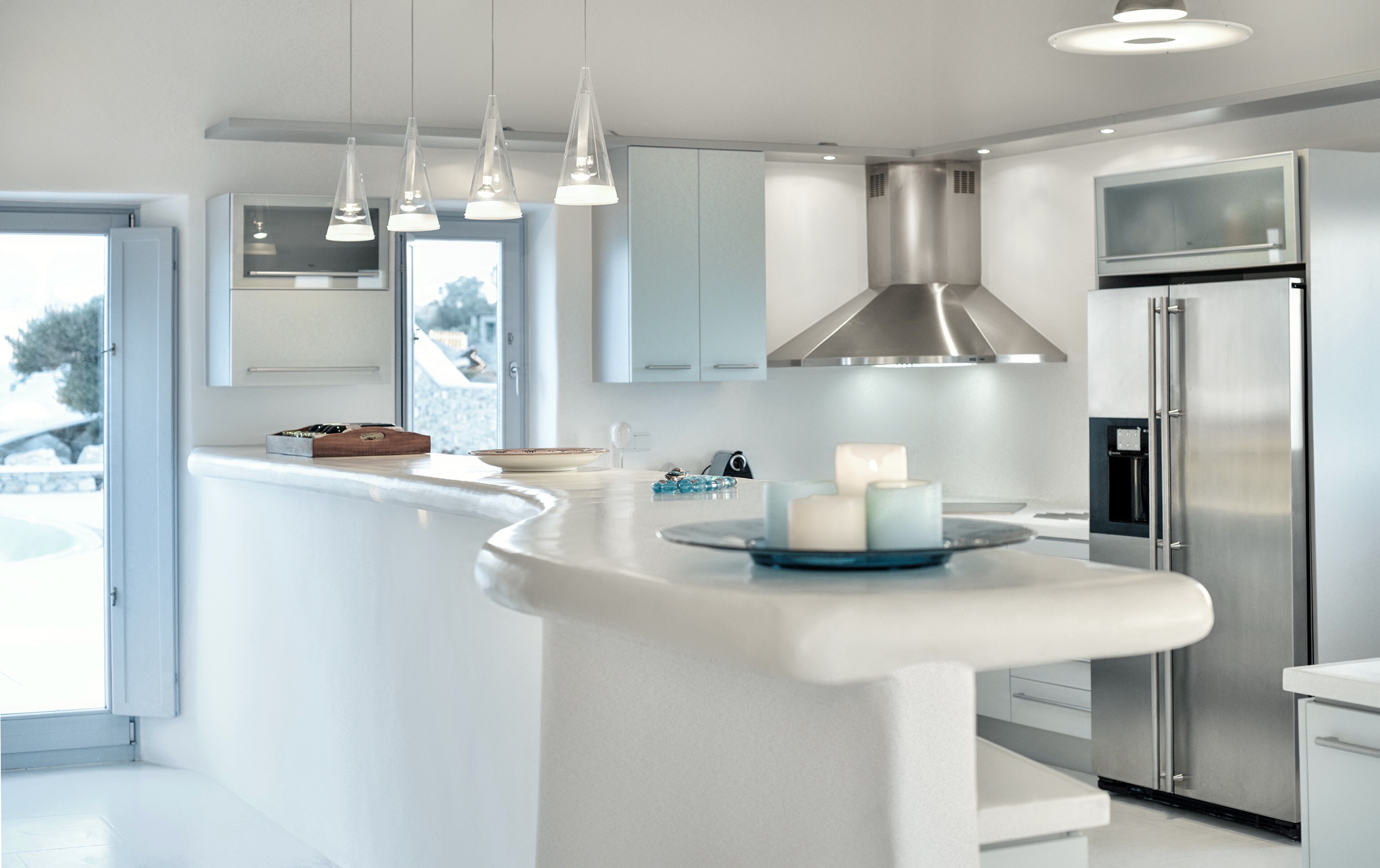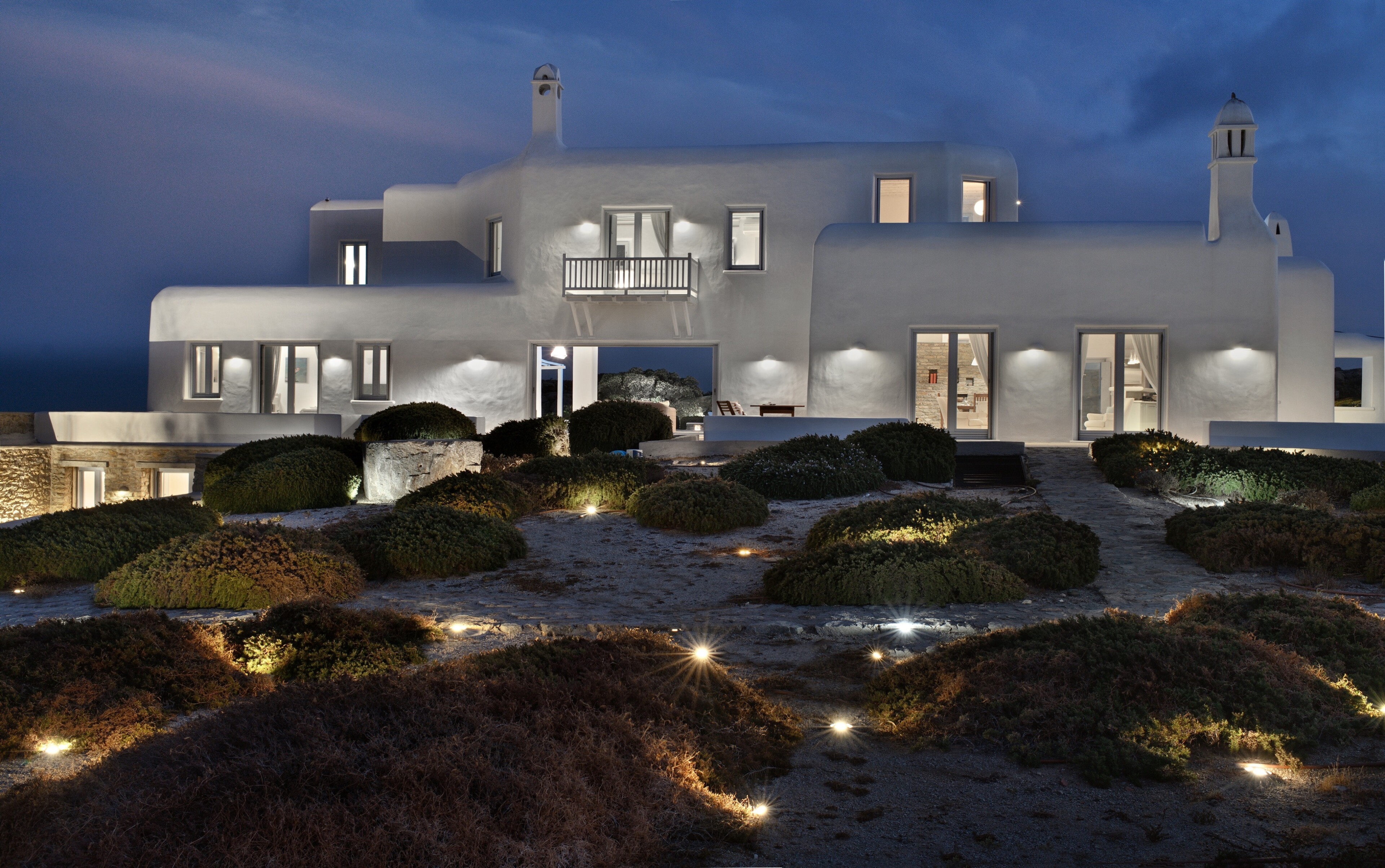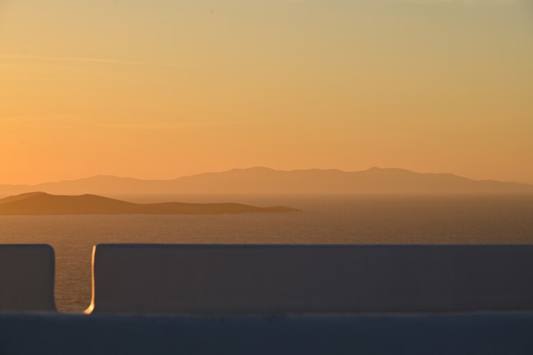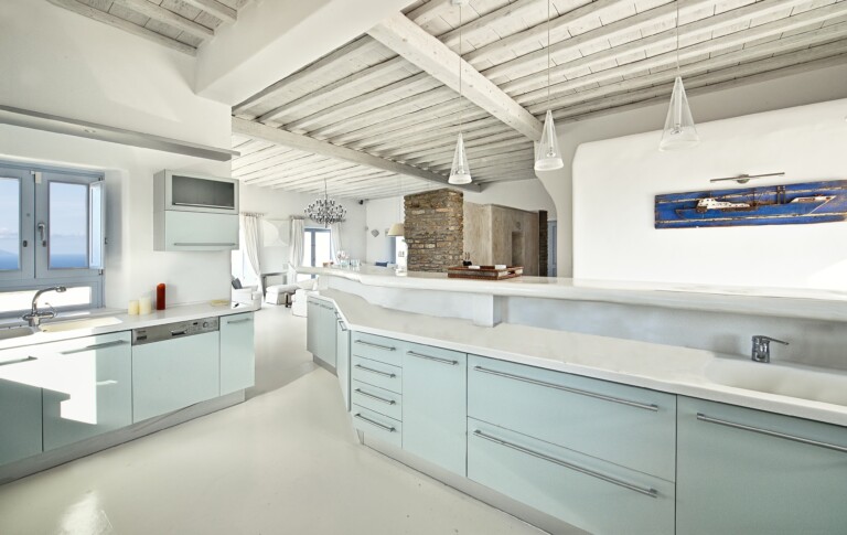 With a beautiful, curved counter that resembles the motion of a wave, the comfortable and fully equipped kitchen looks out to the pool and the voluminous outside areas. The large pool dominates the outside spaces, offering views of the Aegean Sea and the nearby island of Delos, while the lounge area is perfect for relaxing on a summer day or enjoying dinner while watching the sunset.