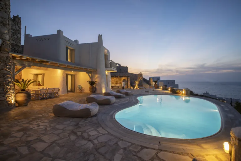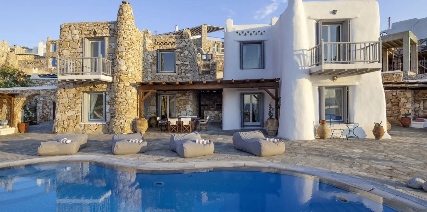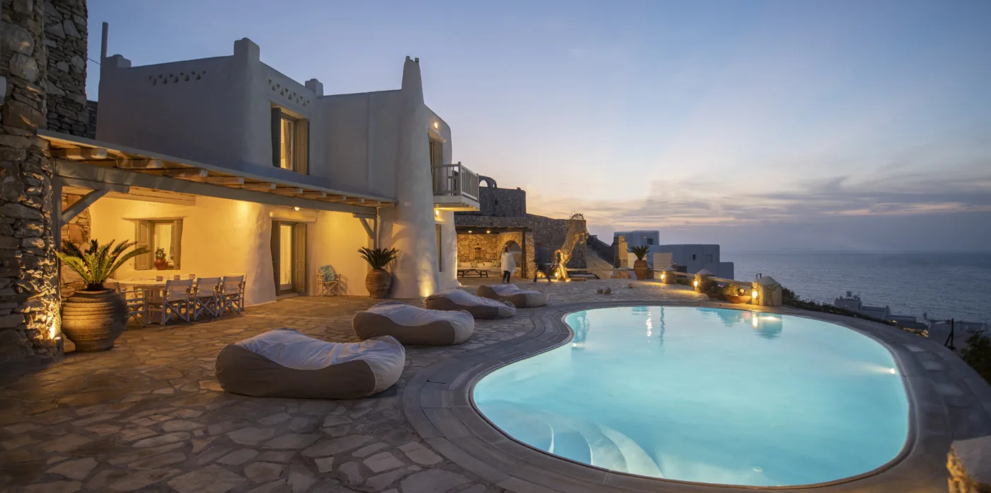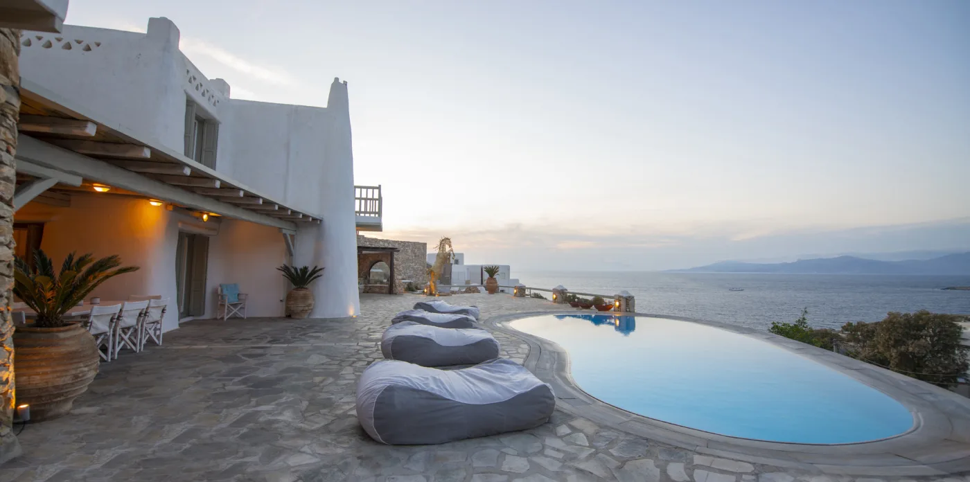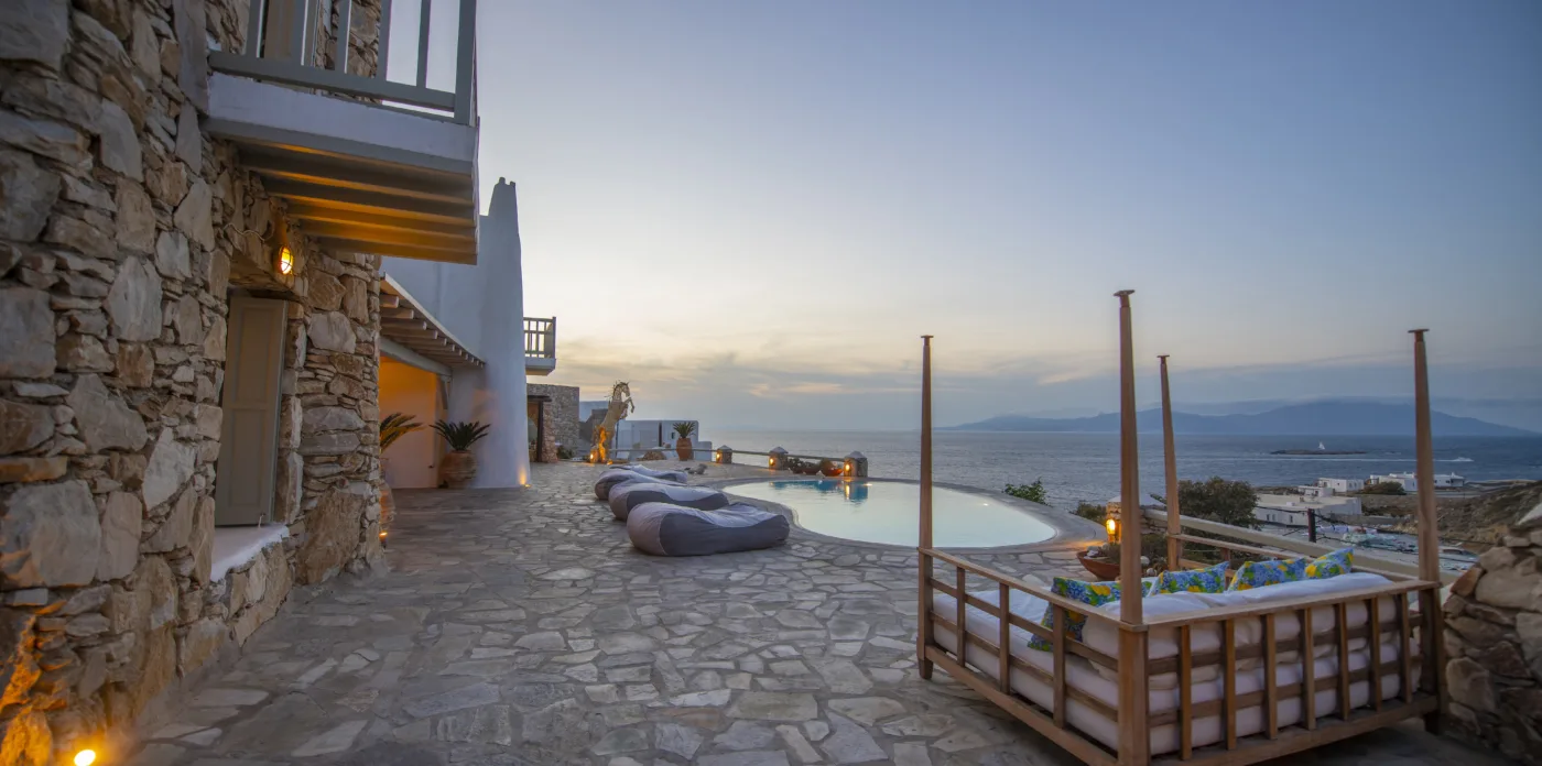 With sea and sunset views from every room, Mykonian Muse is comprised of two separate villas with unique architecture and a distinctive Mediterranean flair.