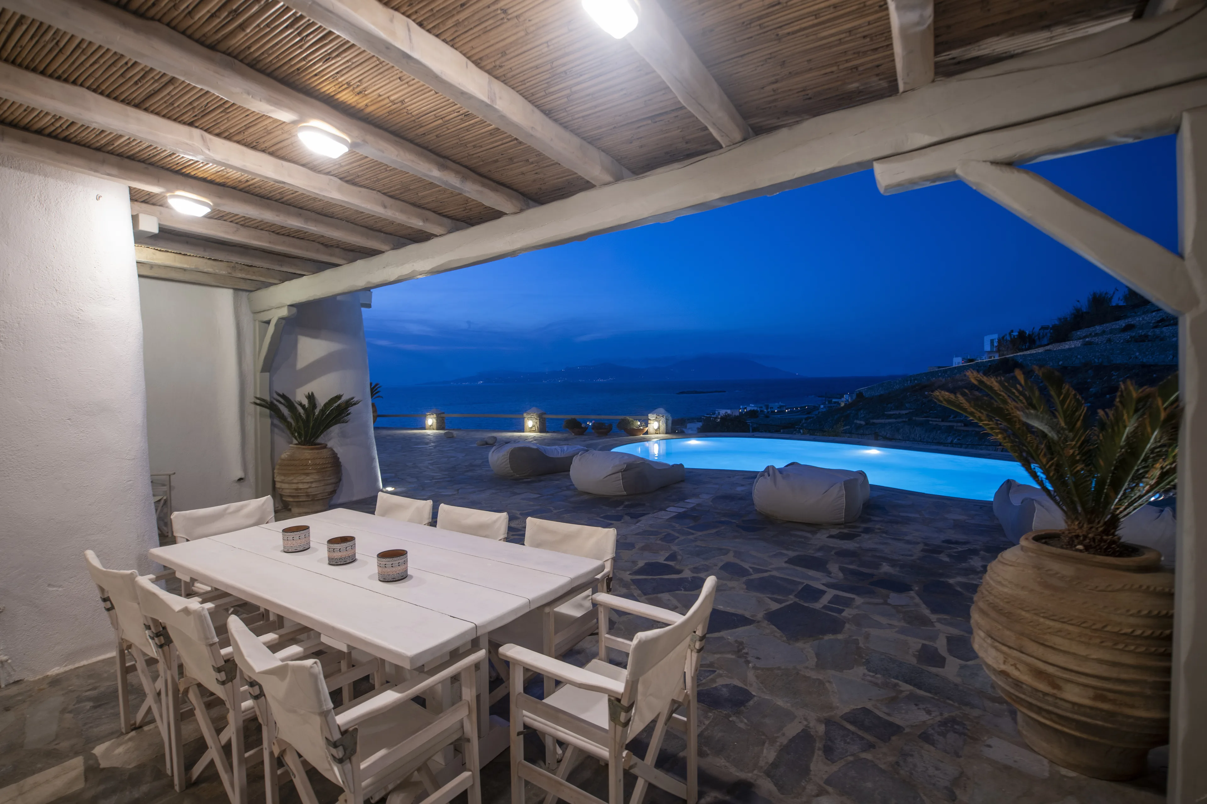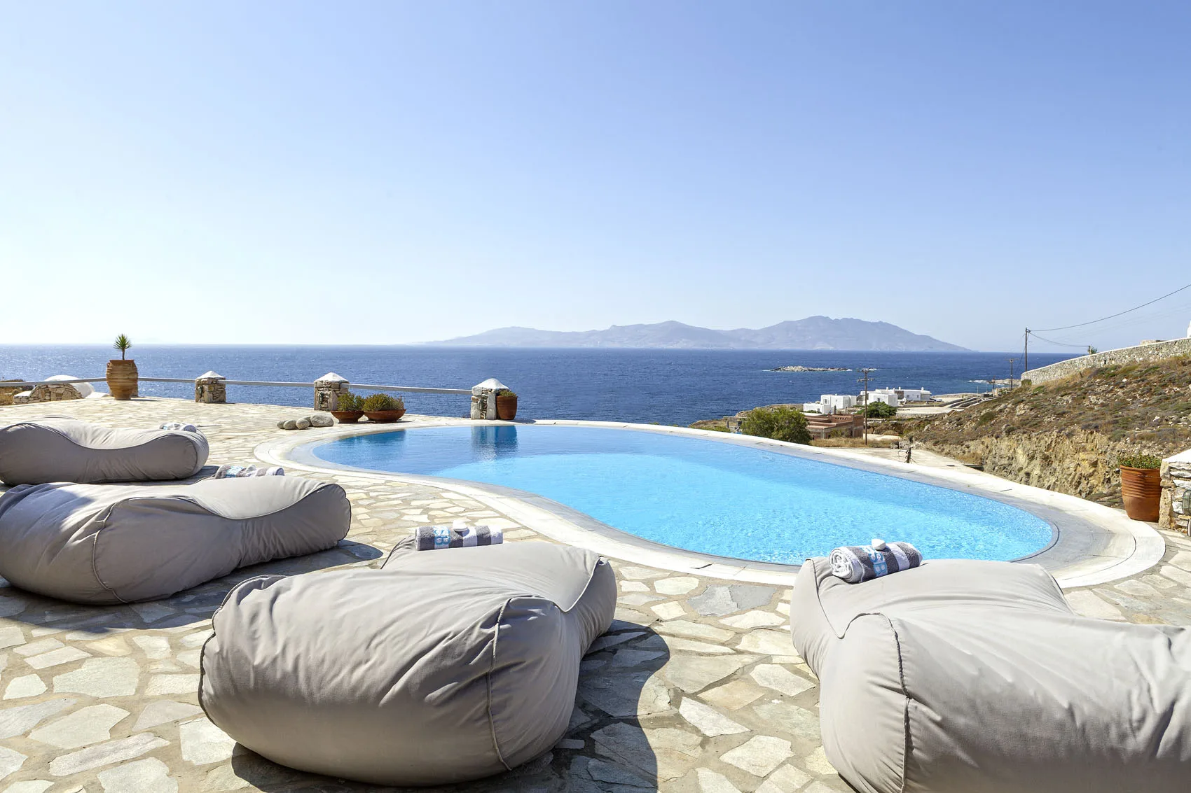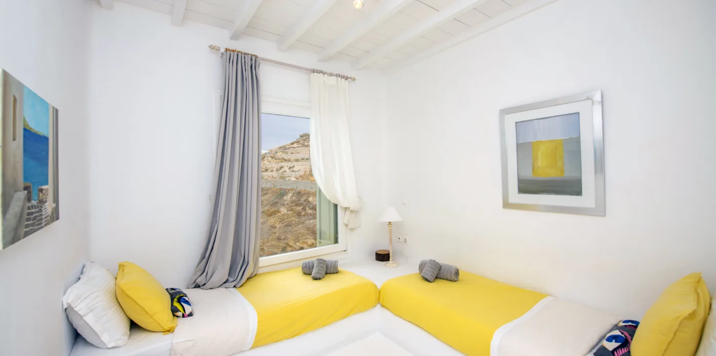 The owner’s suites on the first floor have captivating views and private balconies. All ensuite bedrooms have views over the pool and terrace, and out to the Aegean sea.