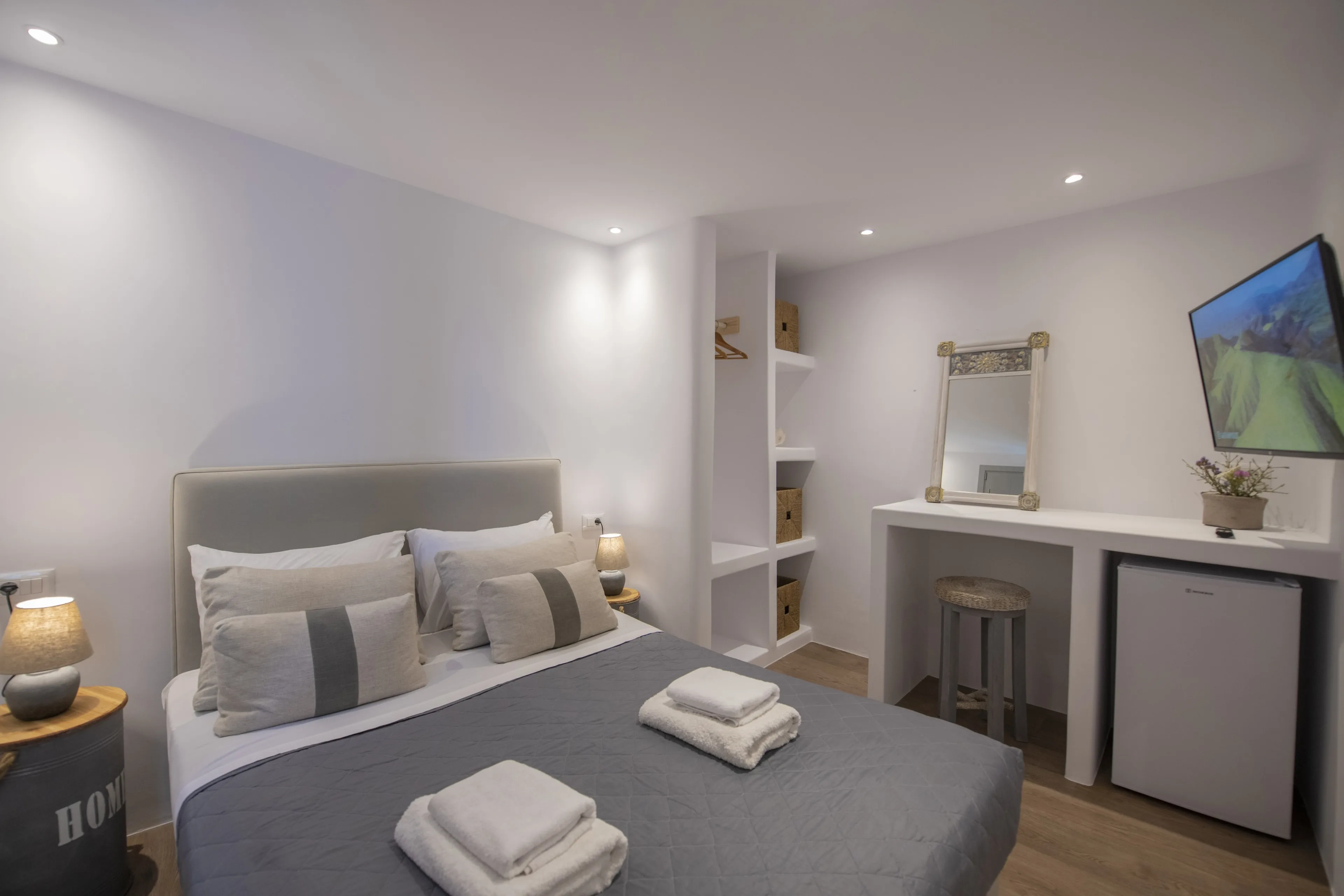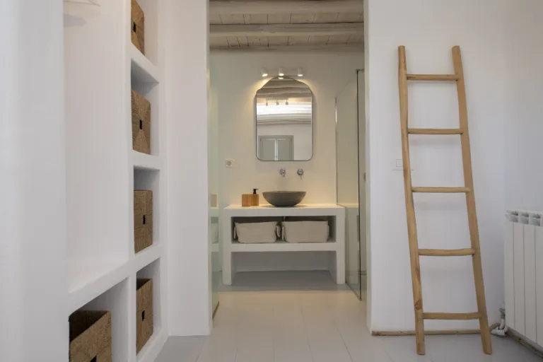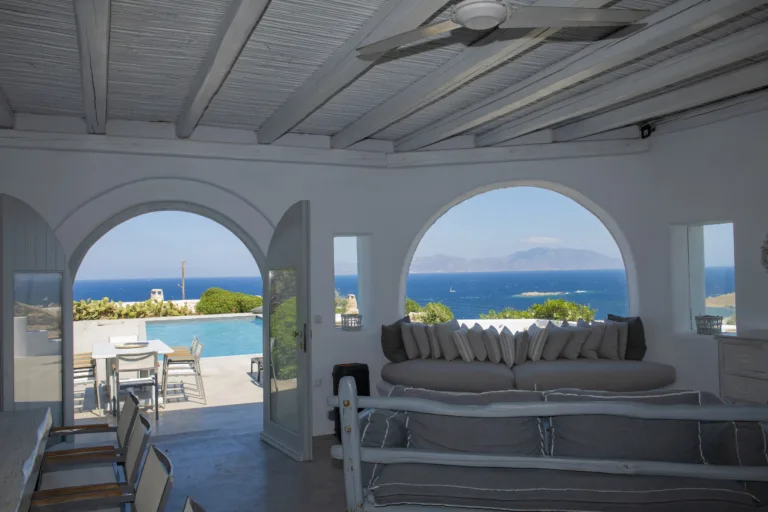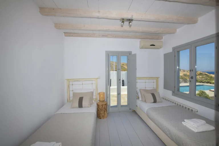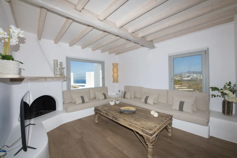 Naomi is a family haven spread over two levels. As you enter from the ground level, find yourselves in the living area, where you may dine next to the fireplace while watching spectacular sunsets. On the ground floor, there are two bedrooms. The first one has an en suite bathroom and a separate entrance to accommodate guests, and the second one has a bunk bed with an ensuite bathroom for the young residents. On the 1st floor, there are three comfortable bedrooms. The master suite and two more that share a bathroom. Each bedroom exits to its own veranda with a fantastic sea view.
