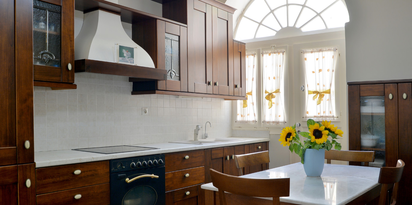 Orchestra’s building exterior was constructed with marble stonework, unique to Syros, and features distinct wooden louvered shutters that offer privacy and conveniently reflect the summer heat. The residences were fully renovated in keeping with the island’s neoclassical architectural style. Gorgeous color schemes of soft cream and dreamy blue gently accent the airy, sunlit living spaces.