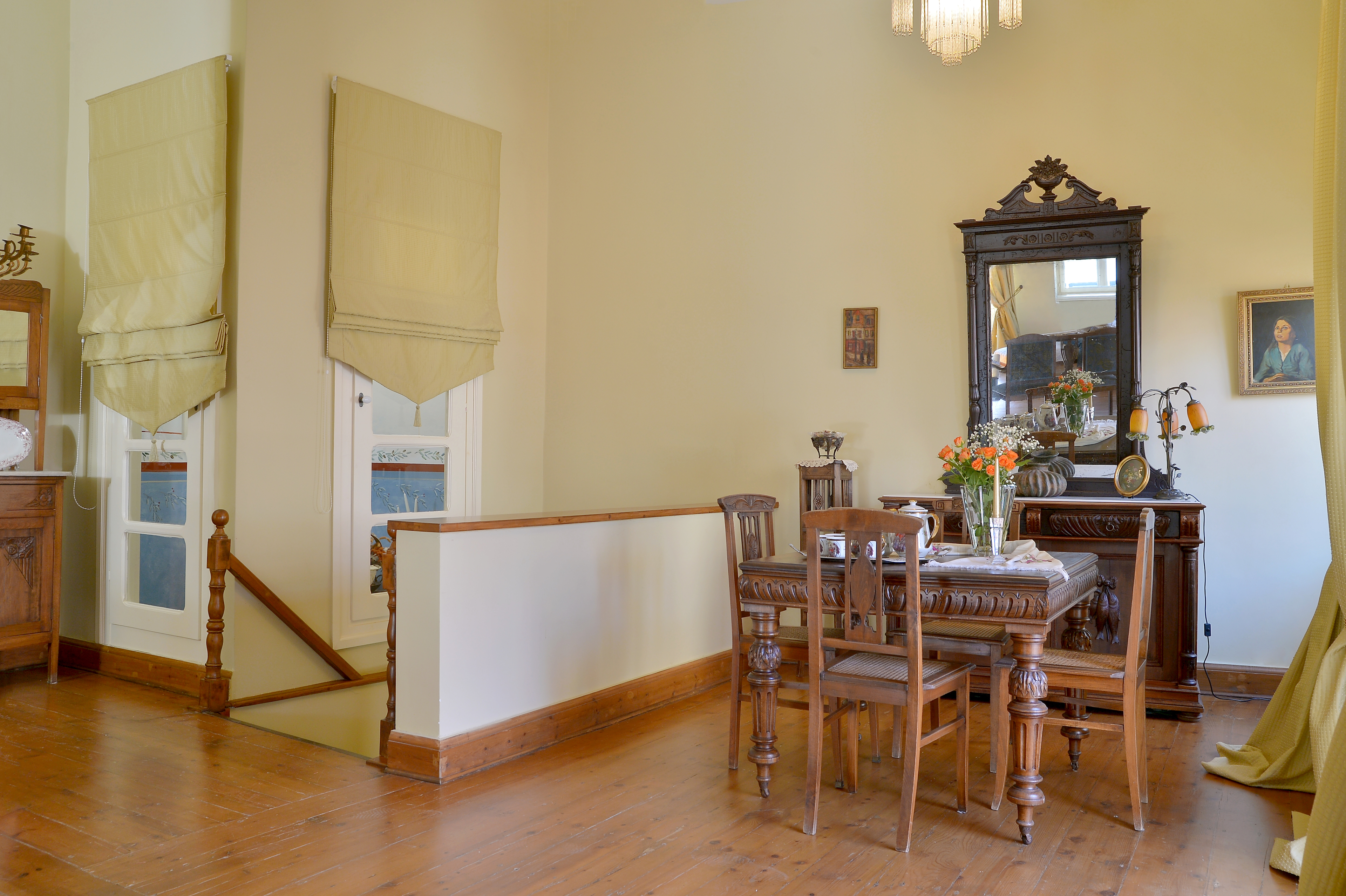 High ceilings, wood flooring, arched glass doorways and period furnishings are some of the decorative elements evoking a stately feeling.
