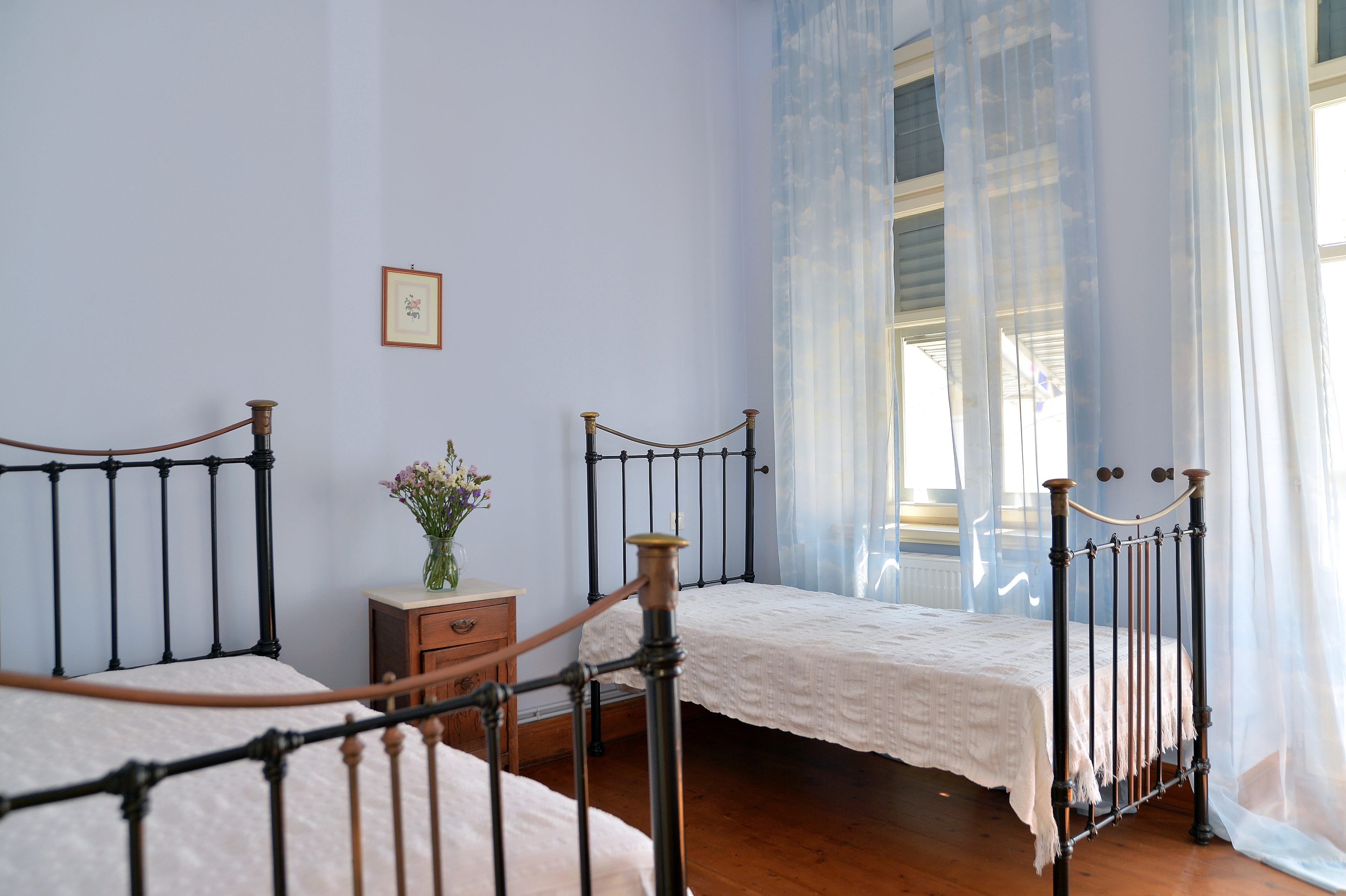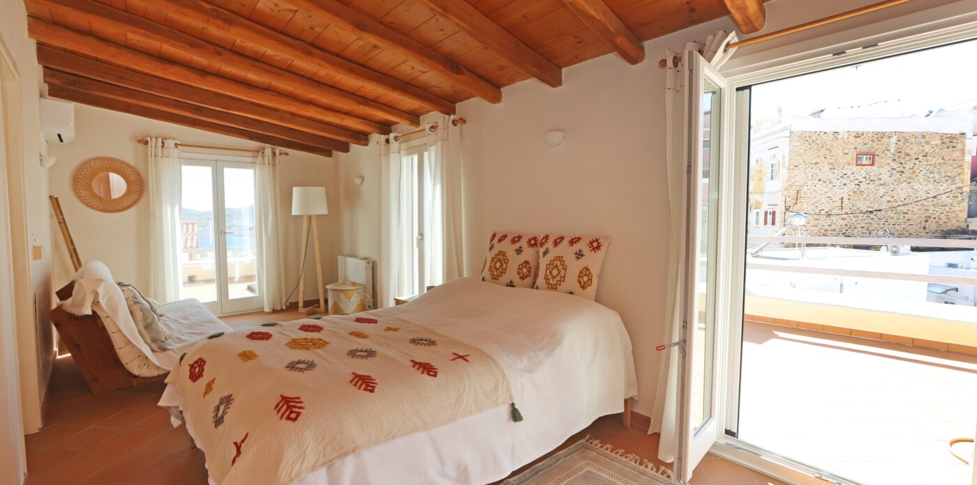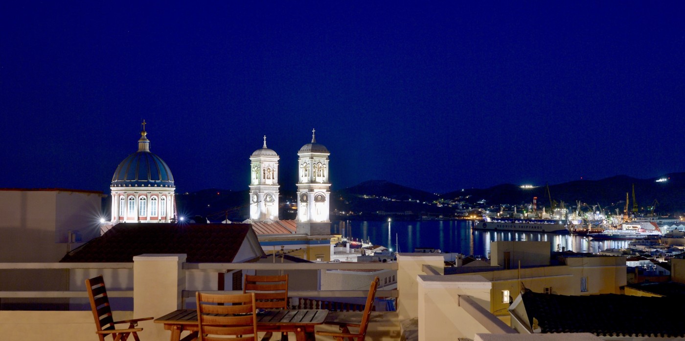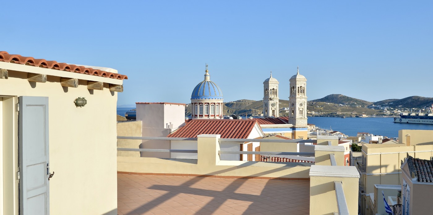 The spacious ground level residence enjoys light-filled rooms comprising two bedrooms and 1 ½ baths. It opens out onto a quaint covered courtyard. One level up is the second residence. Immediately noticeable are the four meter high ceilings with hand-painted ornamental details and the beautifully restored original wooden floors. This residence features three marble balconies with handcrafted wrought iron railings. An internal staircase leads up to the rooftop, a recent addition, which can be used as a guest suite, art studio or just a space to retreat to. The terrace offers postcard views of Syros harbor and the nearby islands of Mykonos, Delos and Tinos that are impressive any time of day and night.