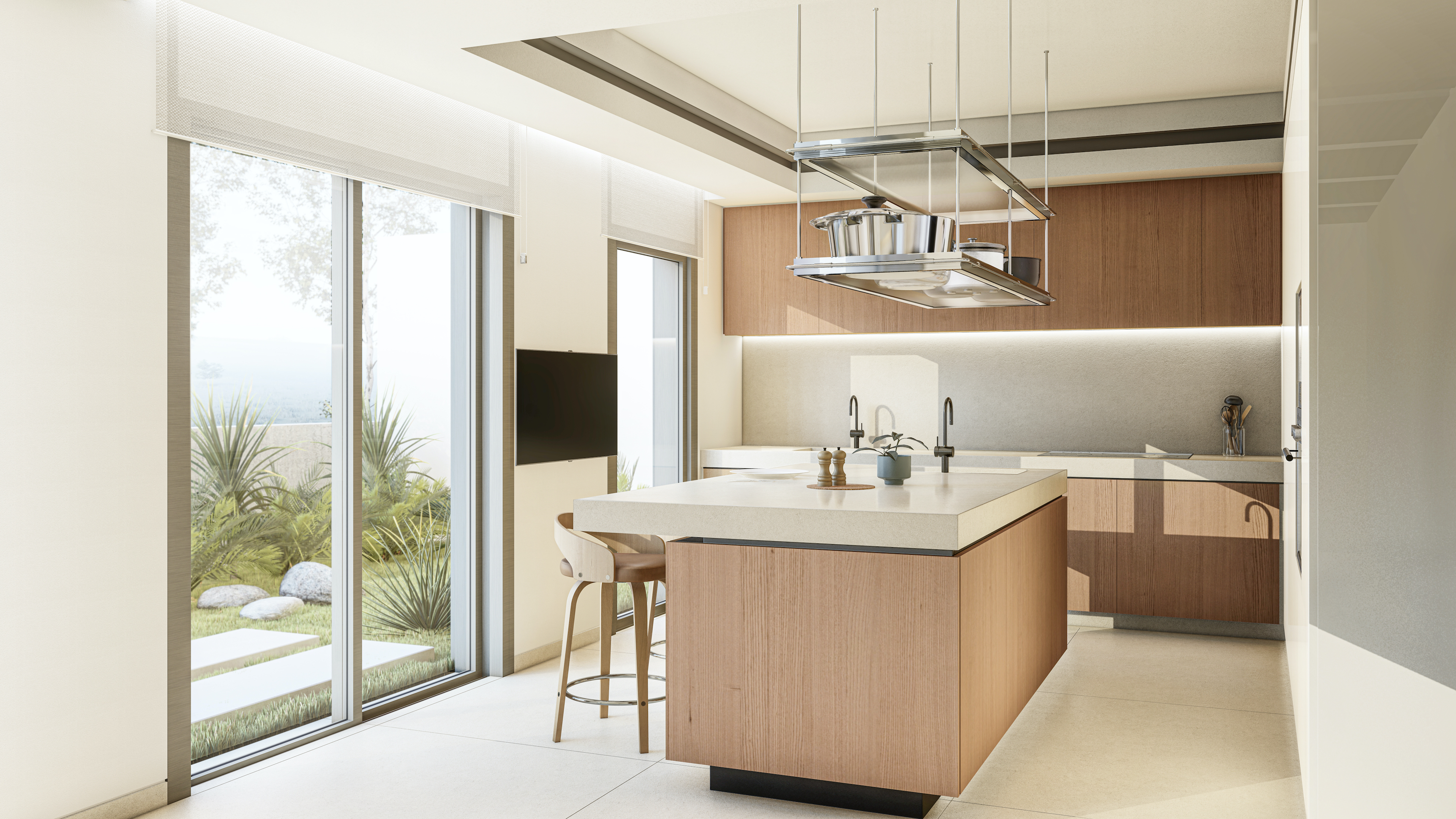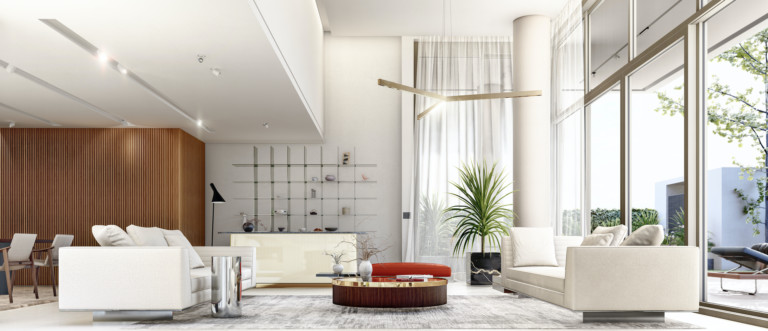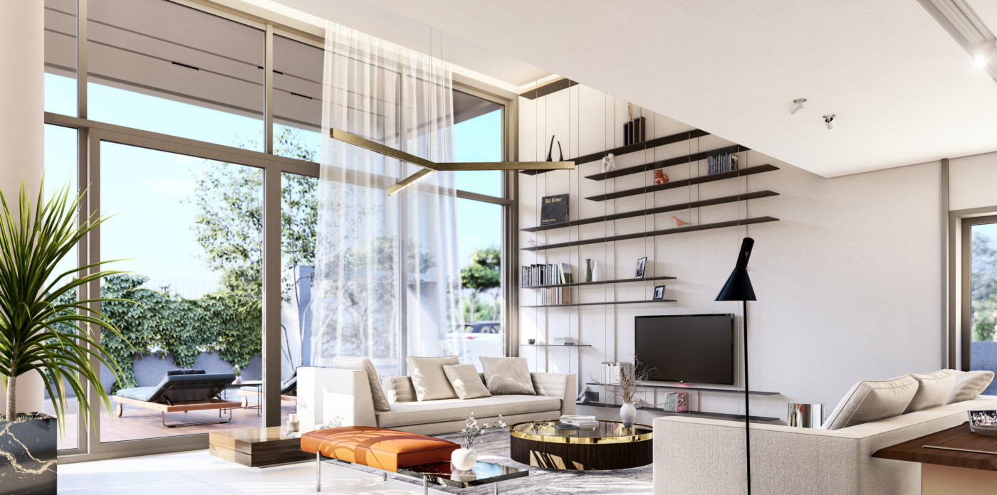 It has an impressive double ceiling height with oversized floor to ceiling glass doors. These large glass doors offer a beautiful view to the garden and the swimming pool and allow an abundance of natural light and superb sense of openness.