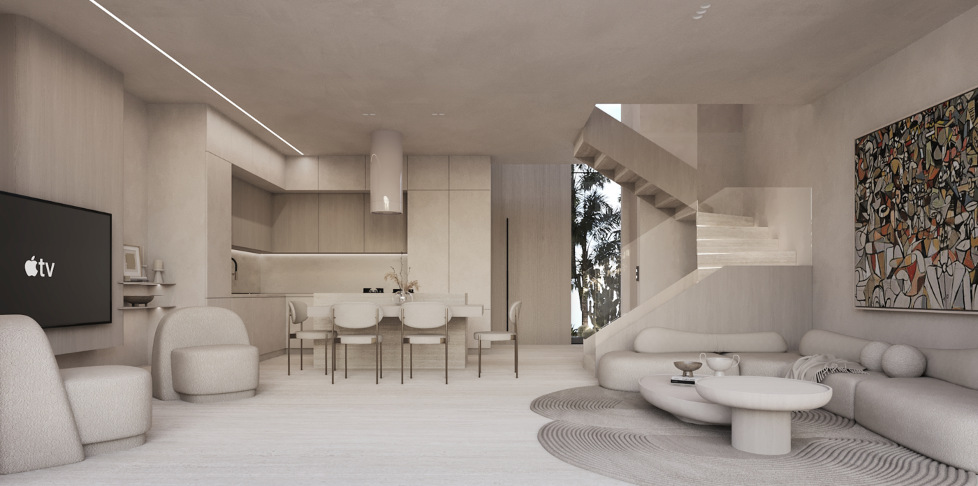 The entirety of Payton’s 290 square meters evokes a feeling of tranquility. Luxe beige interiors, a glass-mounted swimming pool and a harmonious connection with nature are the maisonette’s defining features. Large floor-to-ceiling windows let in Greece’s quintessential sunshine for optimal natural light while also brilliantly highlighting every first-class detail.