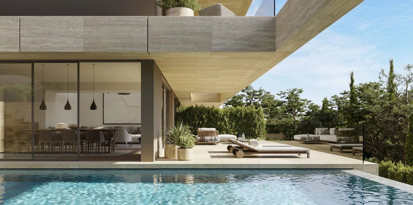 The property’s layout follows the natural slope of the terrain, with carefully crafted spaces for dining, kitchen, pantry, and a guest cloakroom. The living room is a grand space on two levels with a welcoming atmosphere and large windows opening to the outdoor pool area.