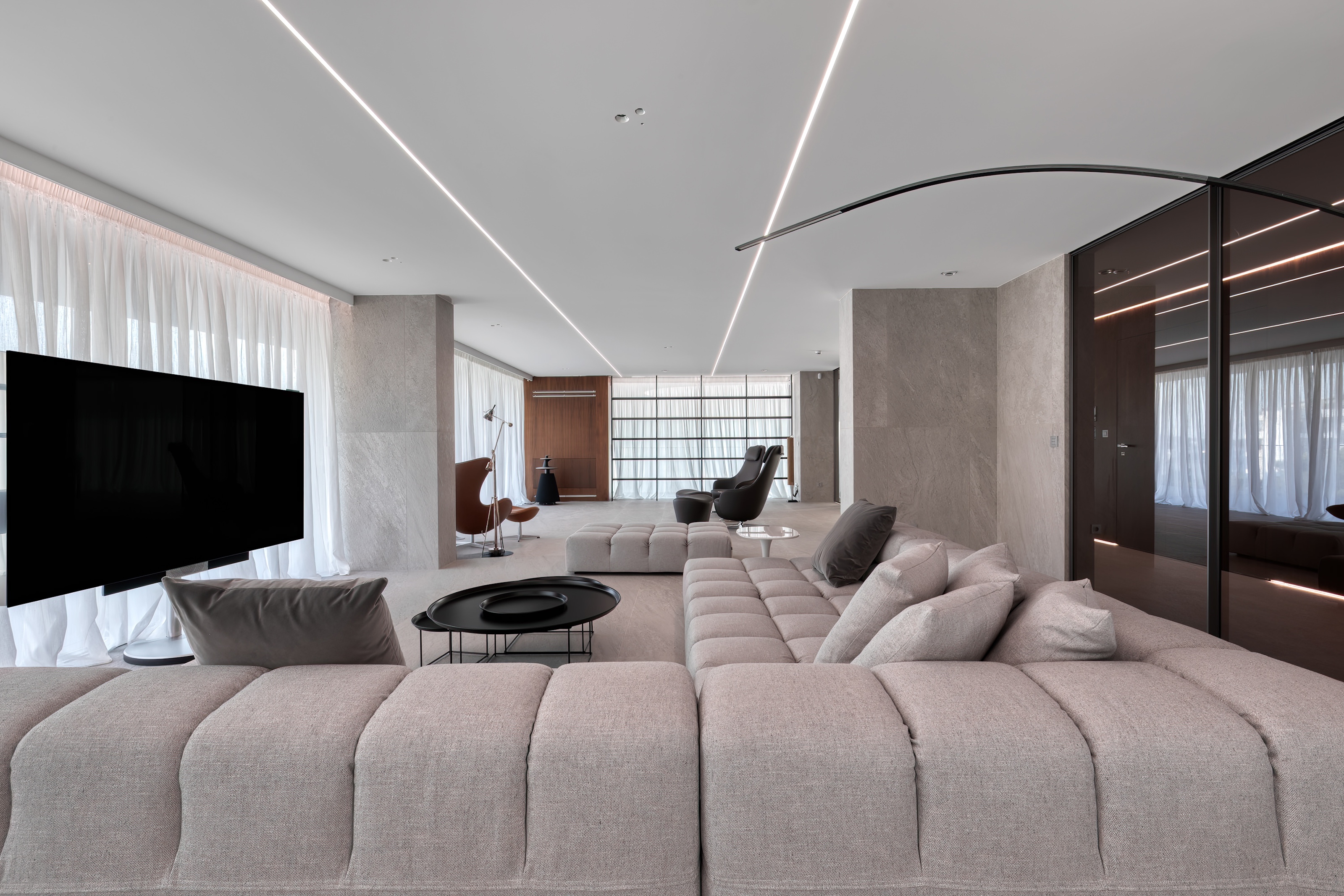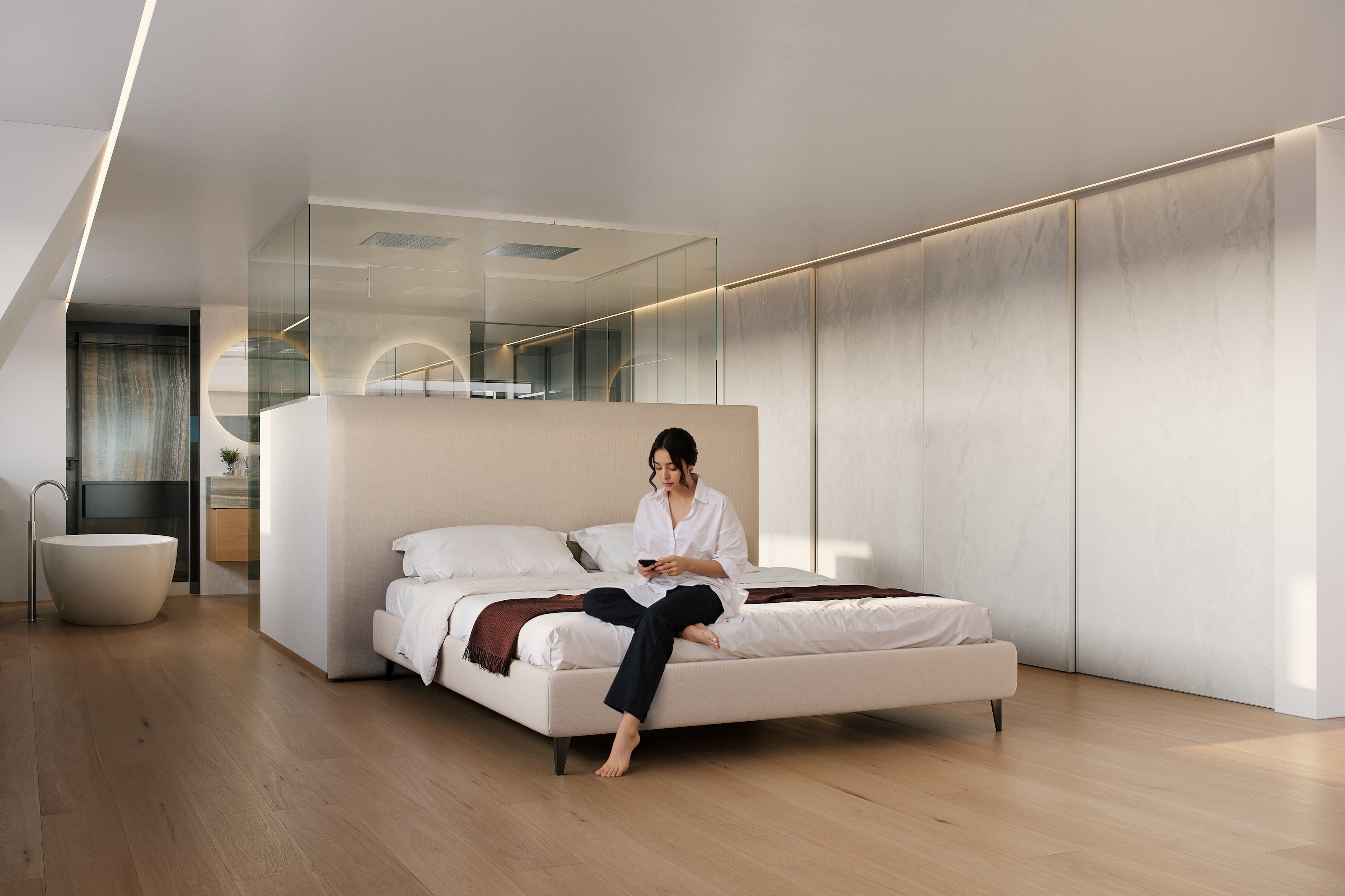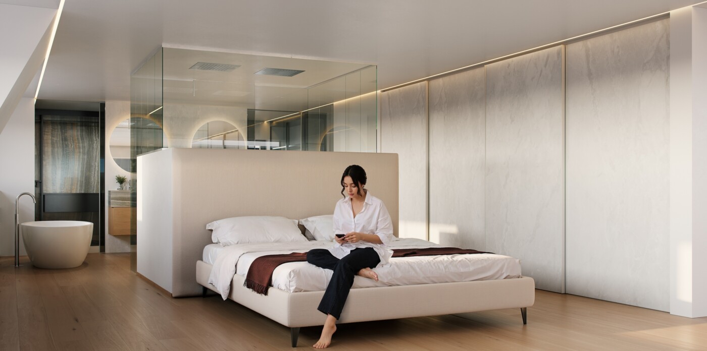 The lighting throughout the penthouse is meticulously designed with dim-to-warm features, allowing you to adjust the ambiance to suit any occasion, whether it be a bright morning or a cozy evening.