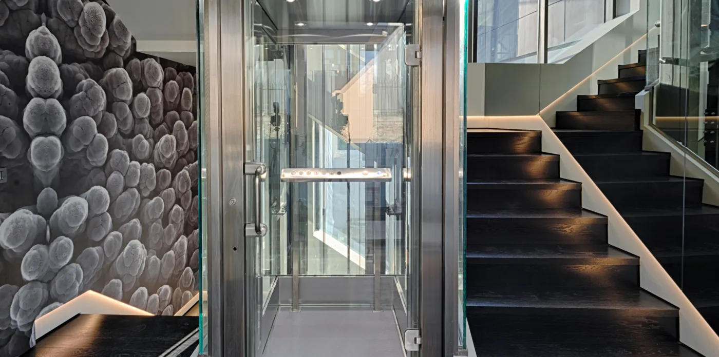 The central hub of the abode features an internal glass elevator with a skylight that brings in an array of iridescent light. This design element adds to the warm and inviting ambience of the property.