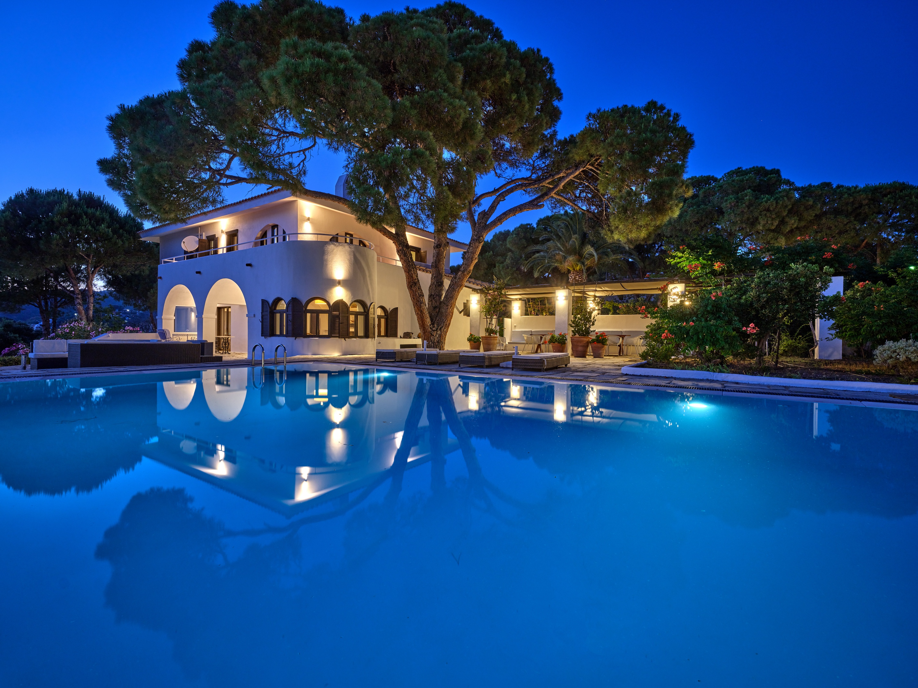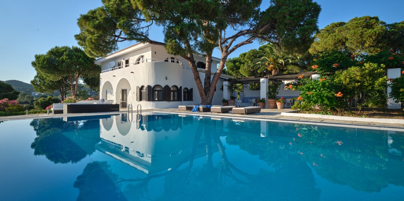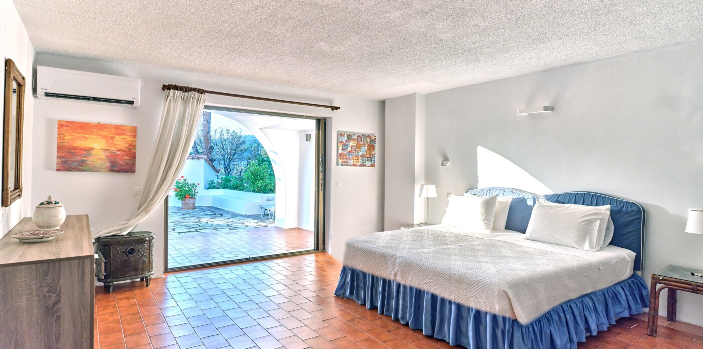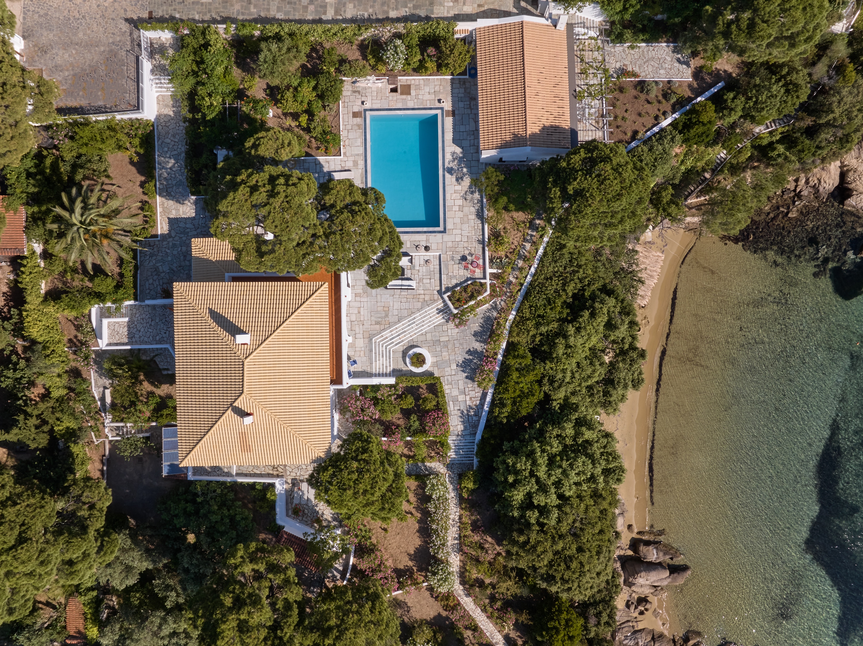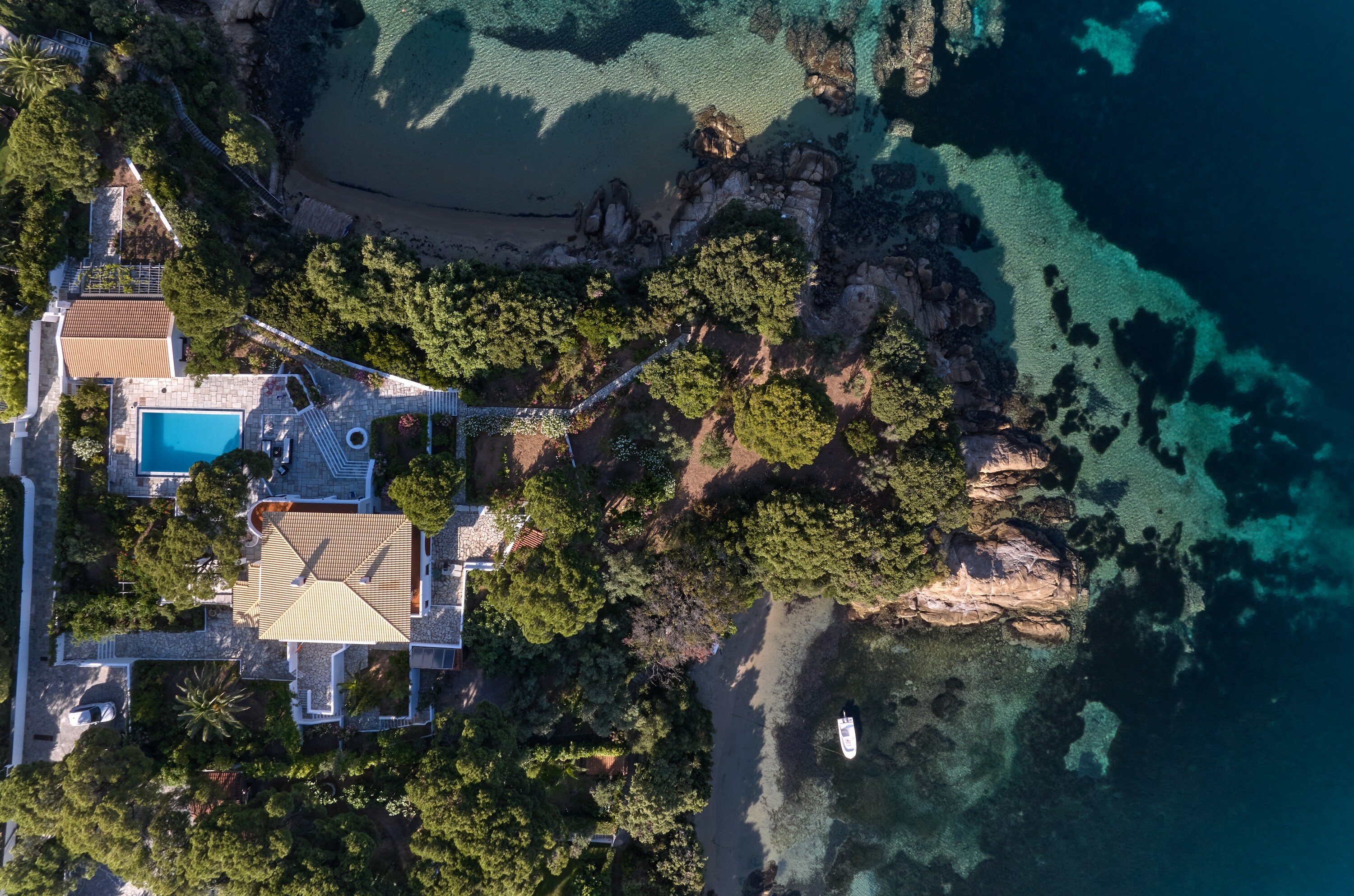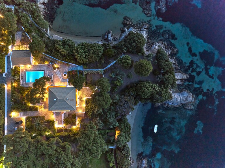 Stroll through shaded pathways lined with aromatic lavender and rosemary, their soothing scents filling the air. Discover hidden corners shaded by majestic pine trees, where you can lose yourself in quiet contemplation, or simply unwind by the private swimming pool, surrounded by olive and cypress trees, their rustling leaves creating a gentle melody as you gaze upon the turquoise waters below.
