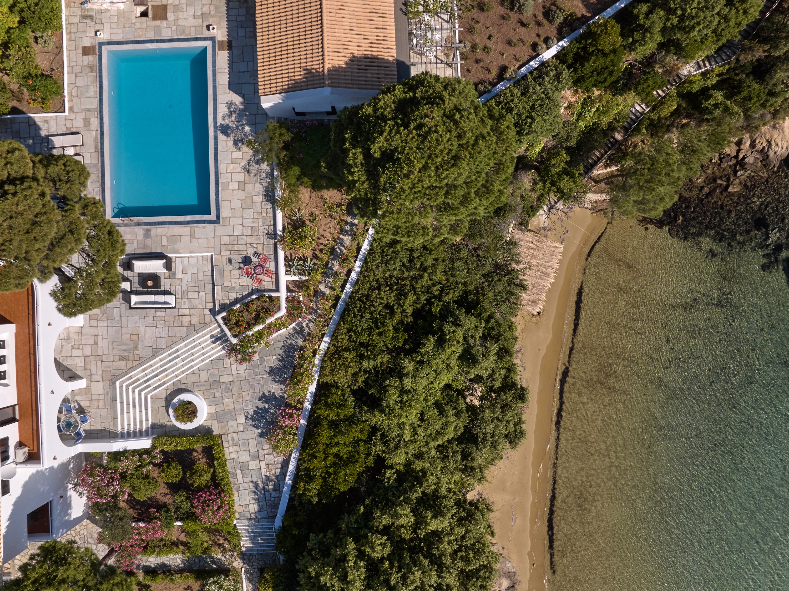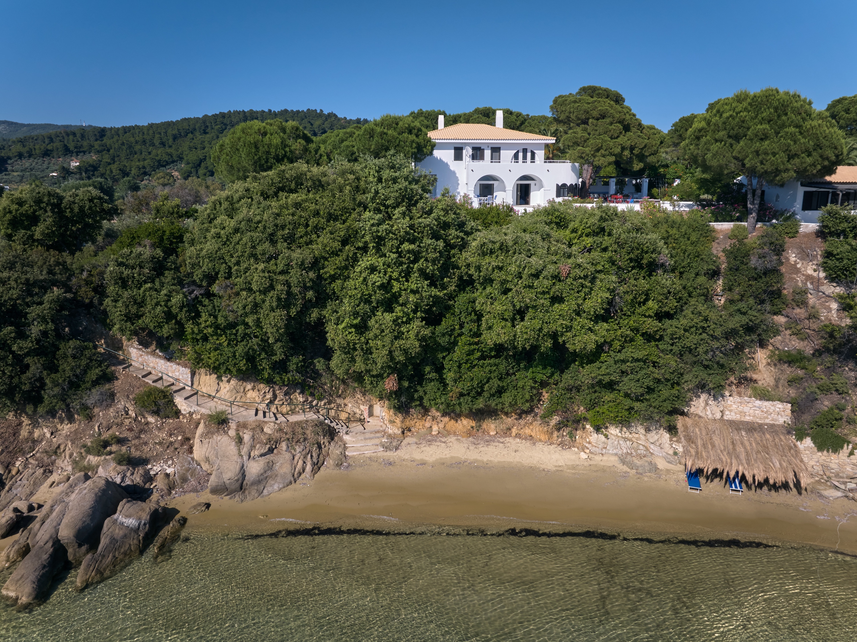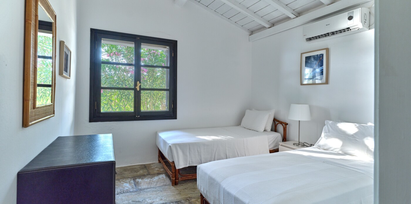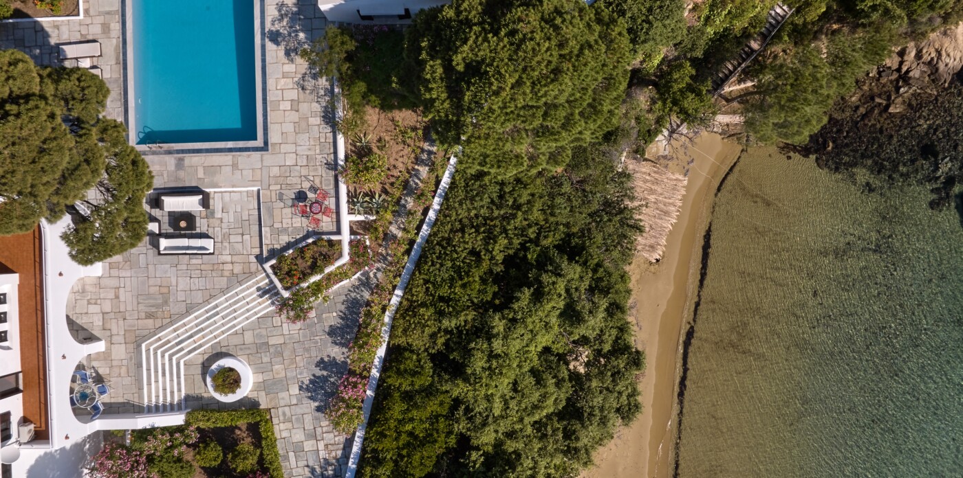 Descend private paths that wind gently down from the villa, and you’ll find yourself on not one, but two secluded sandy beaches