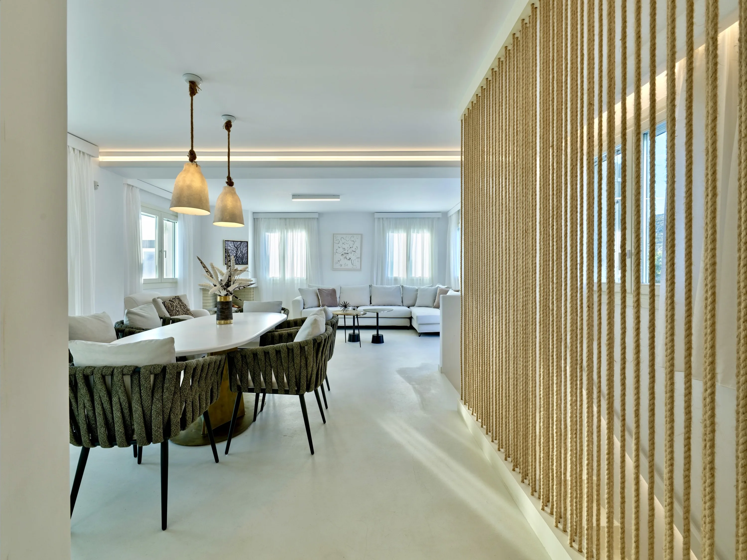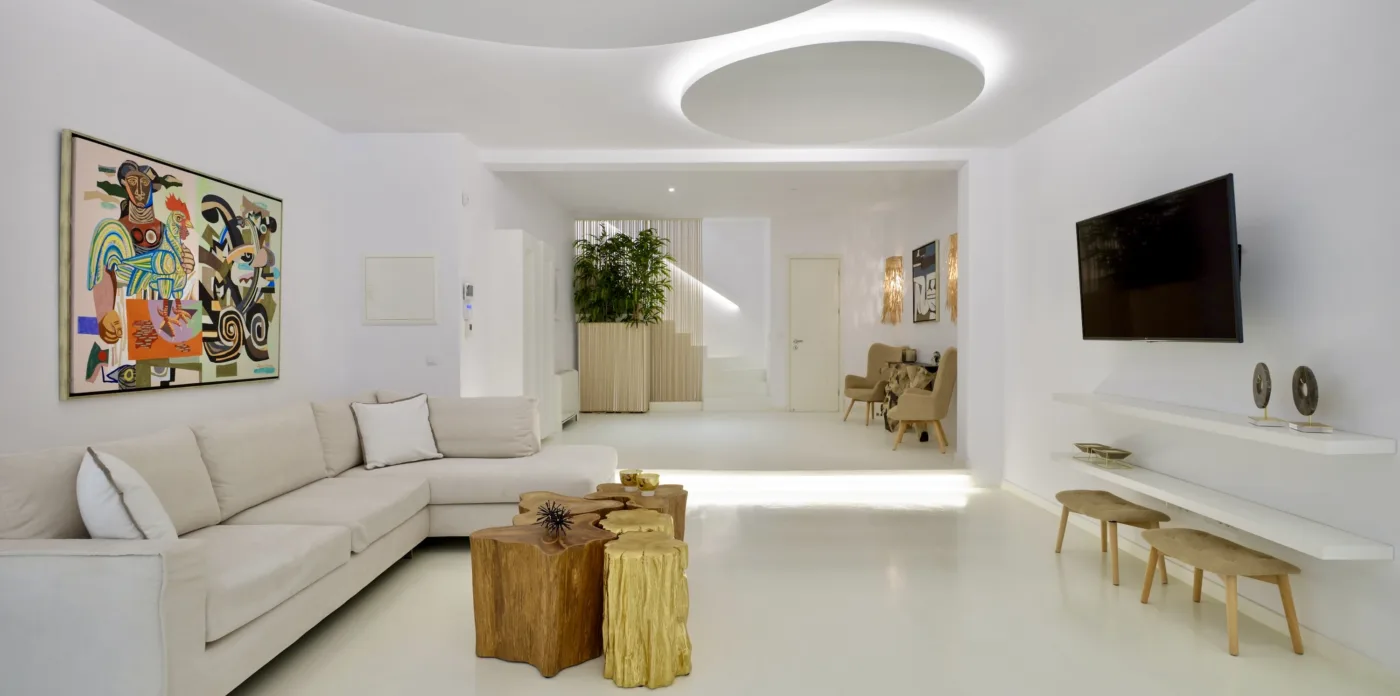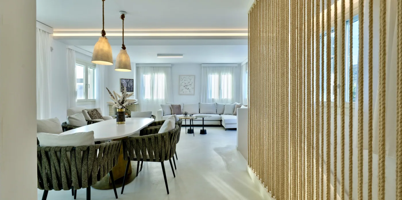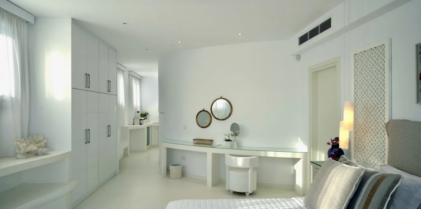 The interior colour palette creates a relaxed atmosphere, each shade carefully chosen to complement the space and enhance the ambience. The design draws inspiration from Cycladic aesthetics, every detail carefully considered to create a cohesive and striking overall effect. The result is perfect for anyone who values simplicity and beauty.