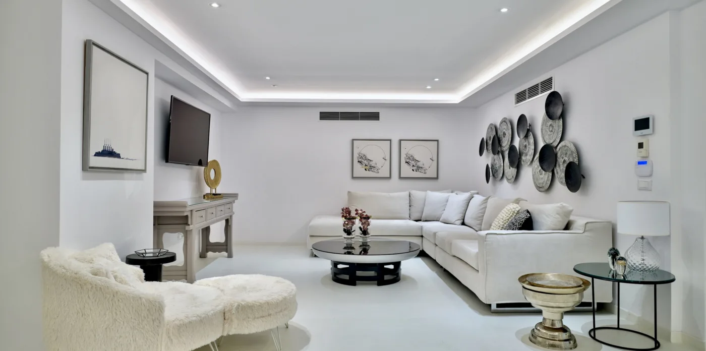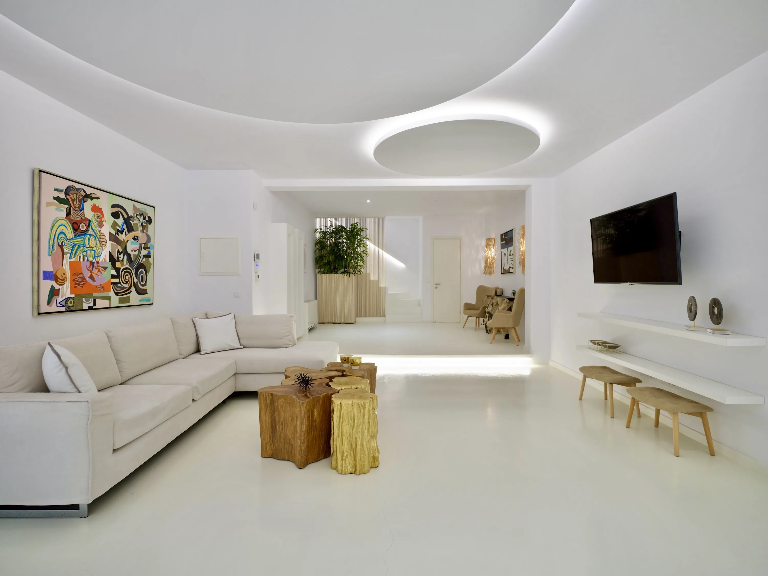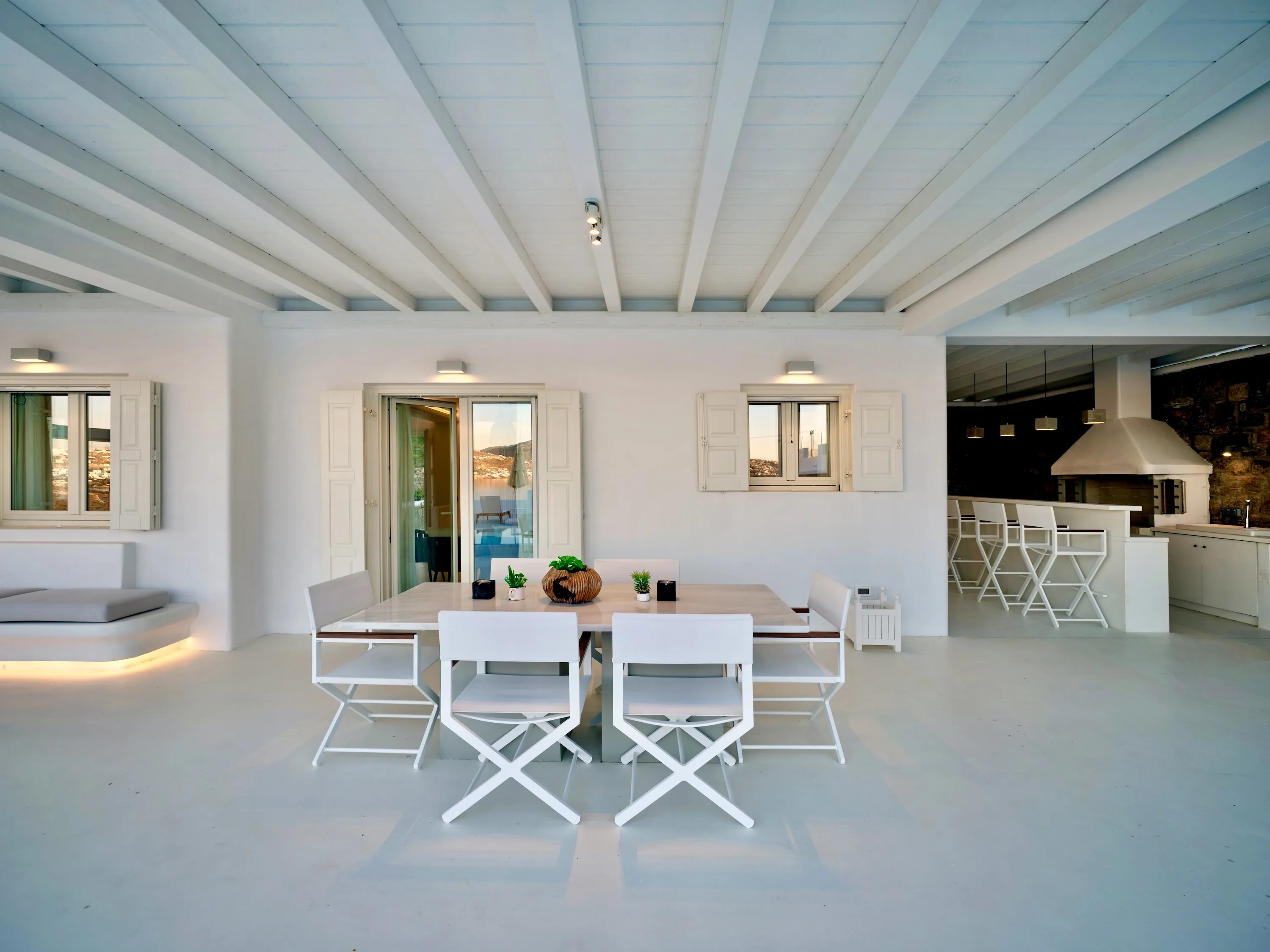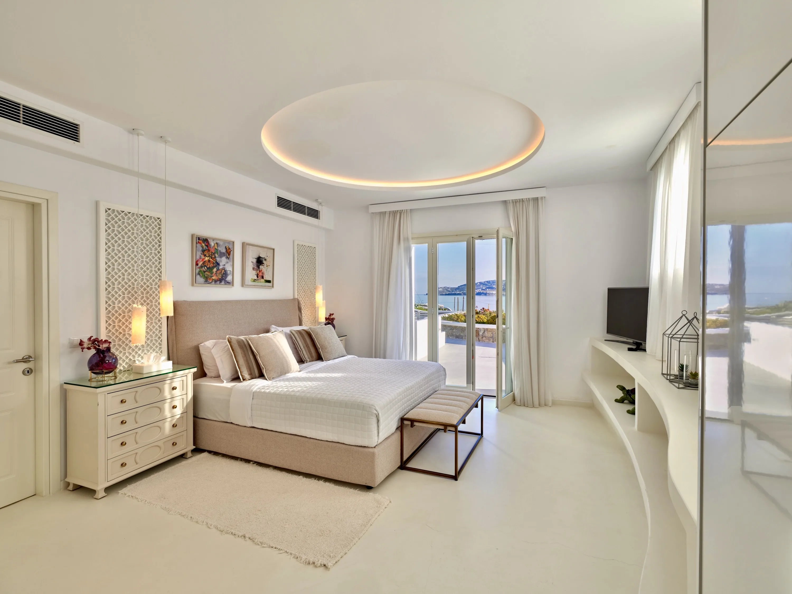 The interior colour palette creates a relaxed atmosphere, each shade carefully chosen to complement the space and enhance the ambience. The design draws inspiration from Cycladic aesthetics, every detail carefully considered to create a cohesive and striking overall effect. The result is perfect for anyone who values simplicity and beauty.