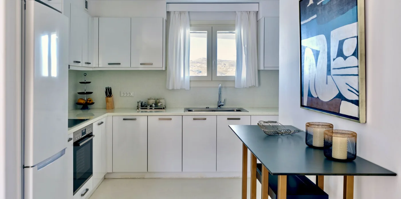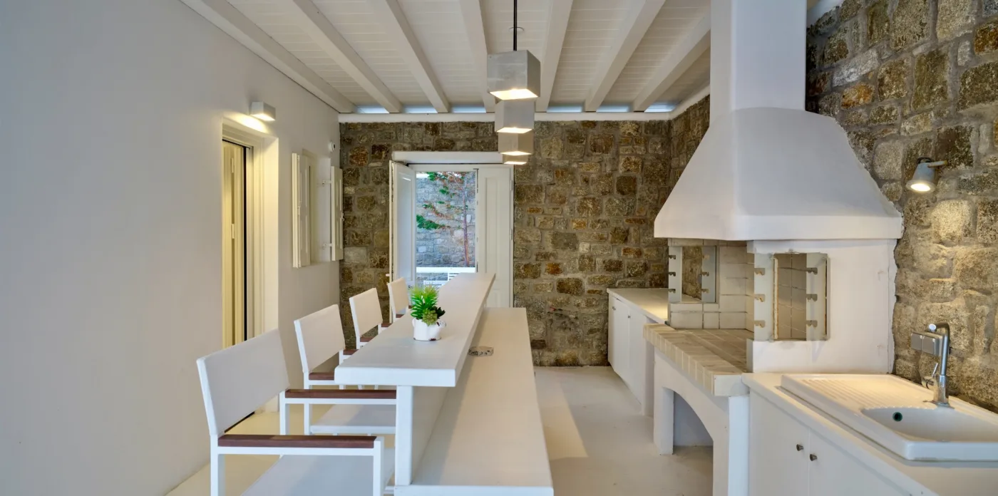 For those who love outdoor living, they are in for a treat. Each villa has two independent terraces, with the upper-level terrace being an extension of the living room. Boasting a private swimming pool, a bar, and a BBQ corner, Virtuoso creates the perfect space for savoring the beautiful sunsets and soaking up the sun while admiring the magnificent views of the Aegean Sea.