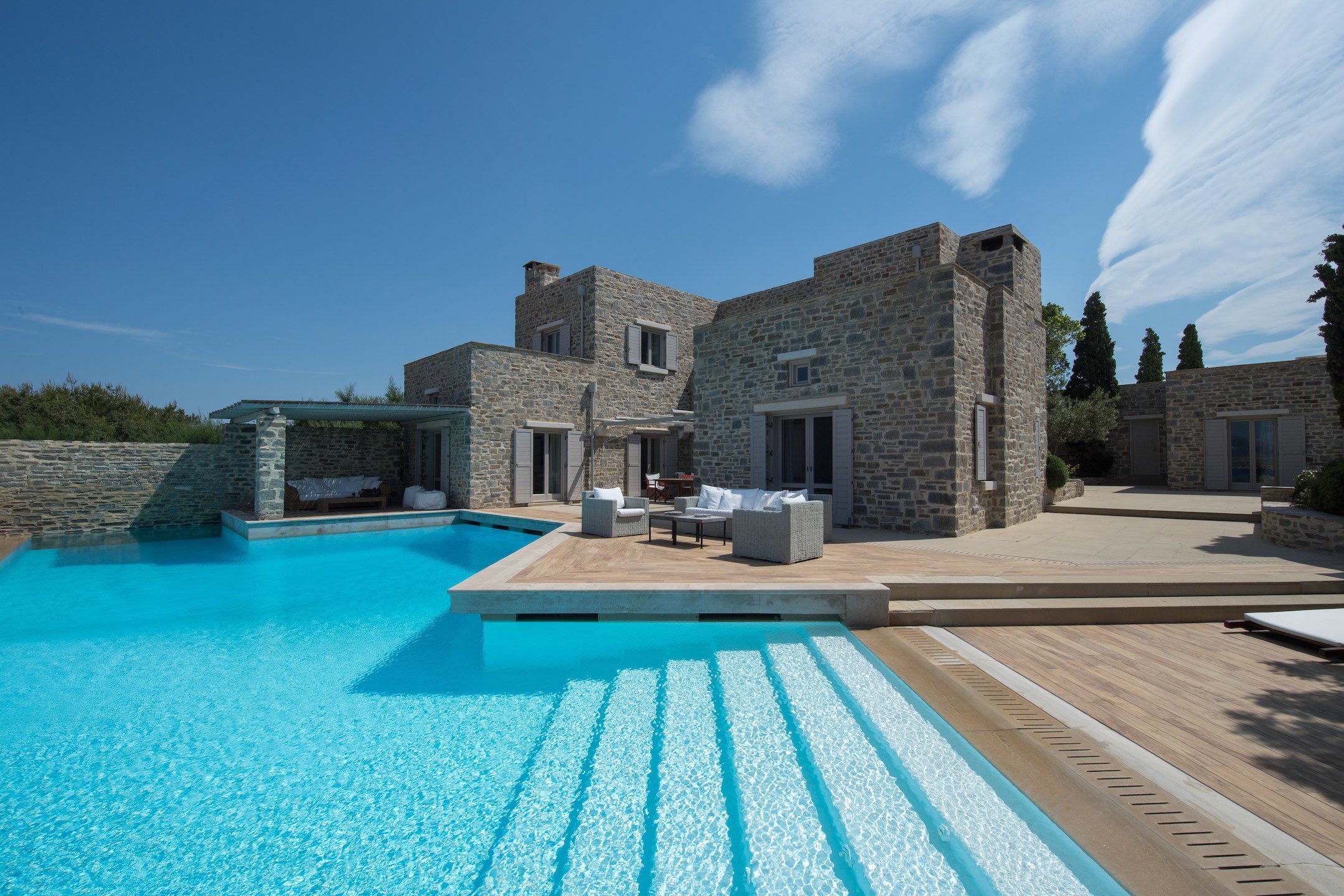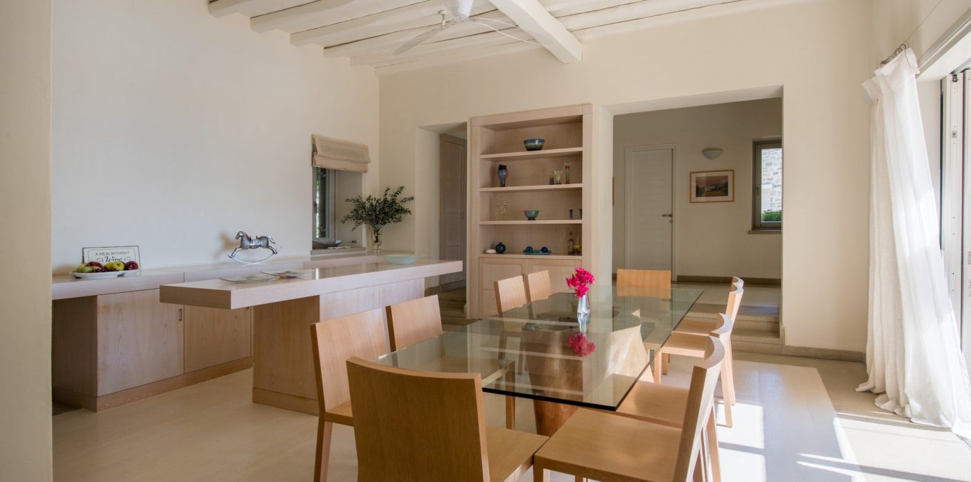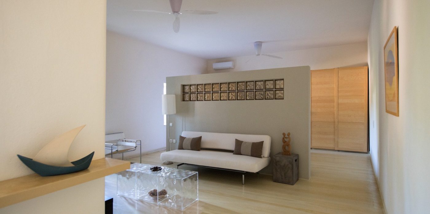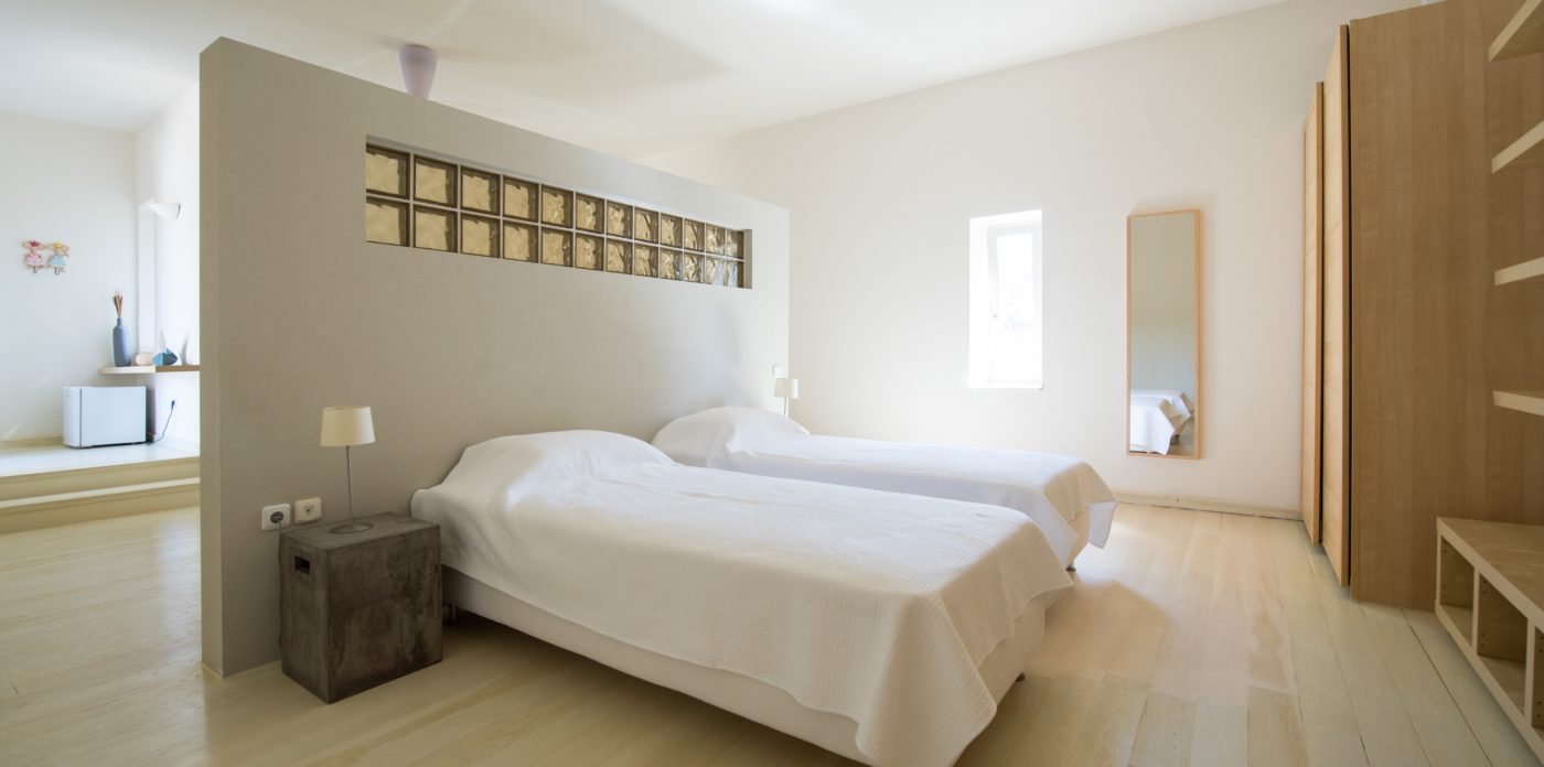 The property of 546 sq.m ( plus 258 sq.m auxiliary areas ) offers several types of accommodation and in several levels. You may choose among the main house, the independent guesthouse or the guest suite sleeping in a total of 12 guests. All offer clean lines and modern furnishings with warm colours as the owner has chosen neutral tones and wood as the dominant material.