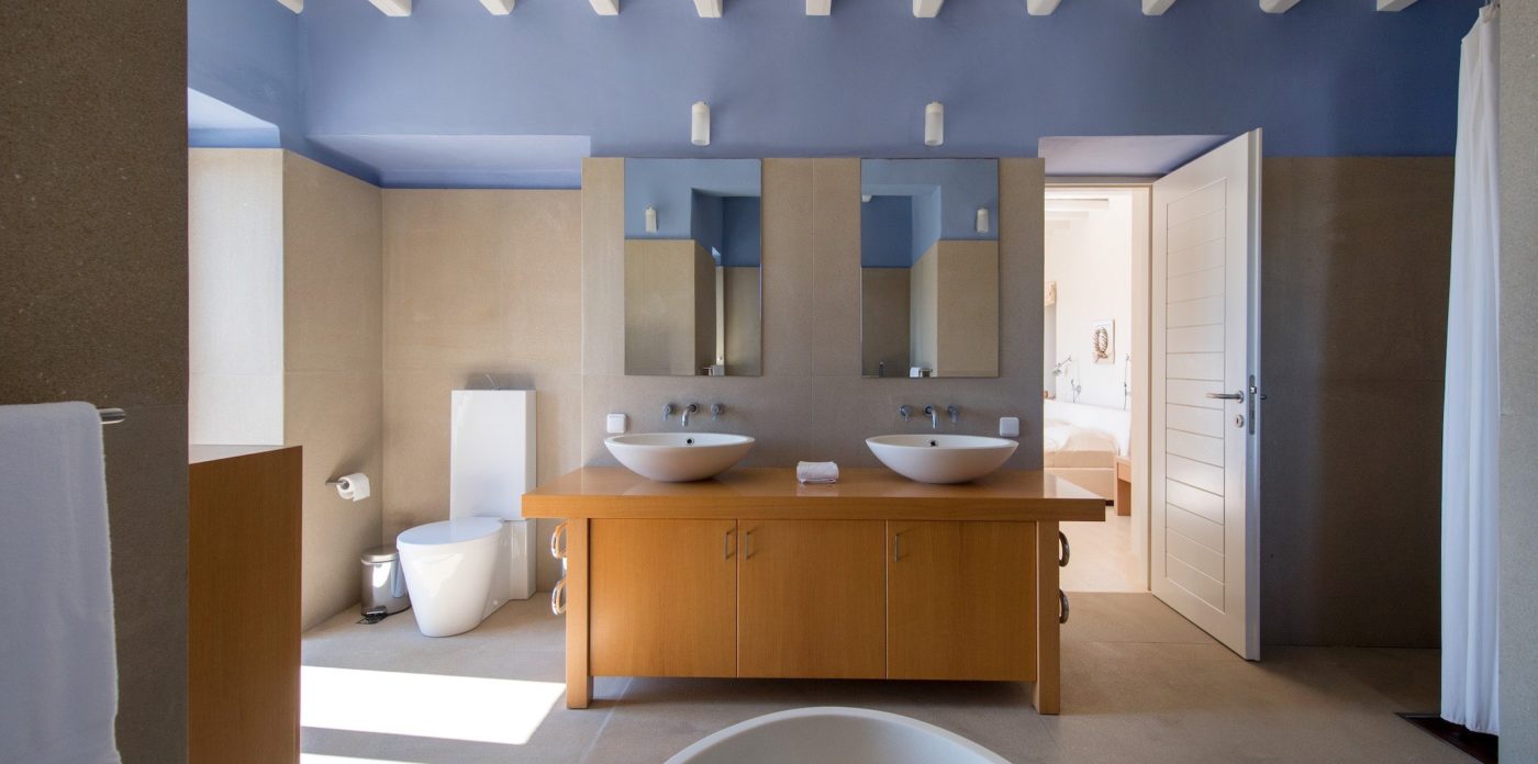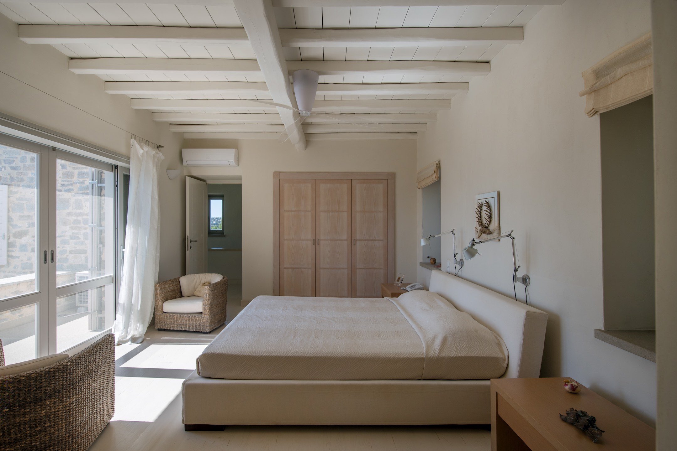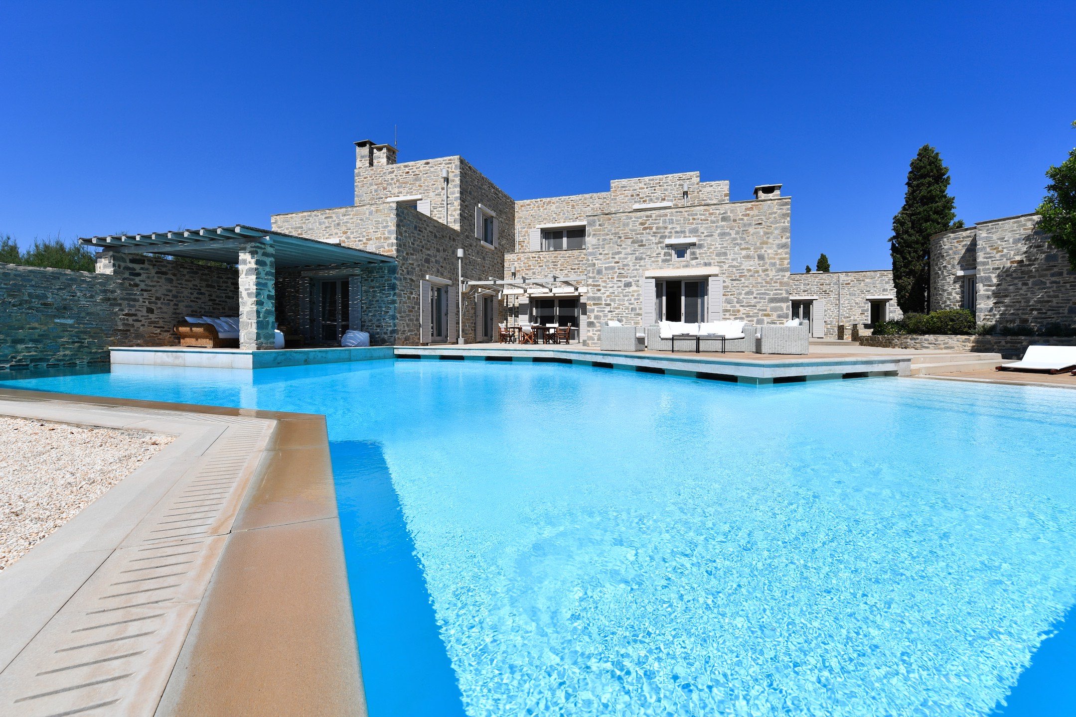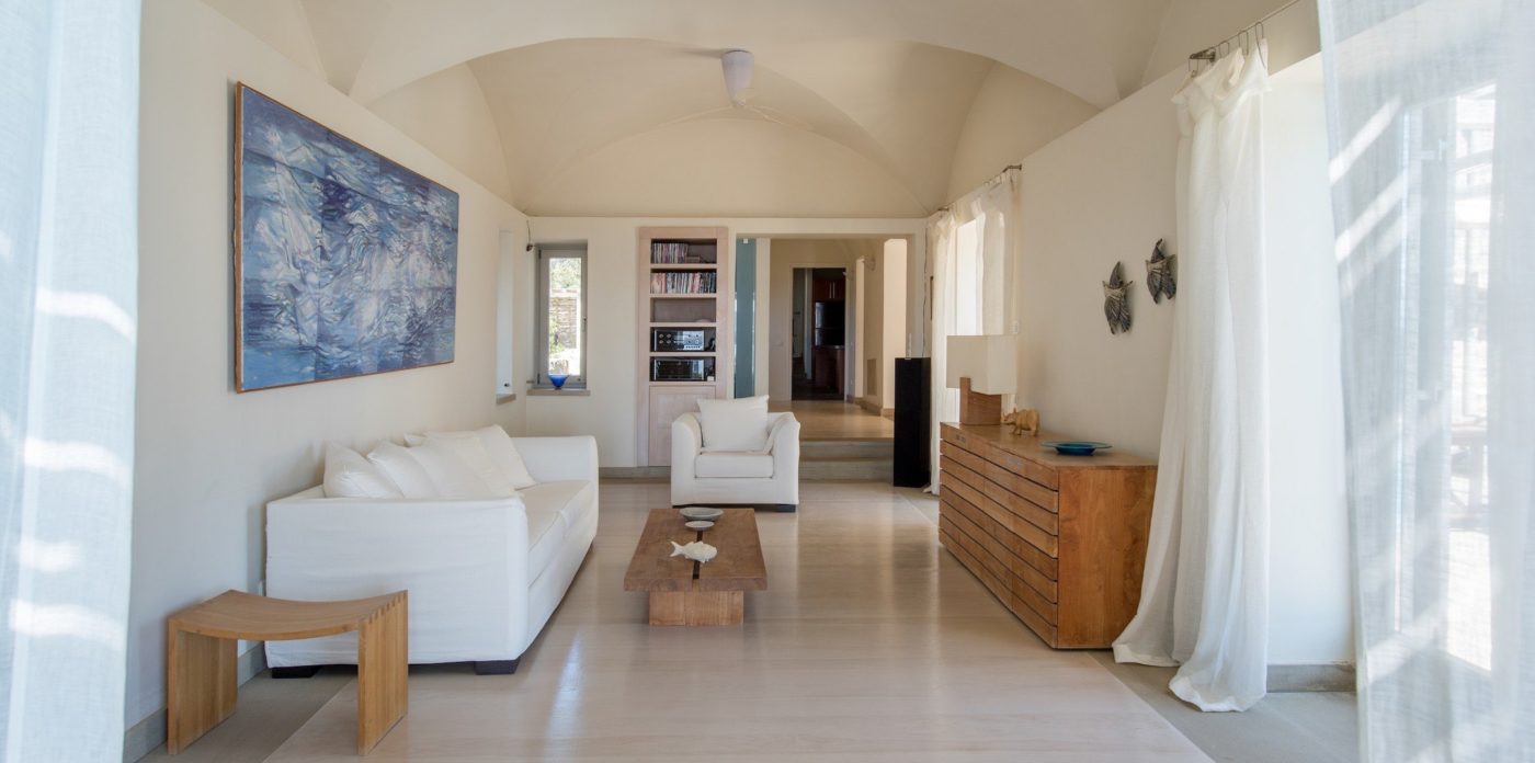 The property of 546 sq.m ( plus 258 sq.m auxiliary areas ) offers several types of accommodation and in several levels. You may choose among the main house, the independent guesthouse or the guest suite sleeping in a total of 12 guests. All offer clean lines and modern furnishings with warm colours as the owner has chosen neutral tones and wood as the dominant material.