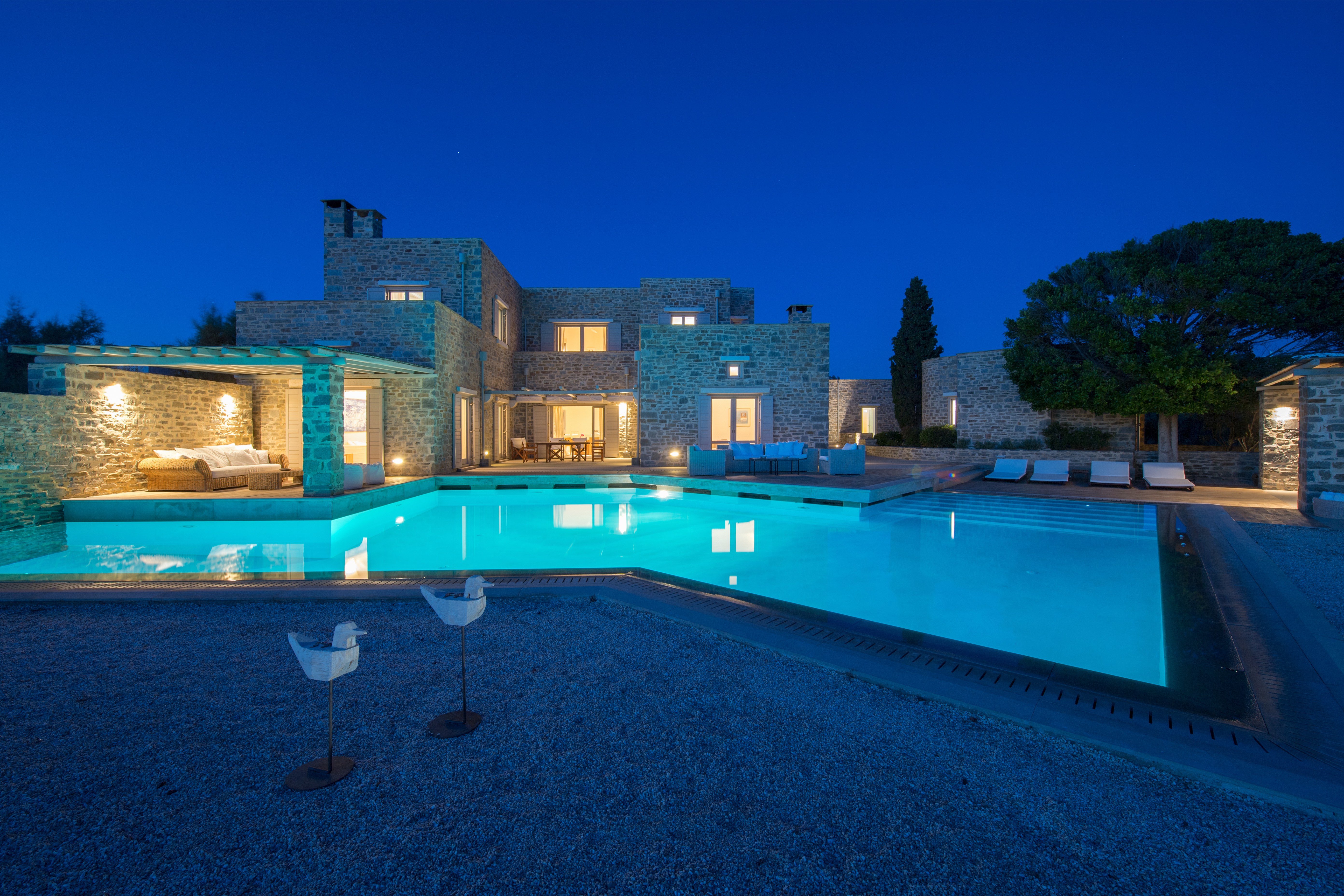 Its minimalistic stone exterior is in contrast with the dominant white and blue of the Cycladic scenery and that feature makes its architecture and designs unique.