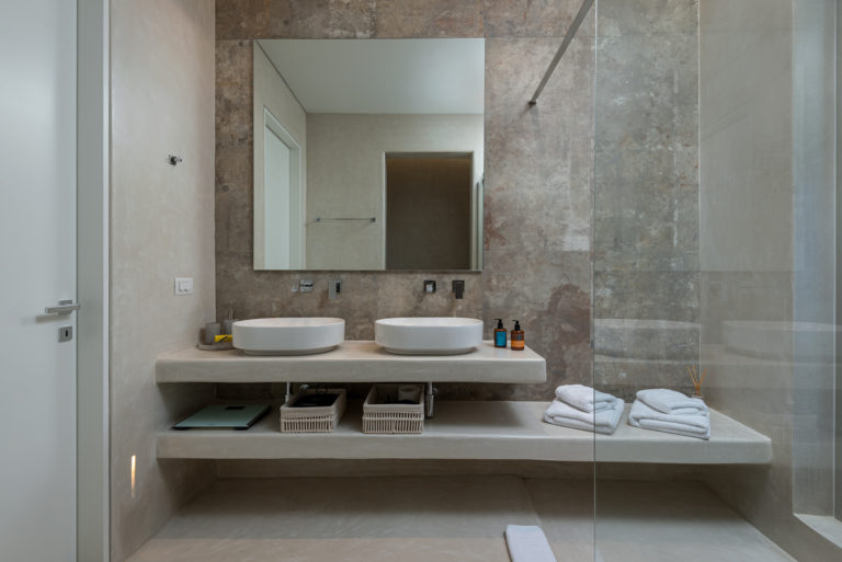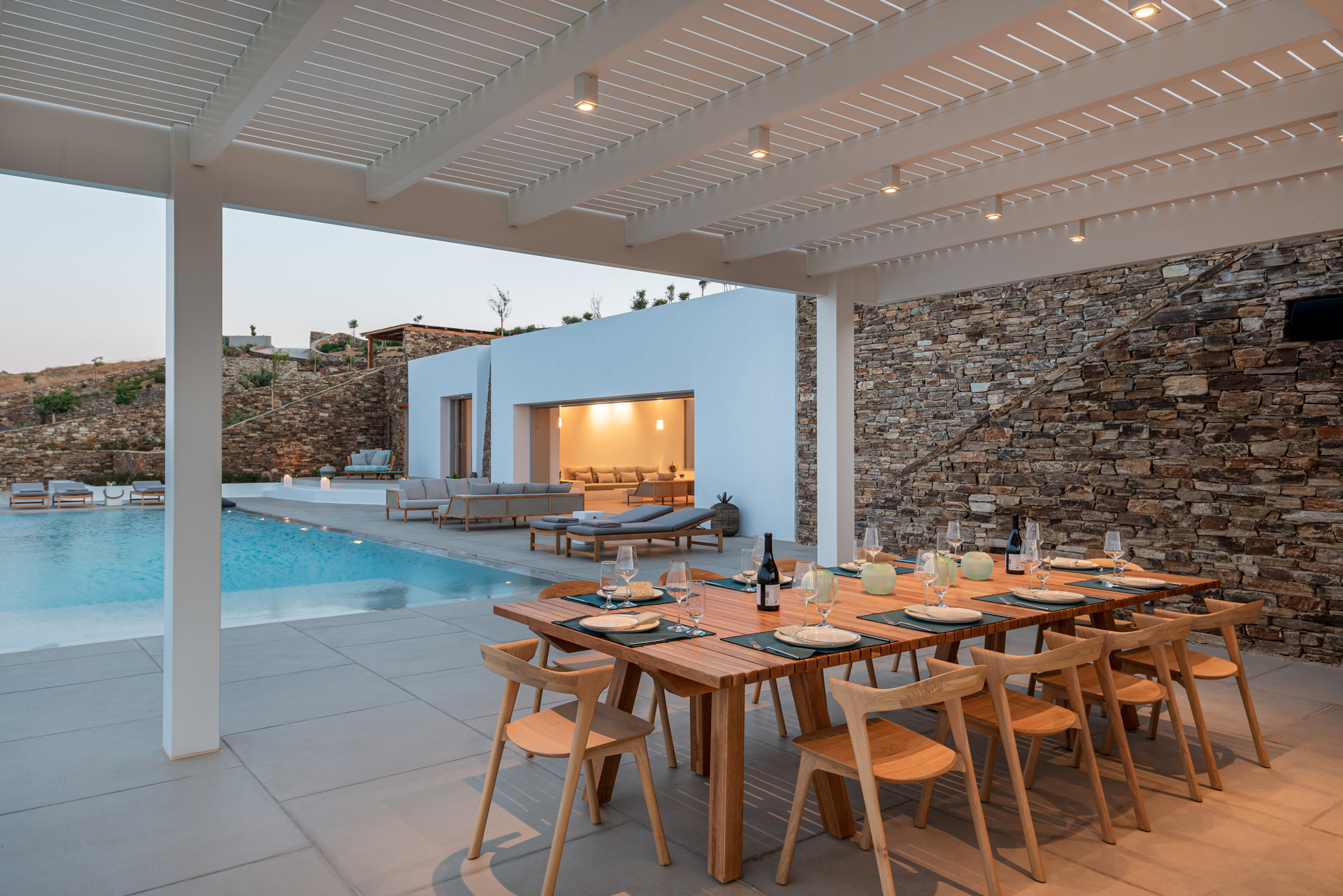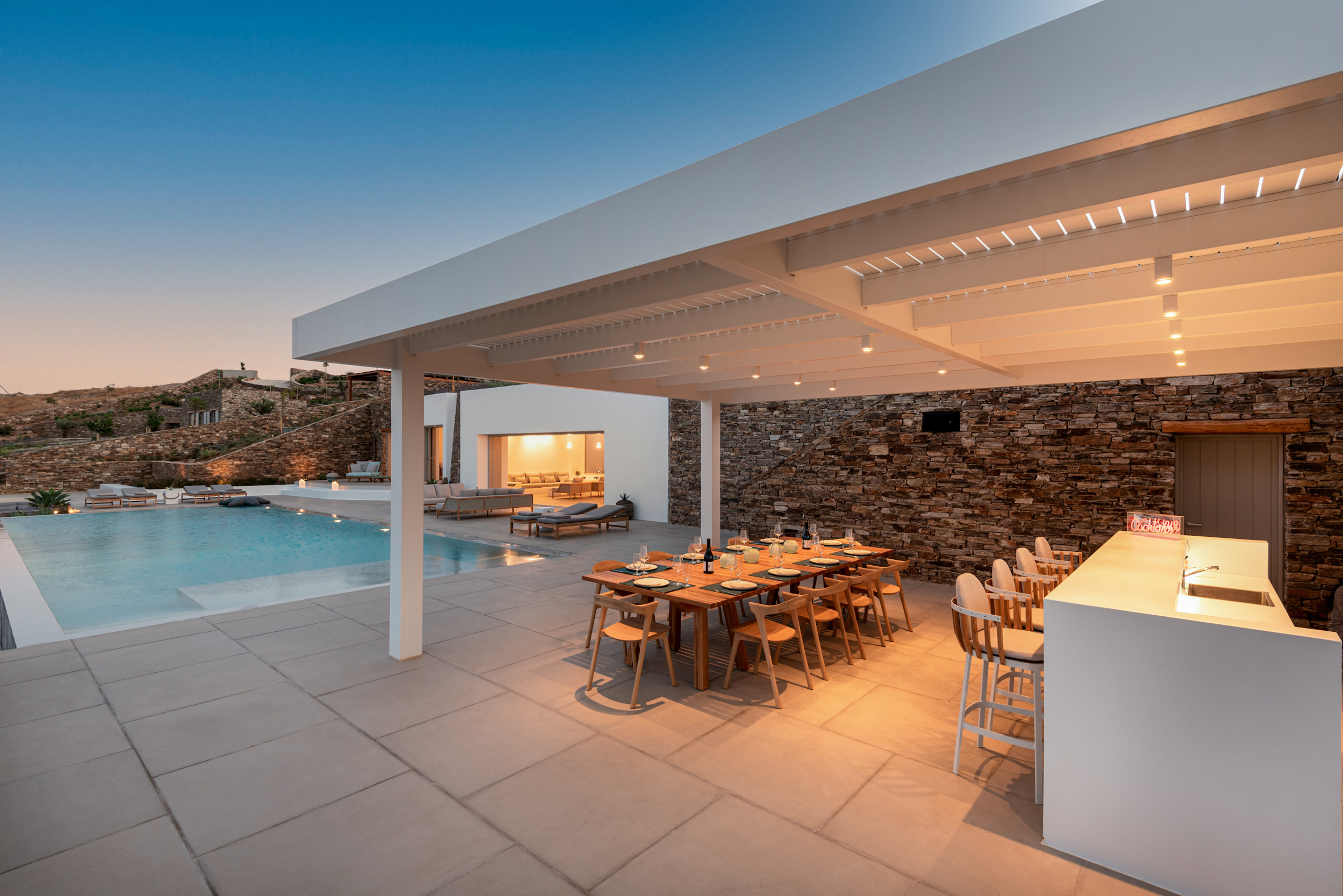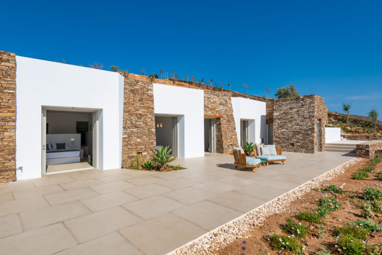 Anima’s architectural design intends to integrate the building into the natural environment with the use of local stone and the design of white volumes, as found in the traditional architecture of Cyclades.
