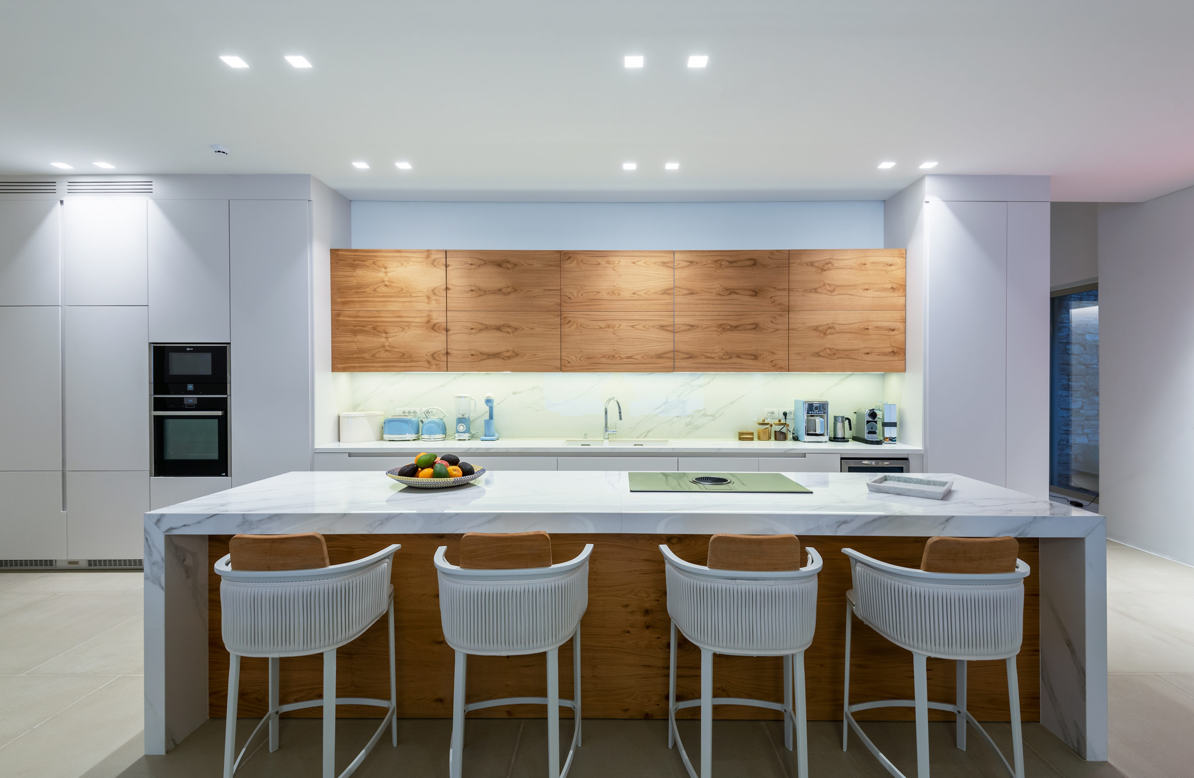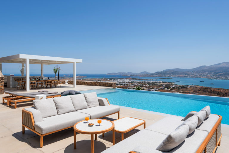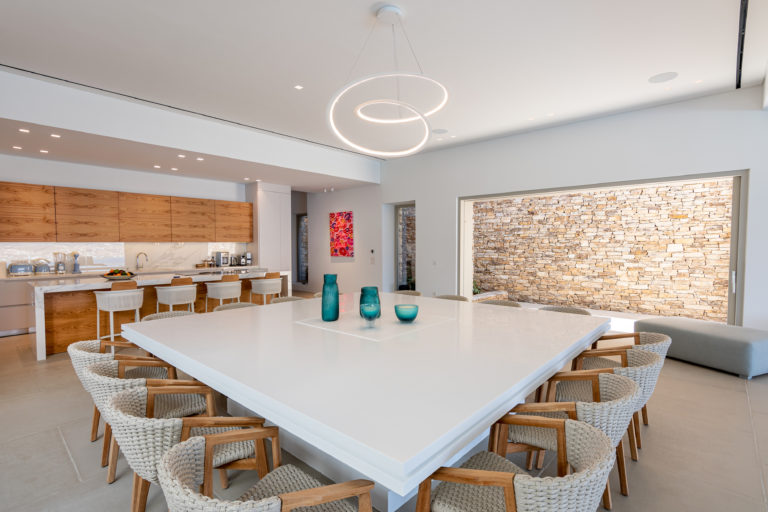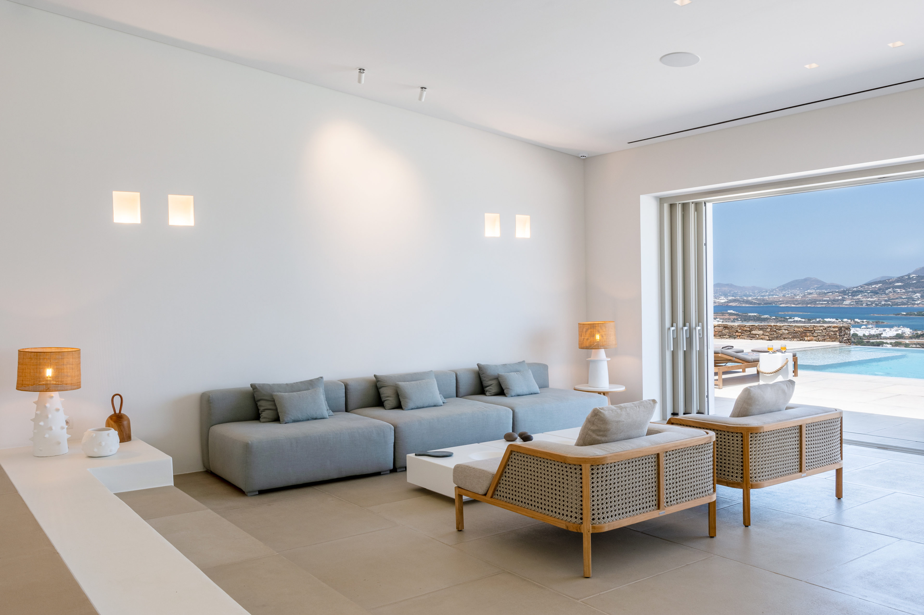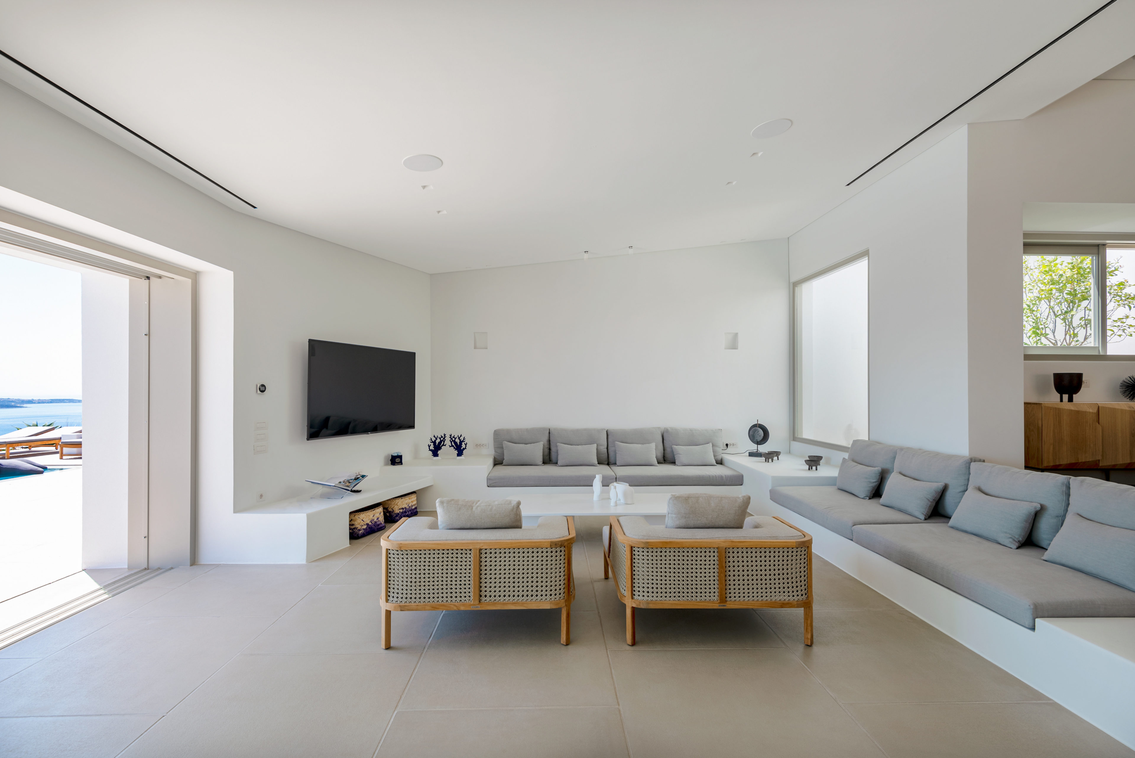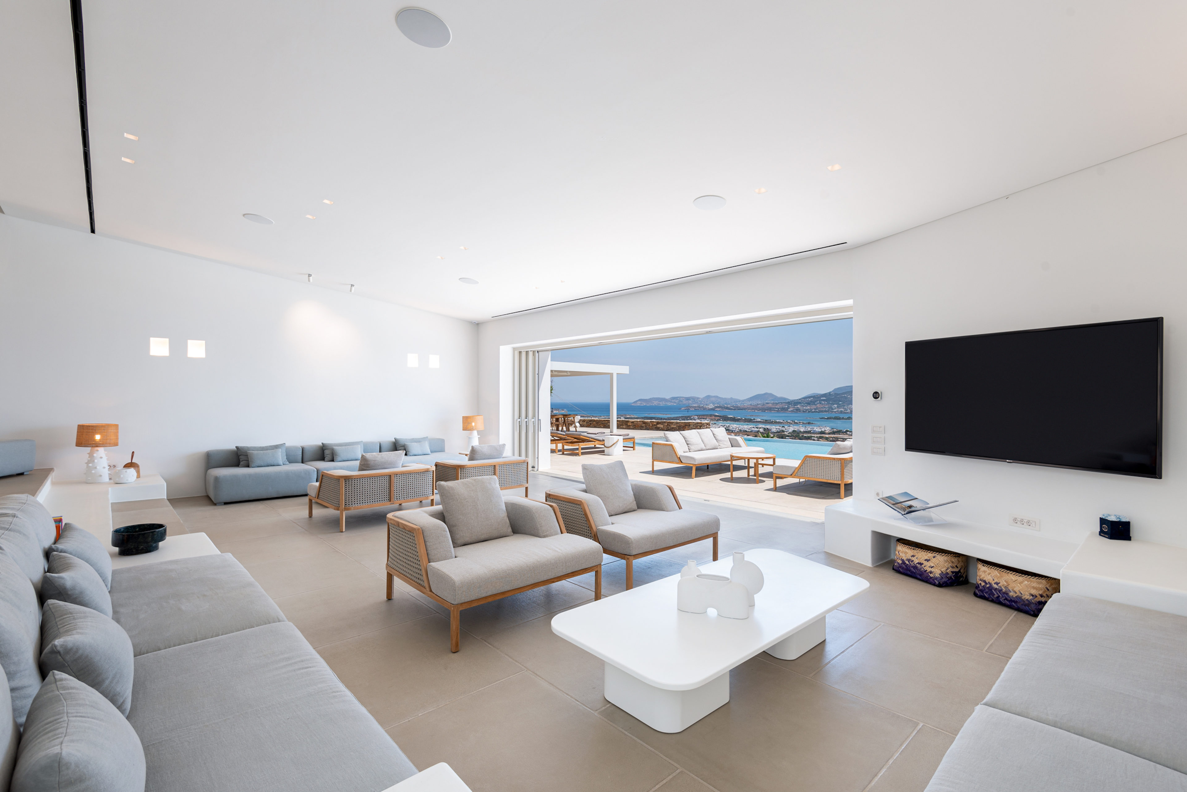 The living room of 150sqm boasts a fully unobstructed view of the sea and the island of Paros. It consists of the living area, dining area, the main open layout kitchen, one secondary kitchen and guest WC. Anima is spread on three levels featuring different common areas, facilities and number of bedrooms as below;