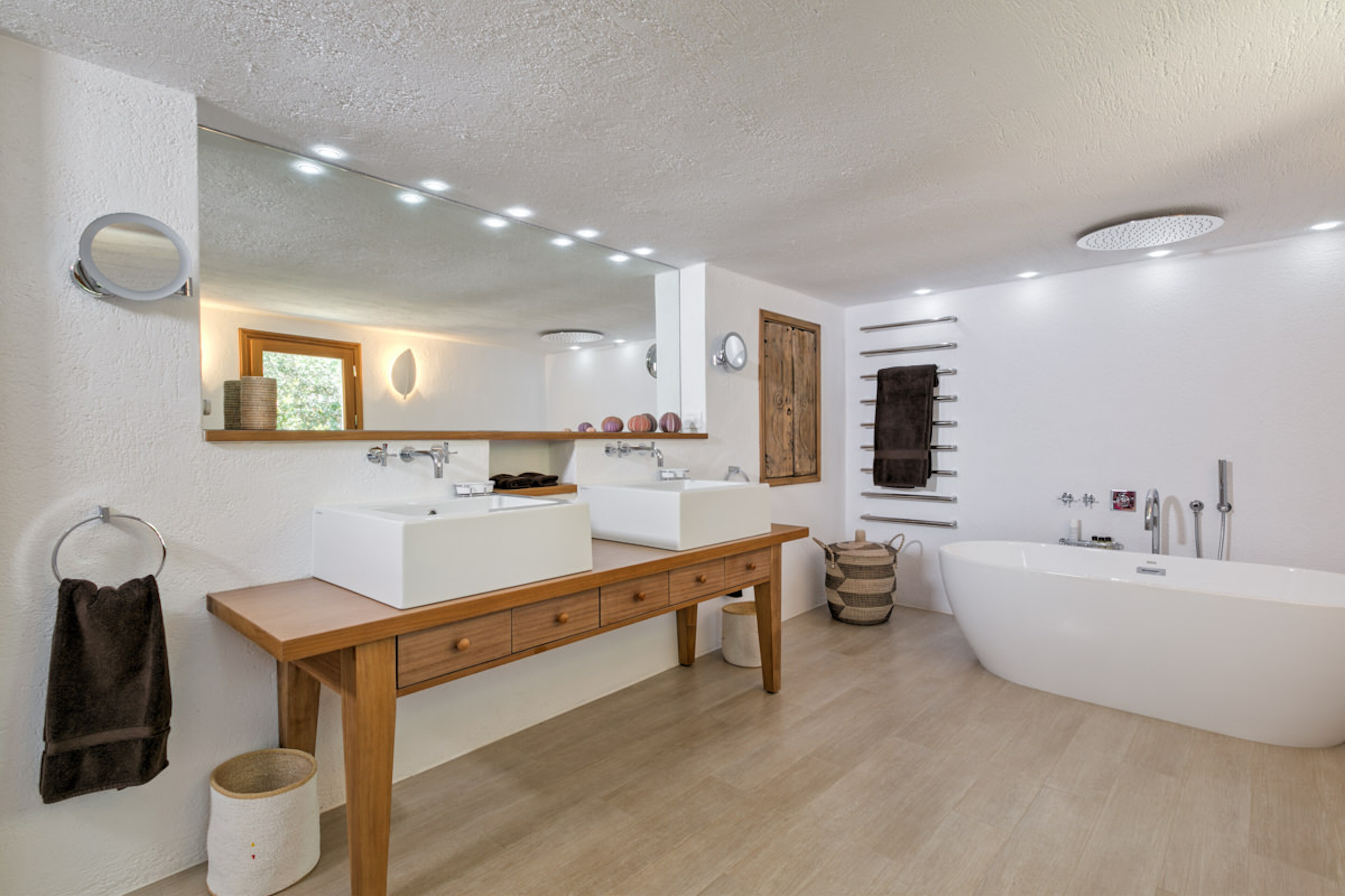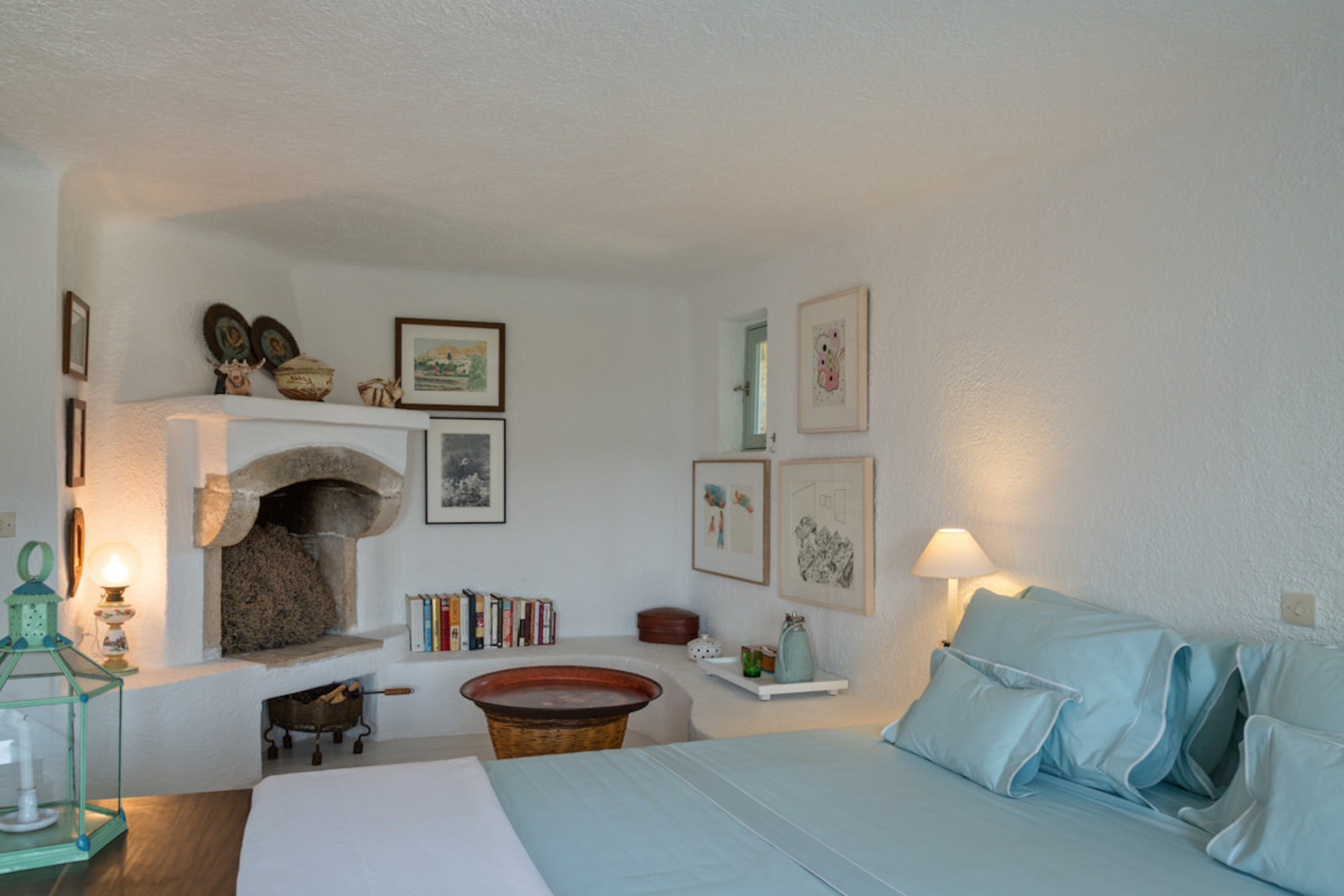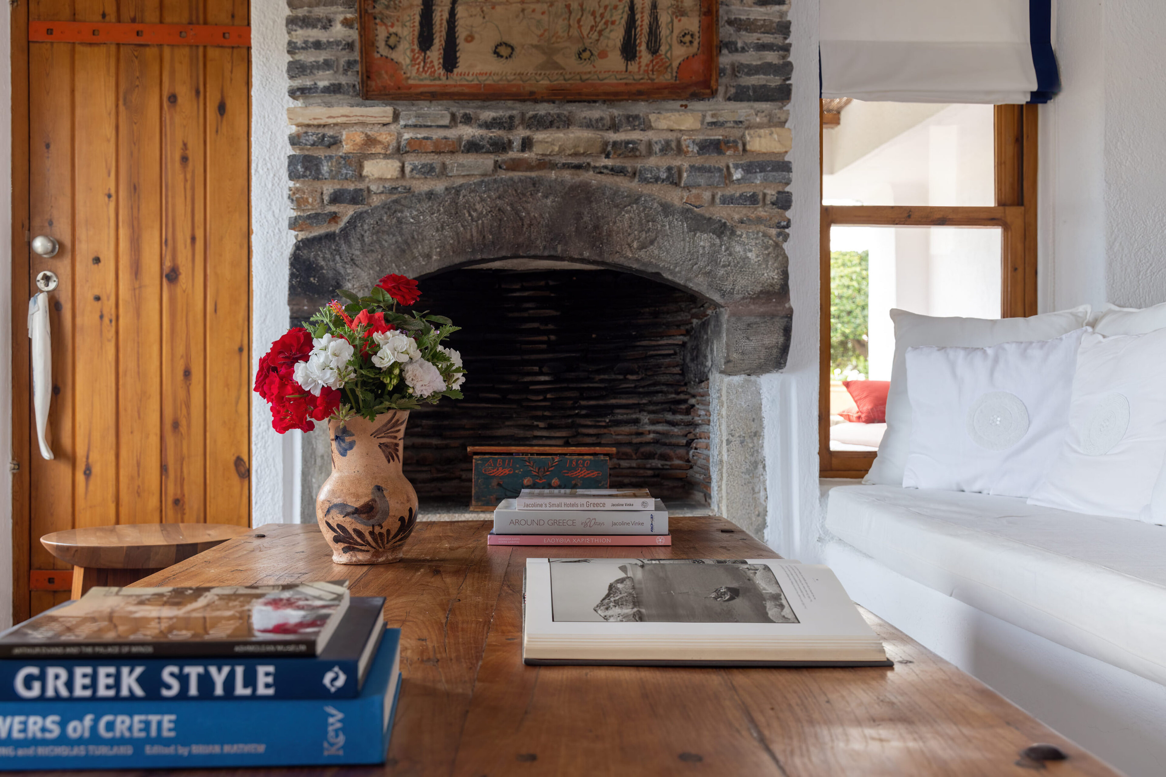 The villa’s interior is both elegant and cosy, with high, wooden-beamed ceilings and large windows that flood the space with natural light and panoramic views. The decor combines classic Cretan elements, such as stone fireplaces and rustic wood furniture, with modern touches for comfort. The stonework, whitewashed walls, and handpicked pottery create an atmosphere that is both warm and sophisticated.